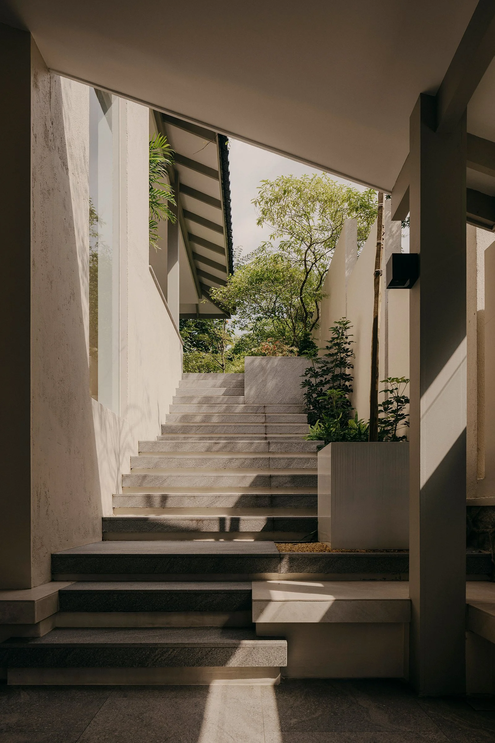 Spanning 6,000 square feet, the home is organised as a series of staggered levels that make transitions feel gradual, defined by changing perspectives, shifting ceiling heights, and moments of openness that connect the family to the outdoors.