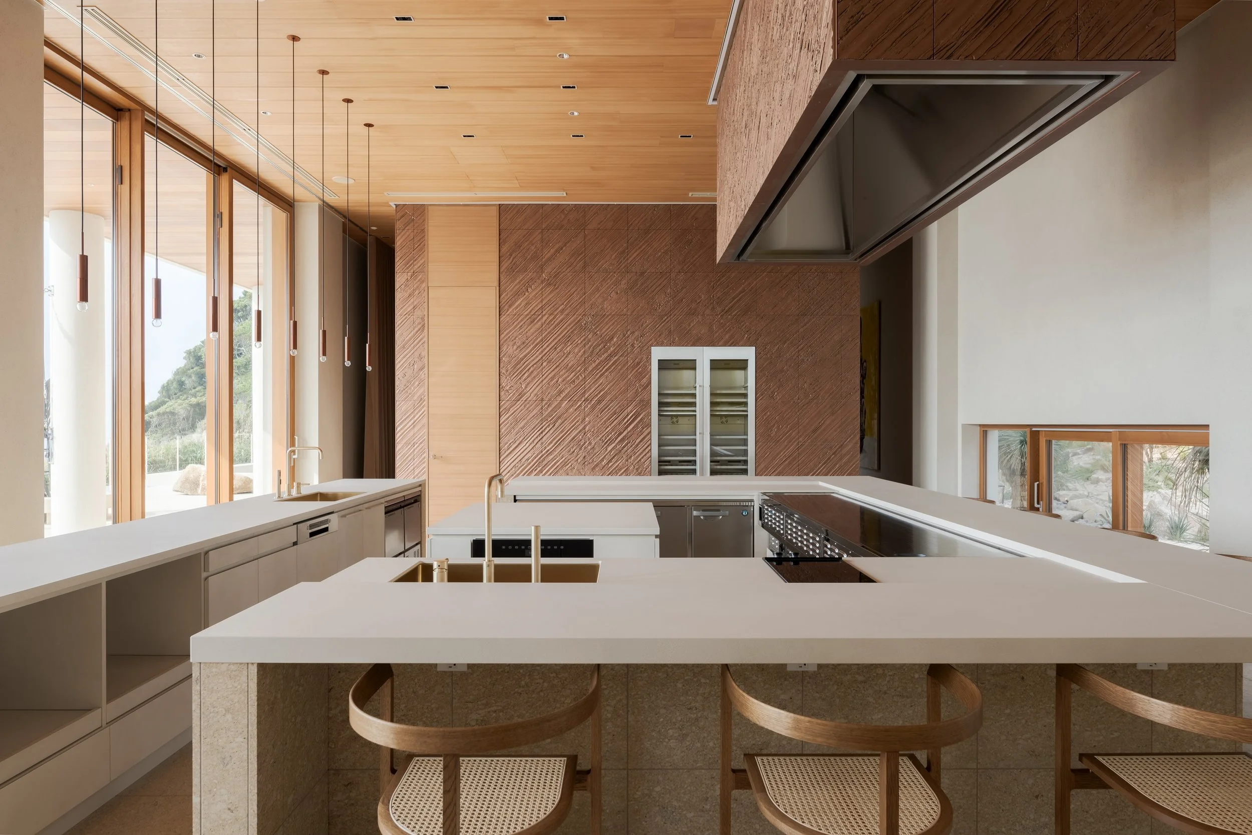 Inside, the plan opens to a voluminous, 6.2-metre-high salon furnished with low seating that drops the eye line toward the landscape. Slender round columns lend a classical poise to an interior otherwise anchored by contemporary pieces. On every side, timber screening modulates solar gain, sustaining an airy atmosphere and thermal comfort across long afternoons. At night, the ample glazing turns the pavilion into a gentle lantern for the community.