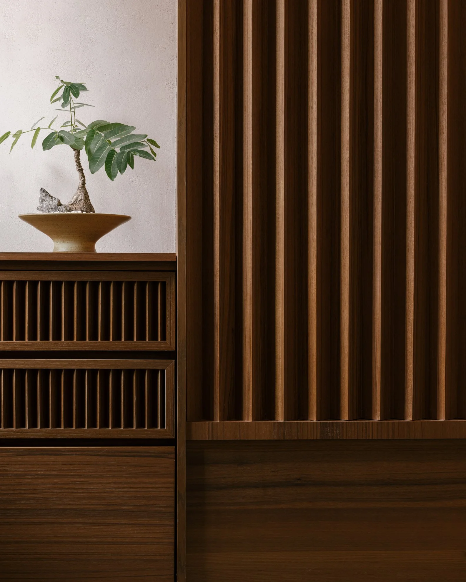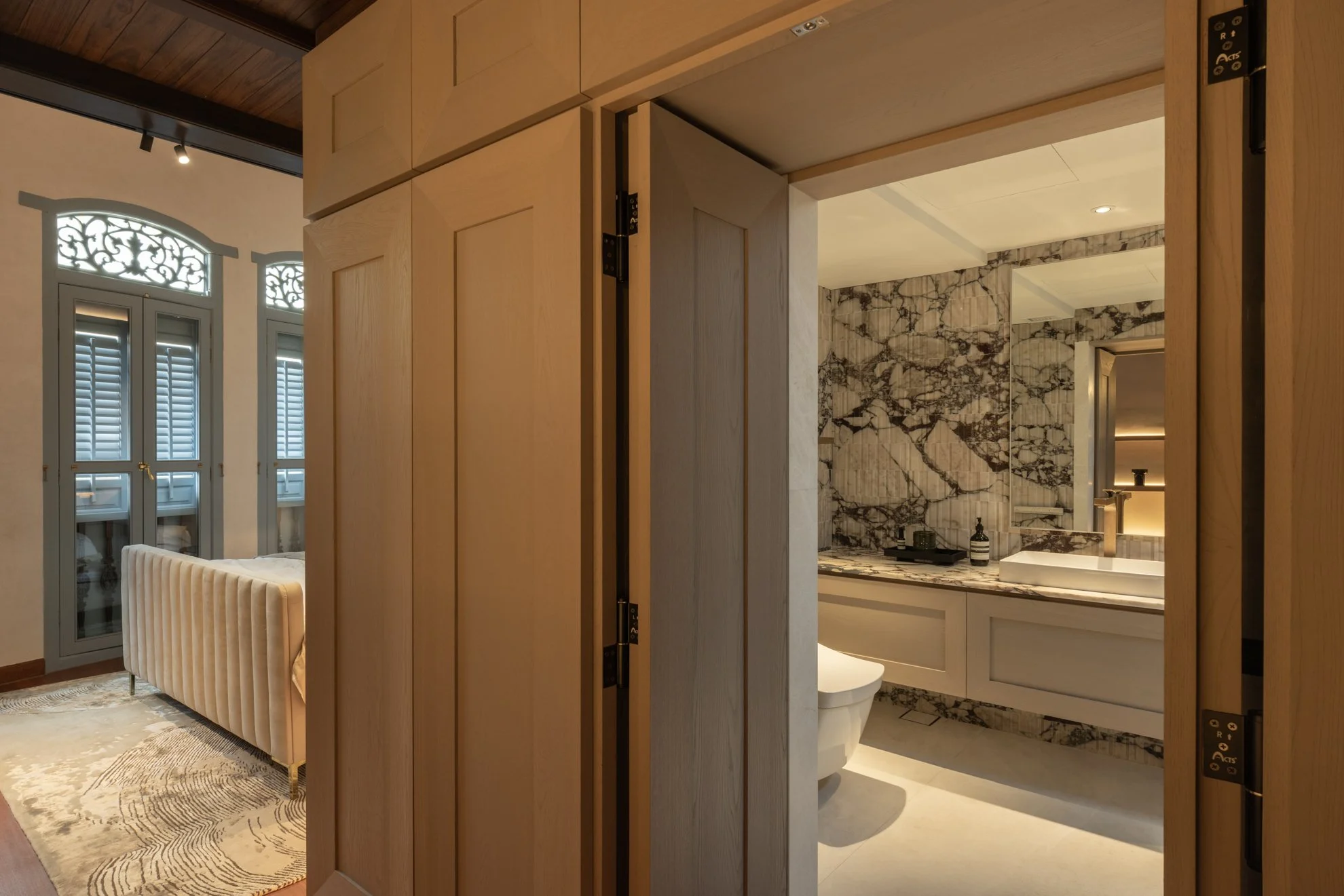 To further blur the line between inside and outside, the internal facades facing the airwells were custom-crafted to mirror the external timber casement windows, extending Peranakan fenestration motifs into the interior. In the master bedroom, teak veneered marquetry panels fronting the first airwell signal the head of the household, referencing traditional Peranakan ornamentation in a contemporary way.