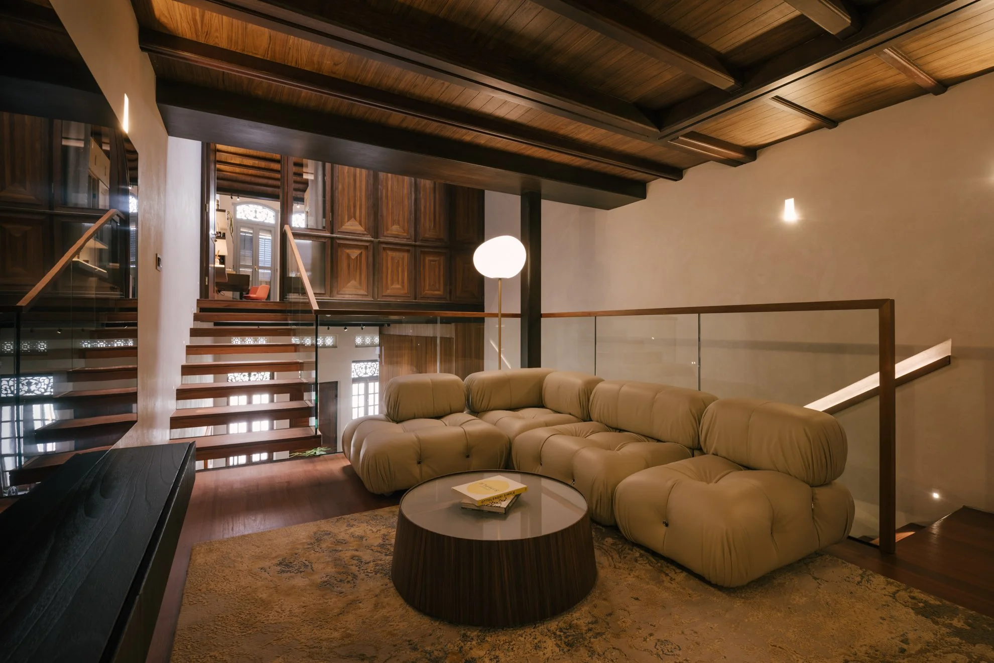 Working within URA conservation guidelines—which required the existing floor levels to be retained—Type0 Architecture proposed a bold typological shift. The conventional dog-legged staircase was removed and replaced with a continuous system of floating platforms aligned along the party walls. These enlarged landings form a series of communal mezzanines, transforming circulation into a shared experience. A family platform branches toward the master bedroom, while a study-playroom connects the children’s rooms, allowing daily routines to intersect naturally.