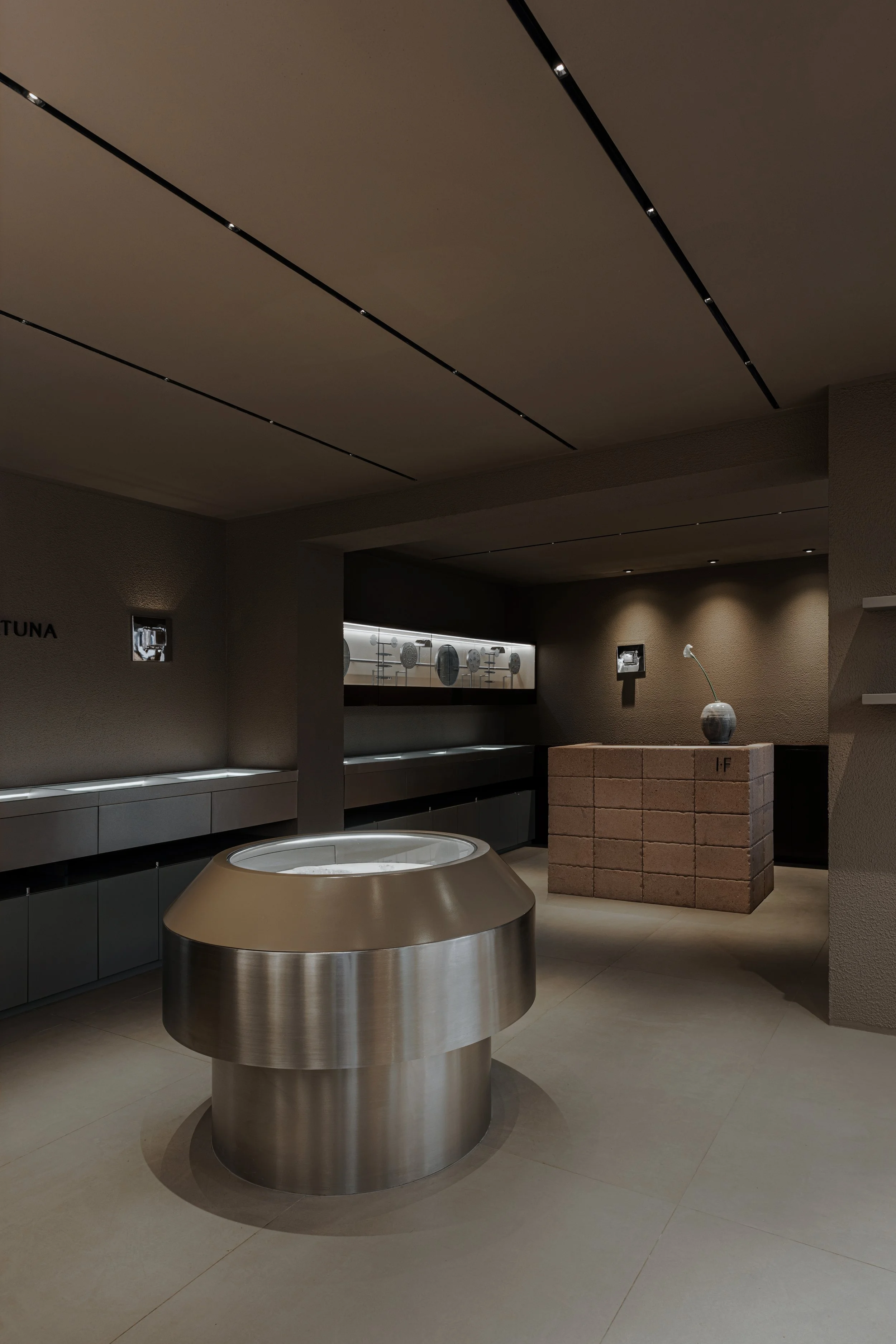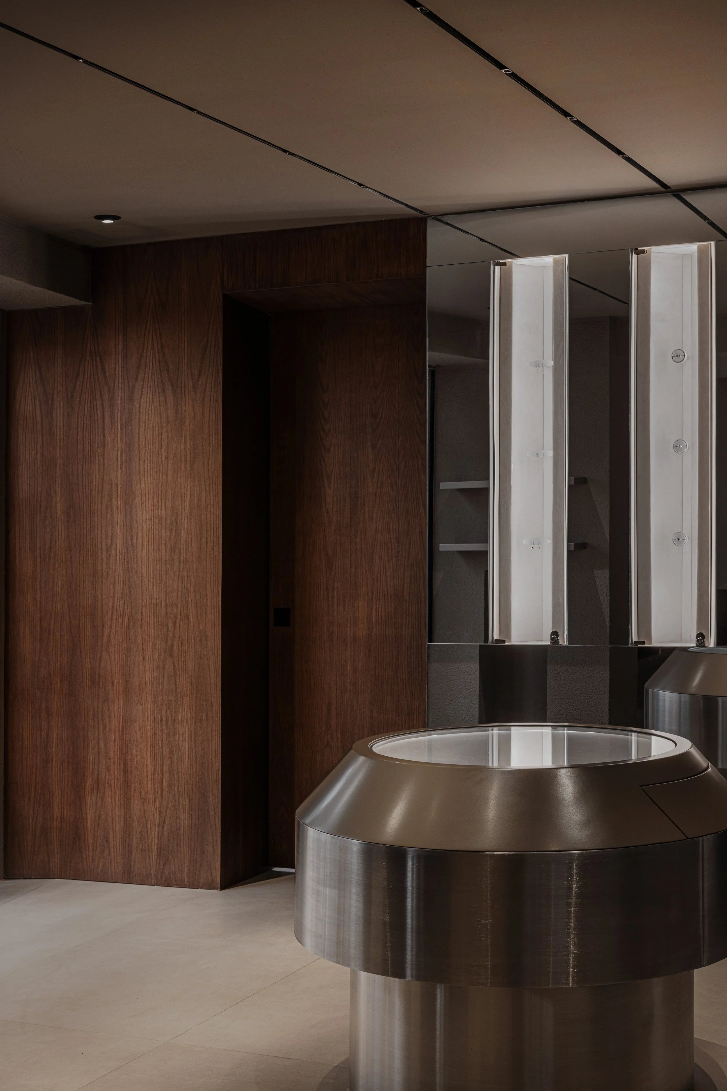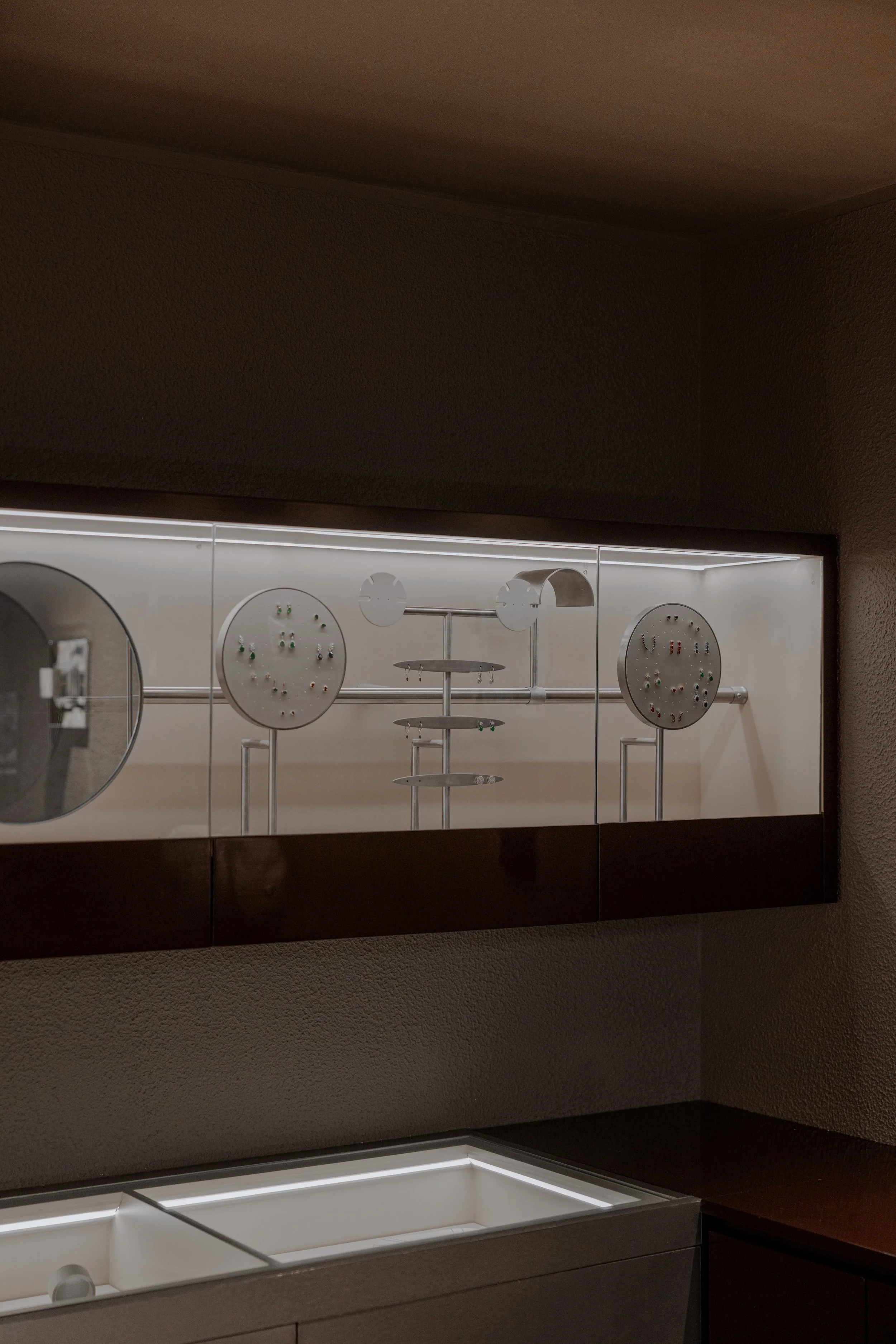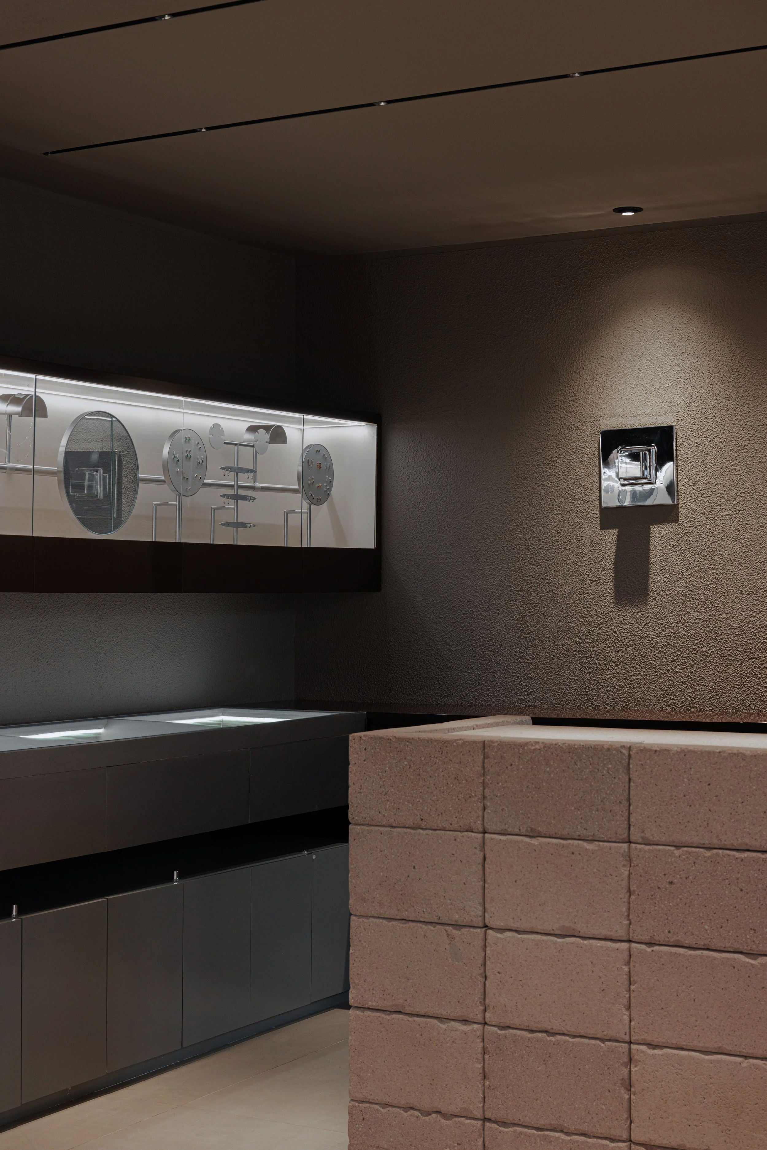 Light is treated as part of the architecture. Also designed by the studio, the illumination draws attention to texture, shadow, and reflection while guiding the visitor through the boutique. Each piece of jewelry is revealed gradually, as though emerging from darkness into focus. This careful control of light turns the act of viewing into a slower and more attentive encounter.