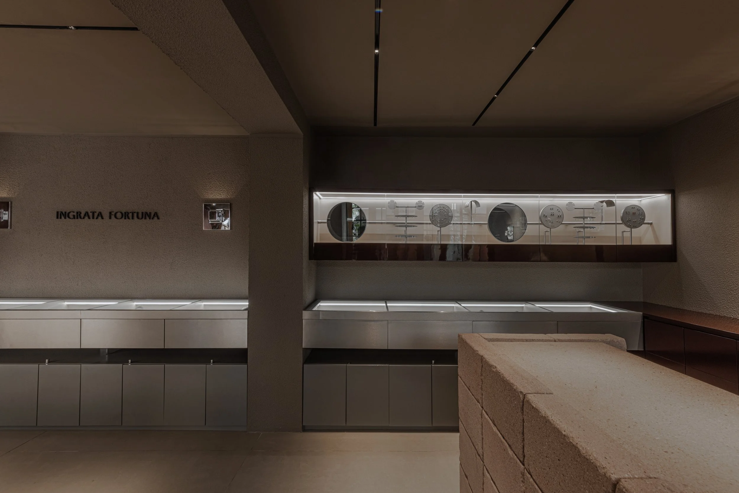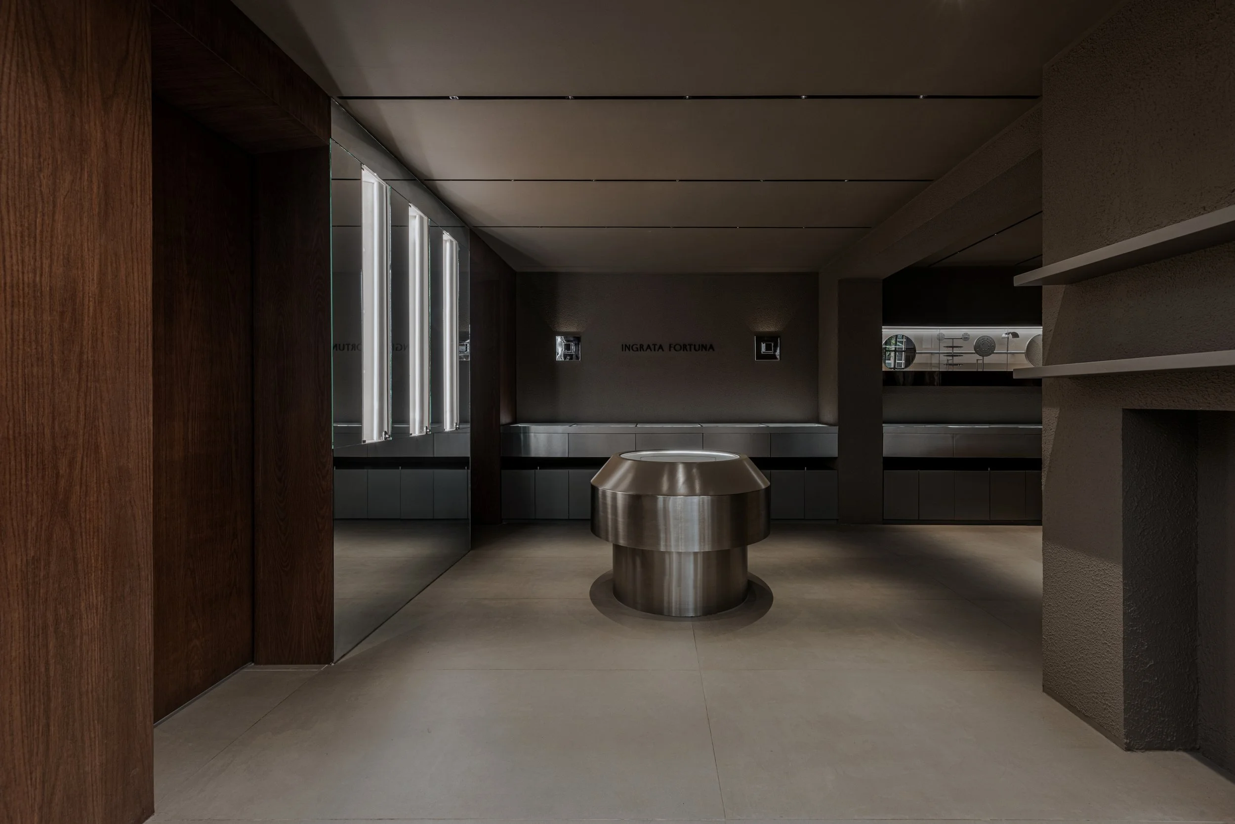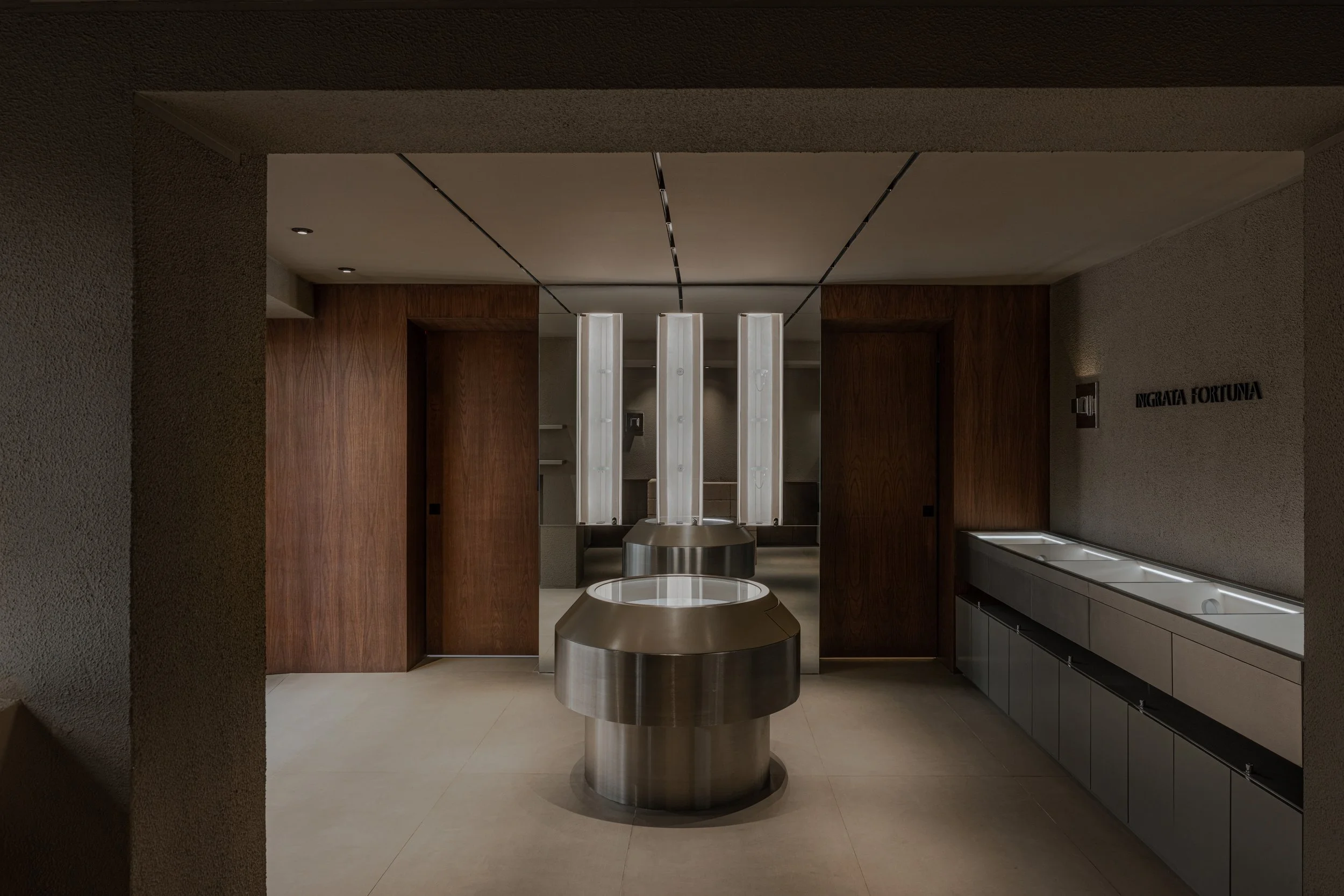 Light is treated as part of the architecture. Also designed by the studio, the illumination draws attention to texture, shadow, and reflection while guiding the visitor through the boutique. Each piece of jewelry is revealed gradually, as though emerging from darkness into focus. This careful control of light turns the act of viewing into a slower and more attentive encounter.
