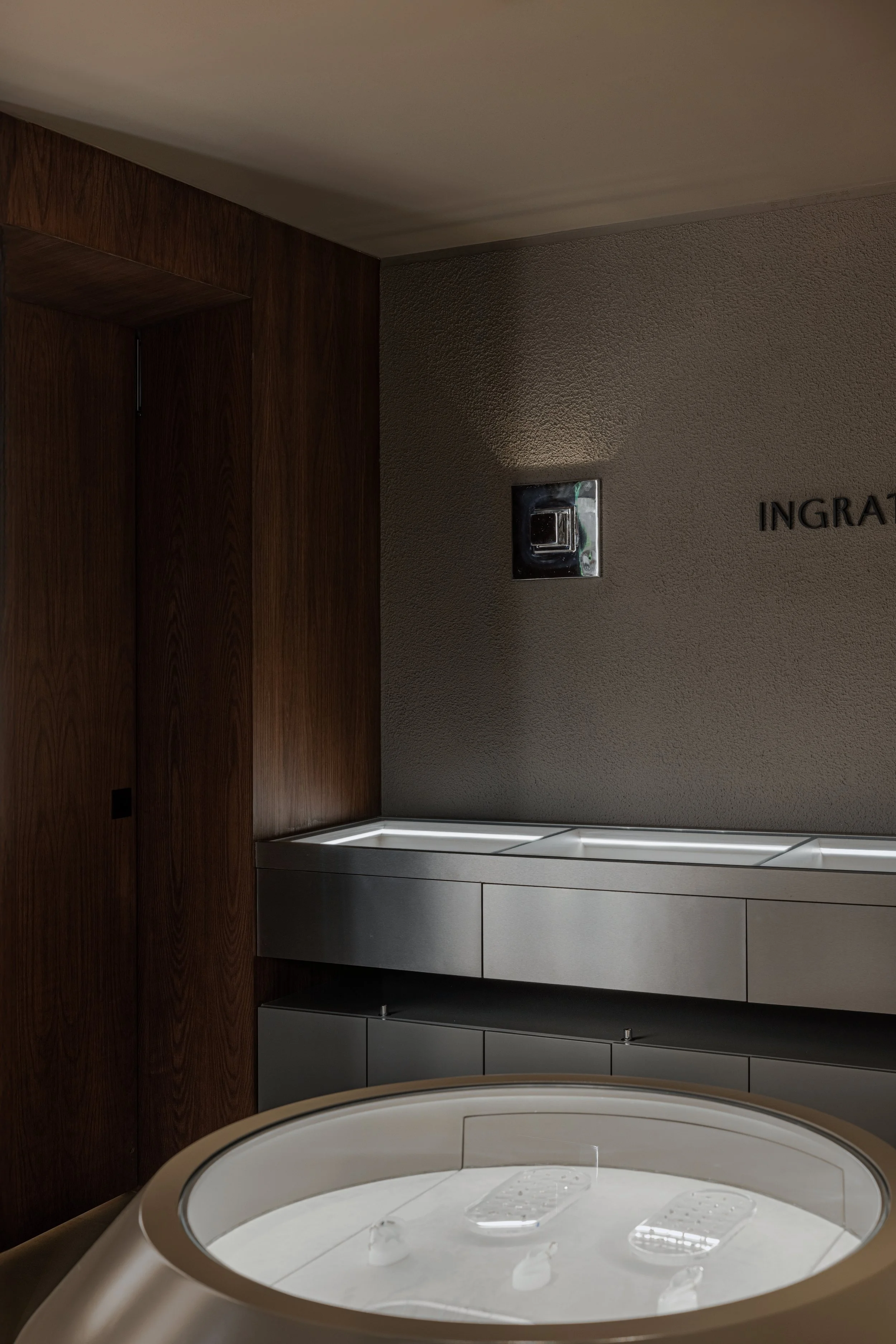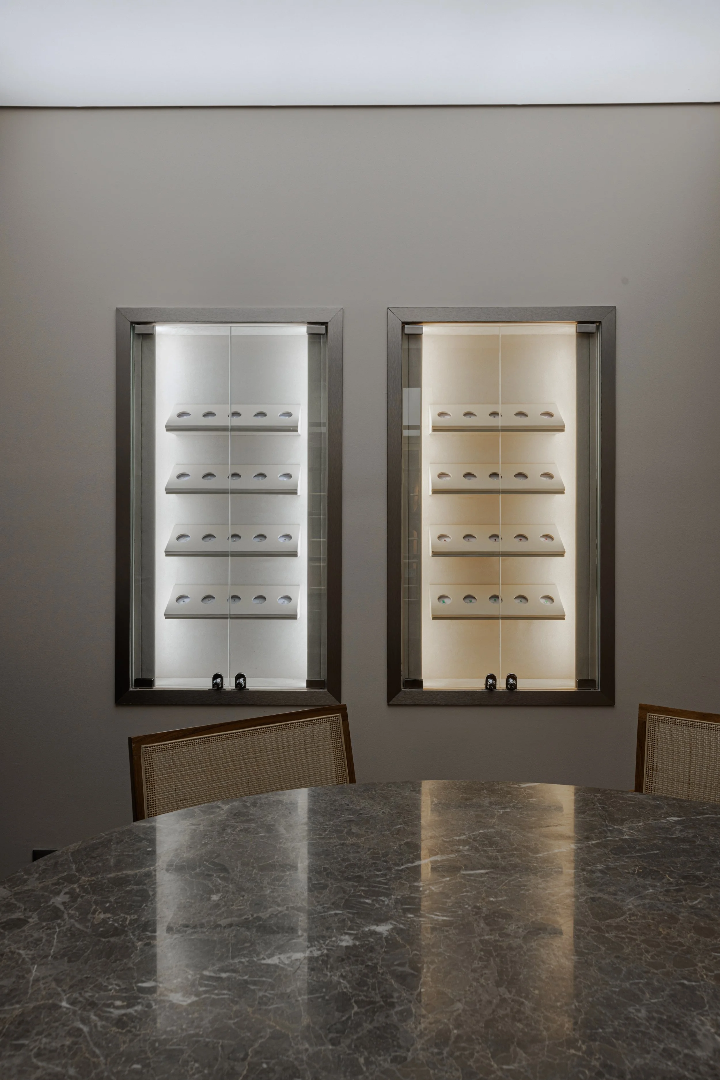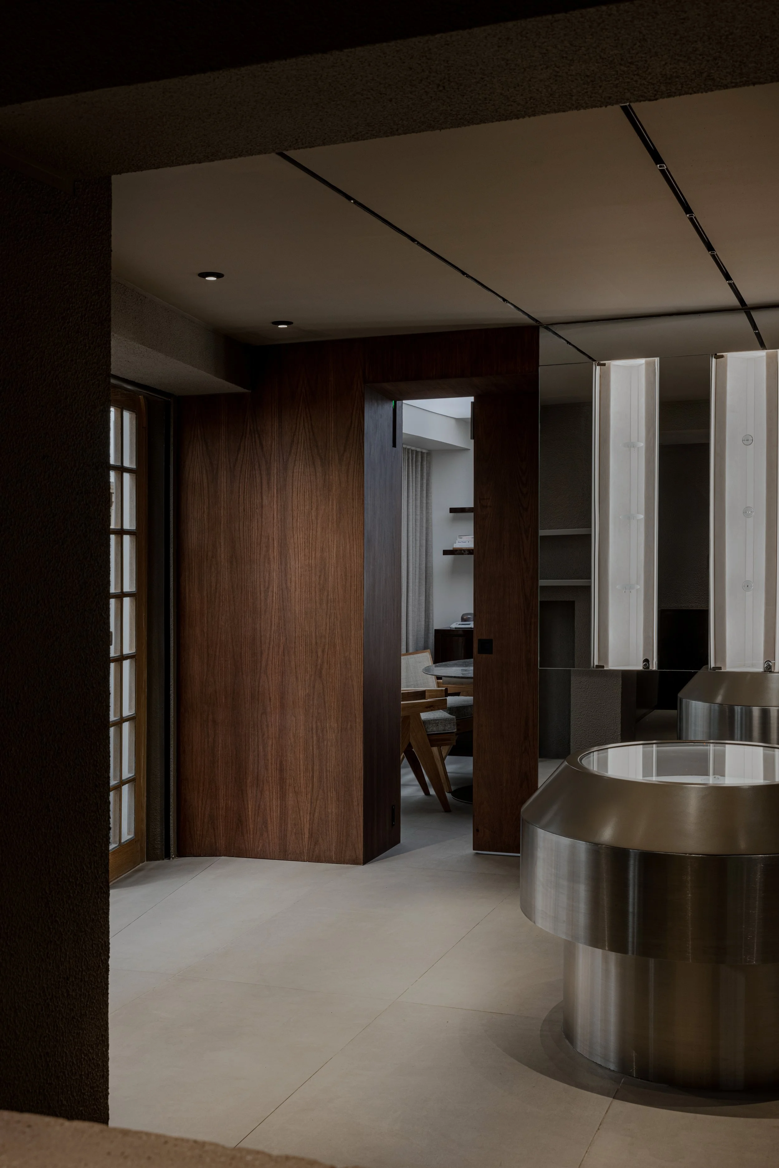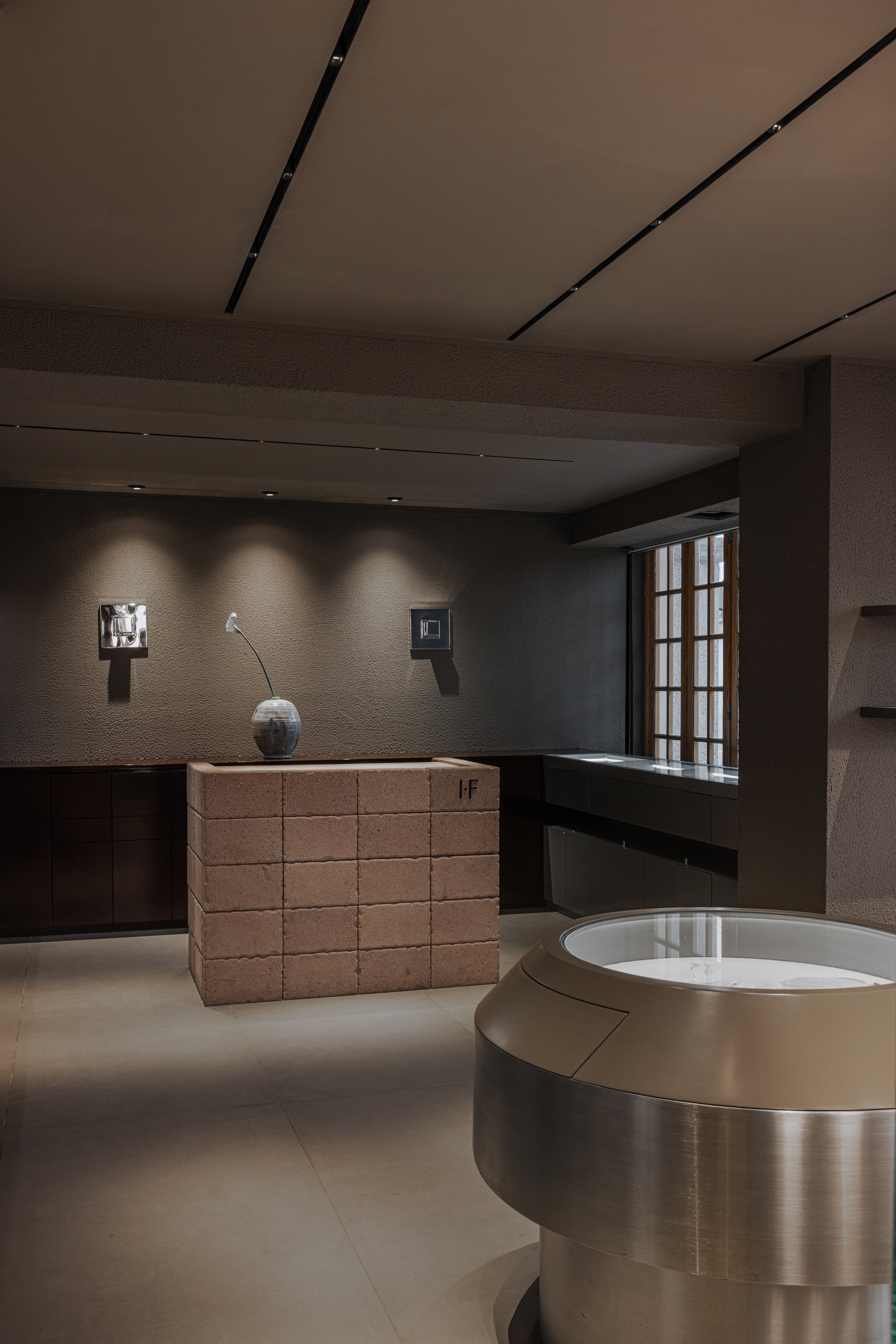 Light is treated as part of the architecture. Also designed by the studio, the illumination draws attention to texture, shadow, and reflection while guiding the visitor through the boutique. Each piece of jewelry is revealed gradually, as though emerging from darkness into focus. This careful control of light turns the act of viewing into a slower and more attentive encounter.