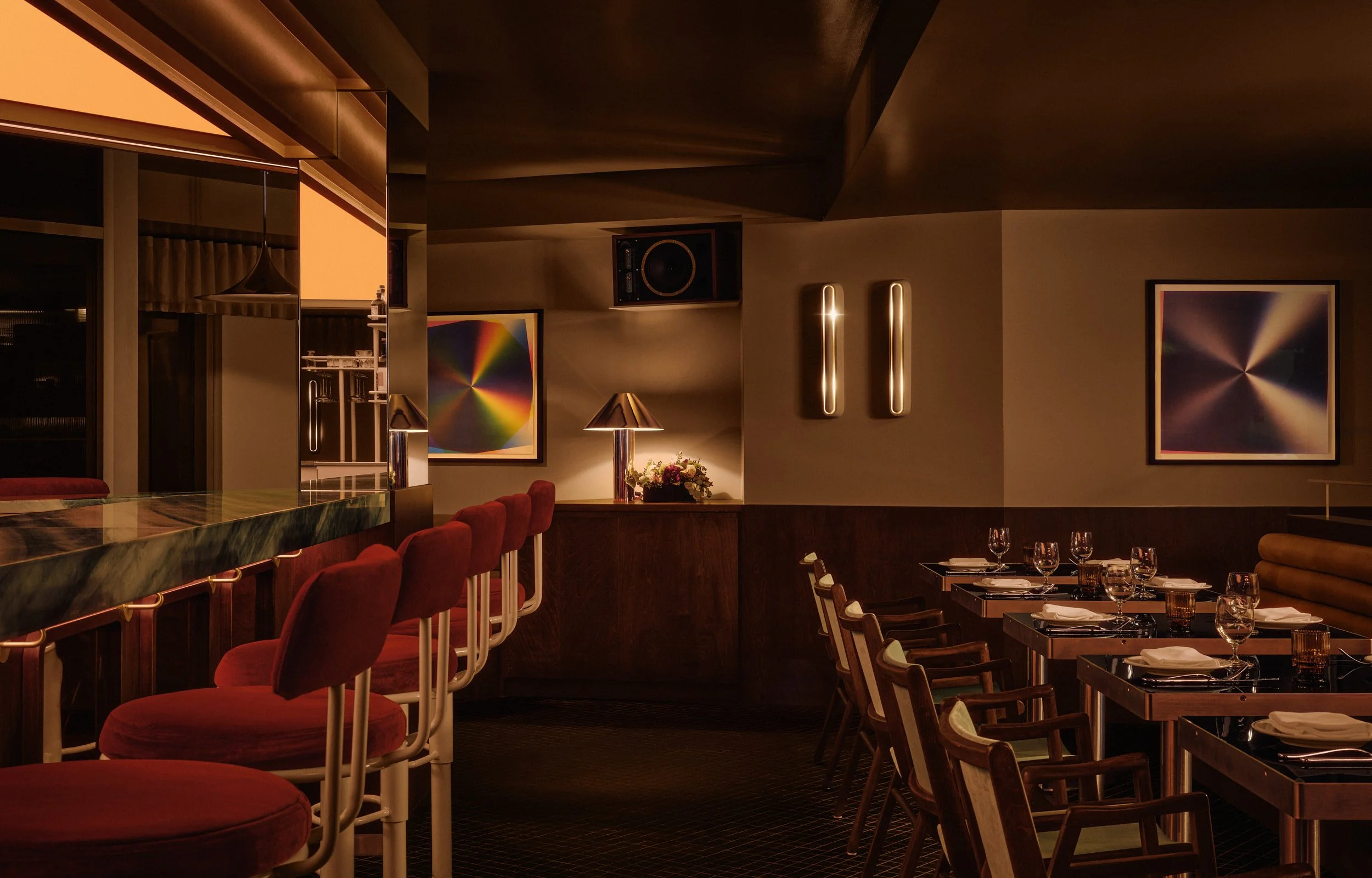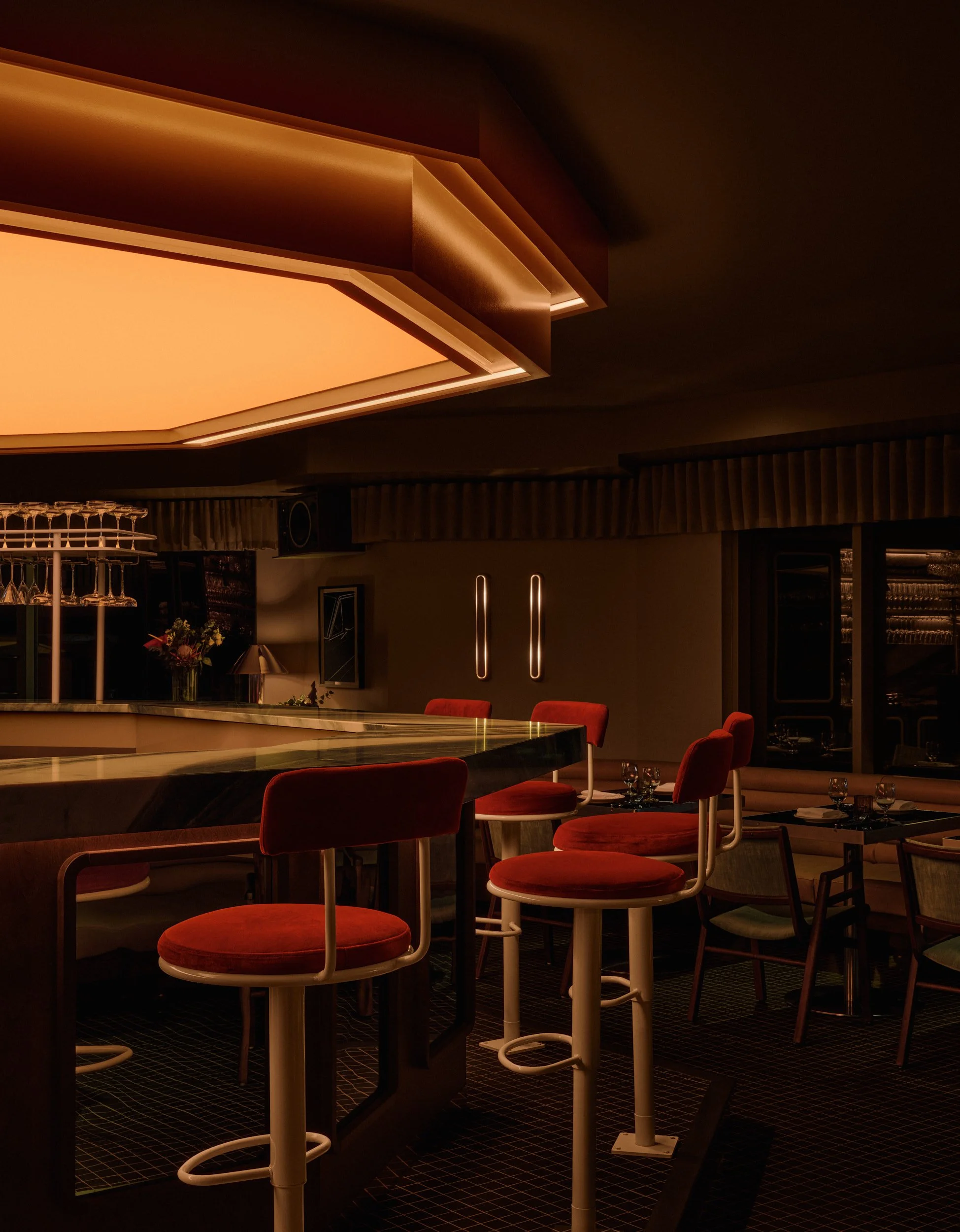 Above the bar, a sculptural diamond-shaped lightbox acts as the visual center of the room. Saturated in deep amber, it casts a cinematic glow that reads from the street and concentrates warmth at the core of the plan. Beneath it, the bar combines a wood front with golden mirror inserts and a green marble countertop. Fixed beige stools, upholstered in red velvet, add a deliberate jolt of color and plushness at the counter.