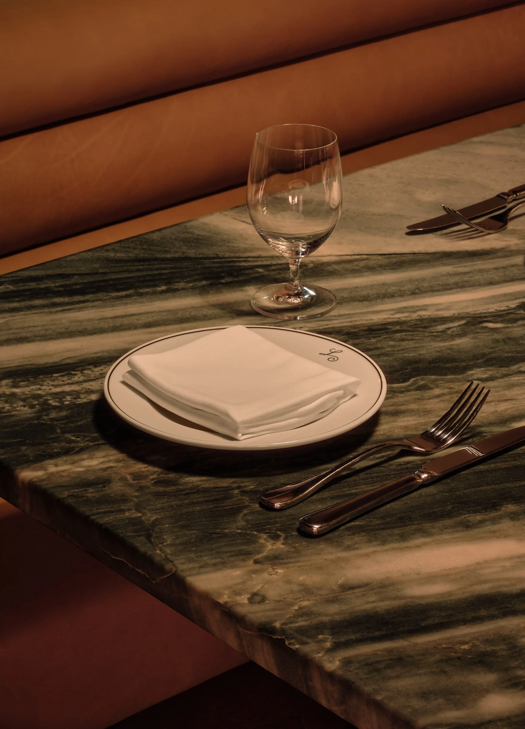 At 1,700 square feet, the restaurant is planned around a central bar that mirrors the building’s geometry and gives the space its organizational anchor. The kitchen sits discreetly at the back, allowing the dining room to read as a continuous loop. Along the perimeter glazing, a long line of leather banquettes traces the edges of the plan, threading between the windows and the bar volume to create an immersive, softly guided circulation path. Arrival is deliberately theatrical: a glazed vestibule in smoked glass, finished with heavy velvet curtains, shifts the atmosphere immediately toward something darker and more intimate.