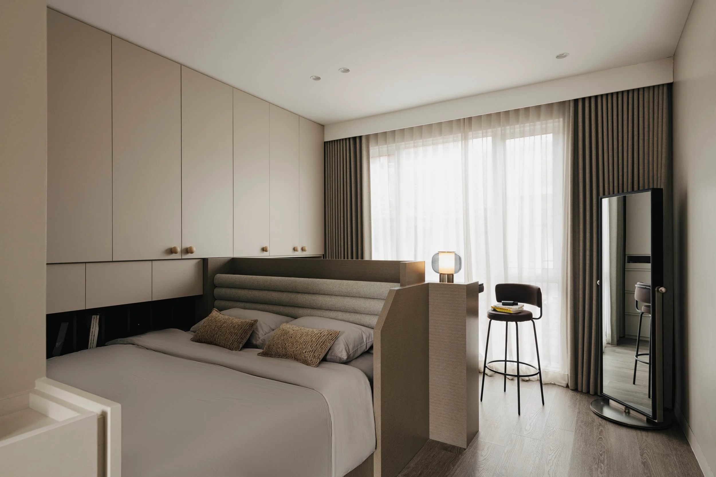 Throughout, the renovation explores tactility through honest materials. Natural veneer surfaces line cabinetry and walls, eschewing gloss in favour of matte finishes that feel grounded and calm. The subdued palette is coupled with soft spatial transitions, lending a quiet vitality to each room. Circulation patterns were reconfigured to be more intuitive, supporting a slower, more deliberate pace of life.