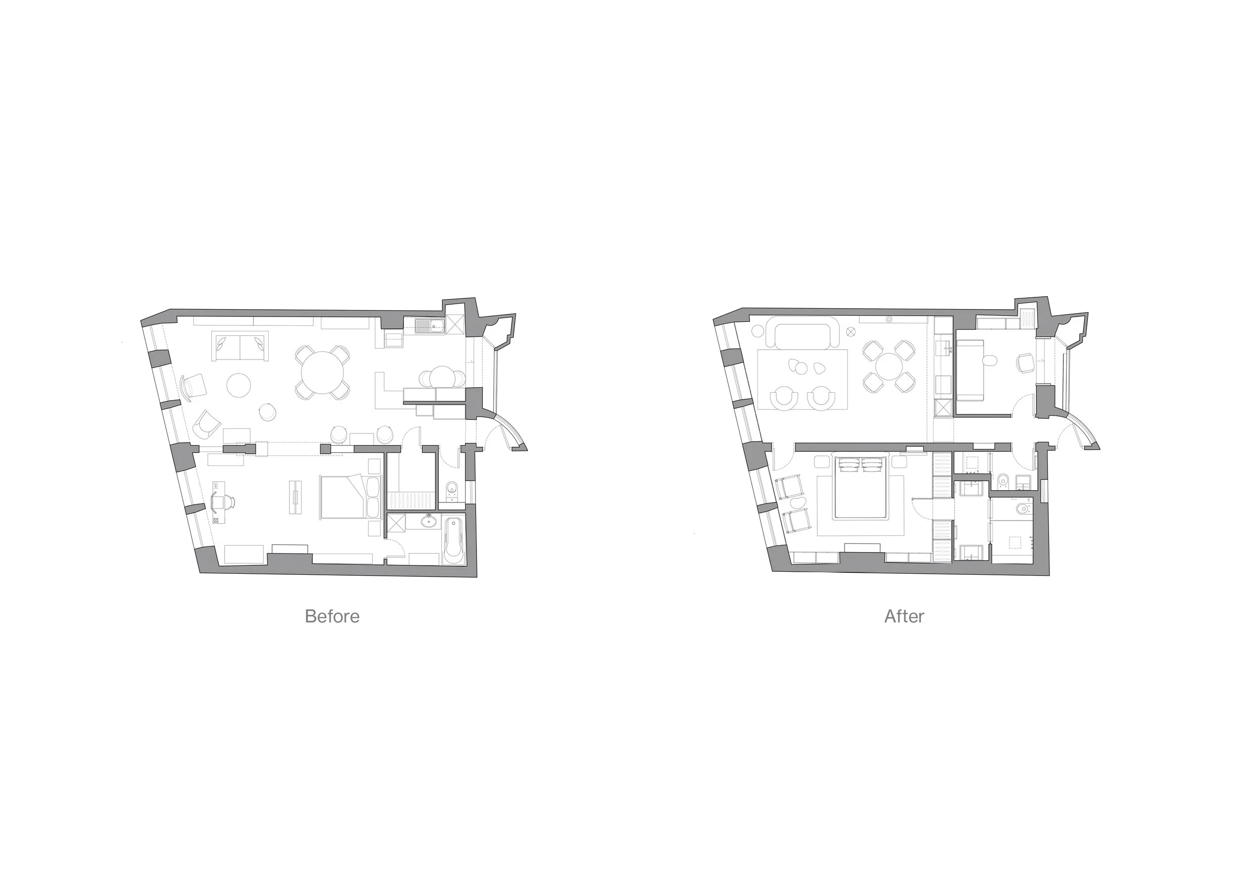 Occupying 74 square metres, the apartment had previously lost its original character after a load-bearing wall was removed decades earlier, collapsing the plan into a single studio. The project set out to reassert the clarity of the original volumes while accommodating contemporary living needs, all within the constraint of notably low ceiling heights. Rather than treating this limitation as a compromise, the renovation responds with precision and restraint.
