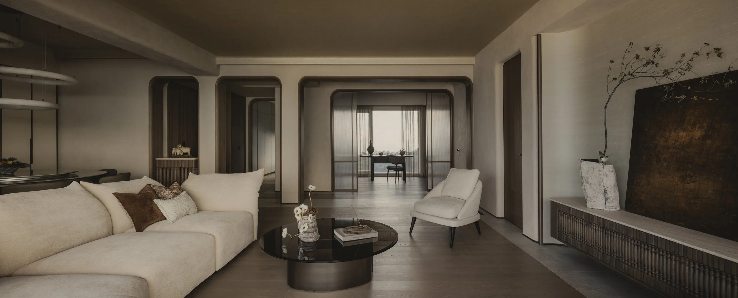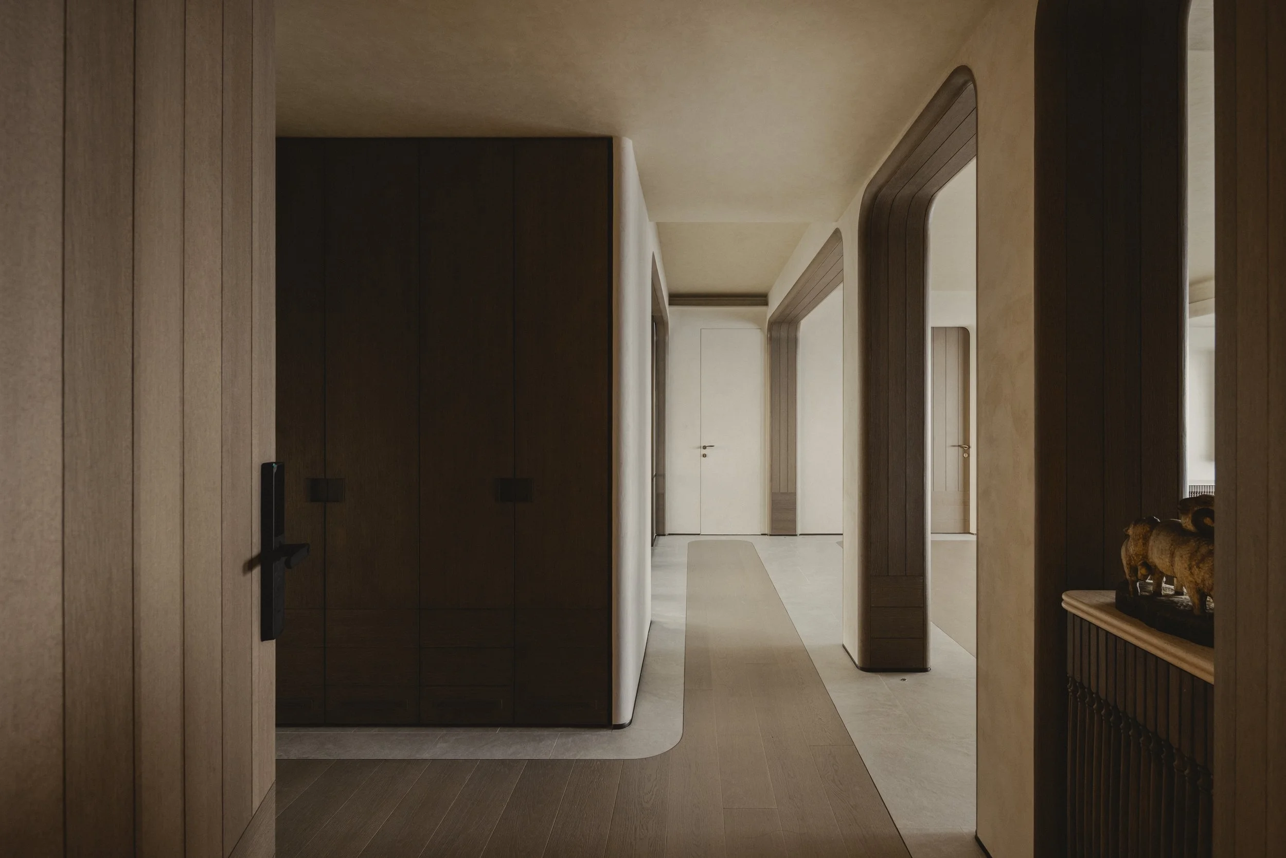 Arrival is orchestrated from the side: a first encounter with gridded timber screens concealing doors to function rooms, mah-jong rooms, a snooker room, and ancillary amenities. Along the walkway, softly lit curved walls introduce a sense of movement. At the vista’s end, twin organic sculptures and an artful pendant gather the material language into a quiet moment of focus.