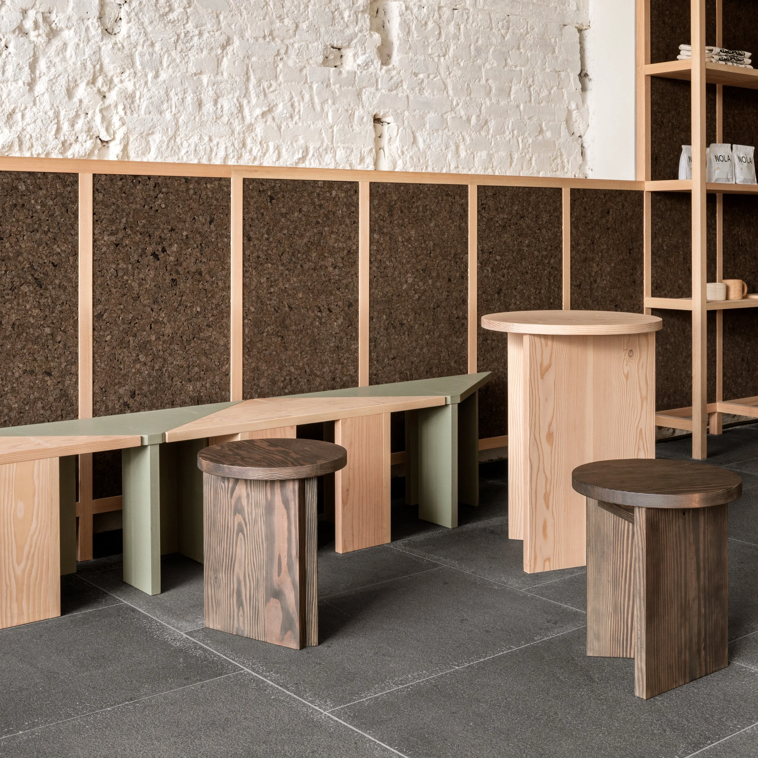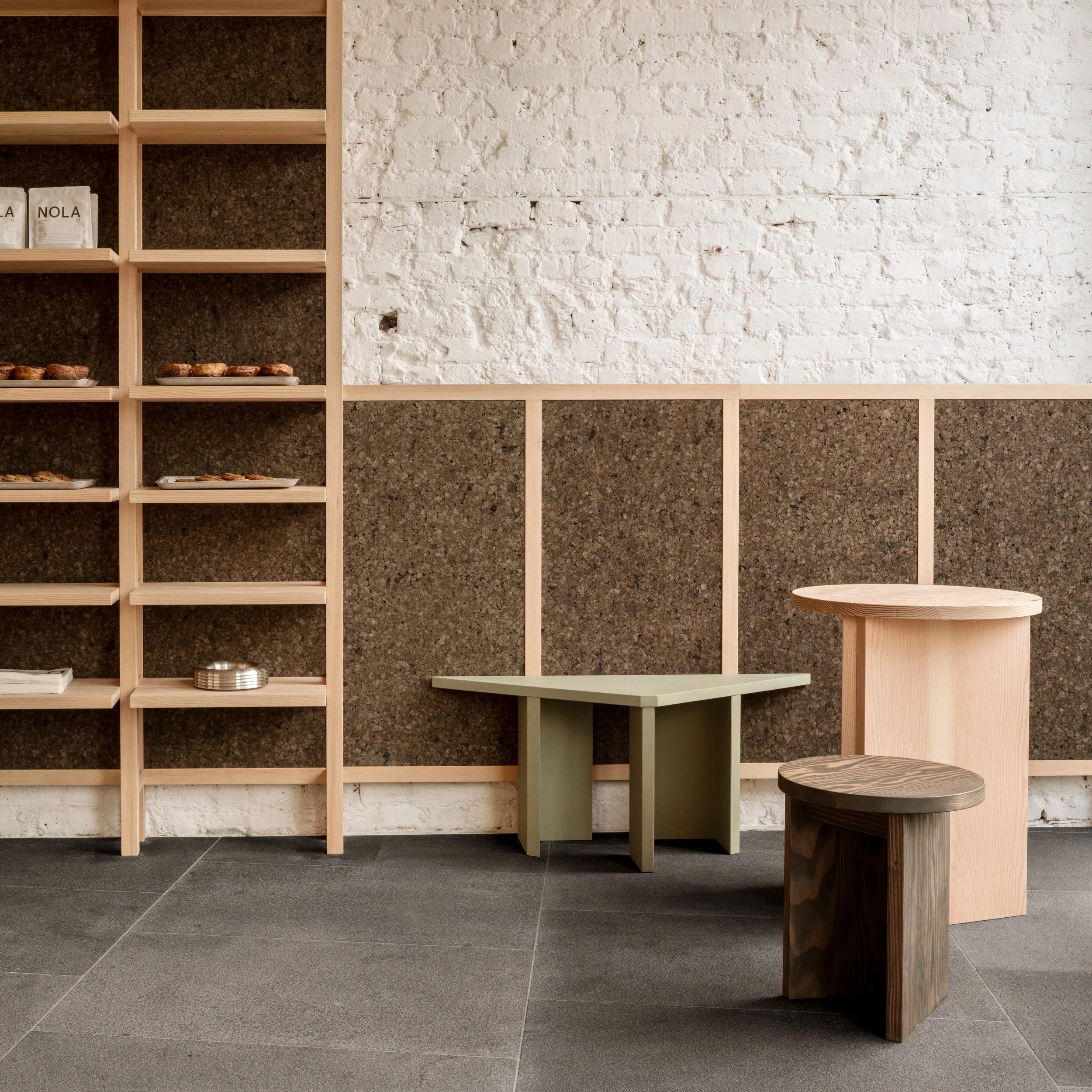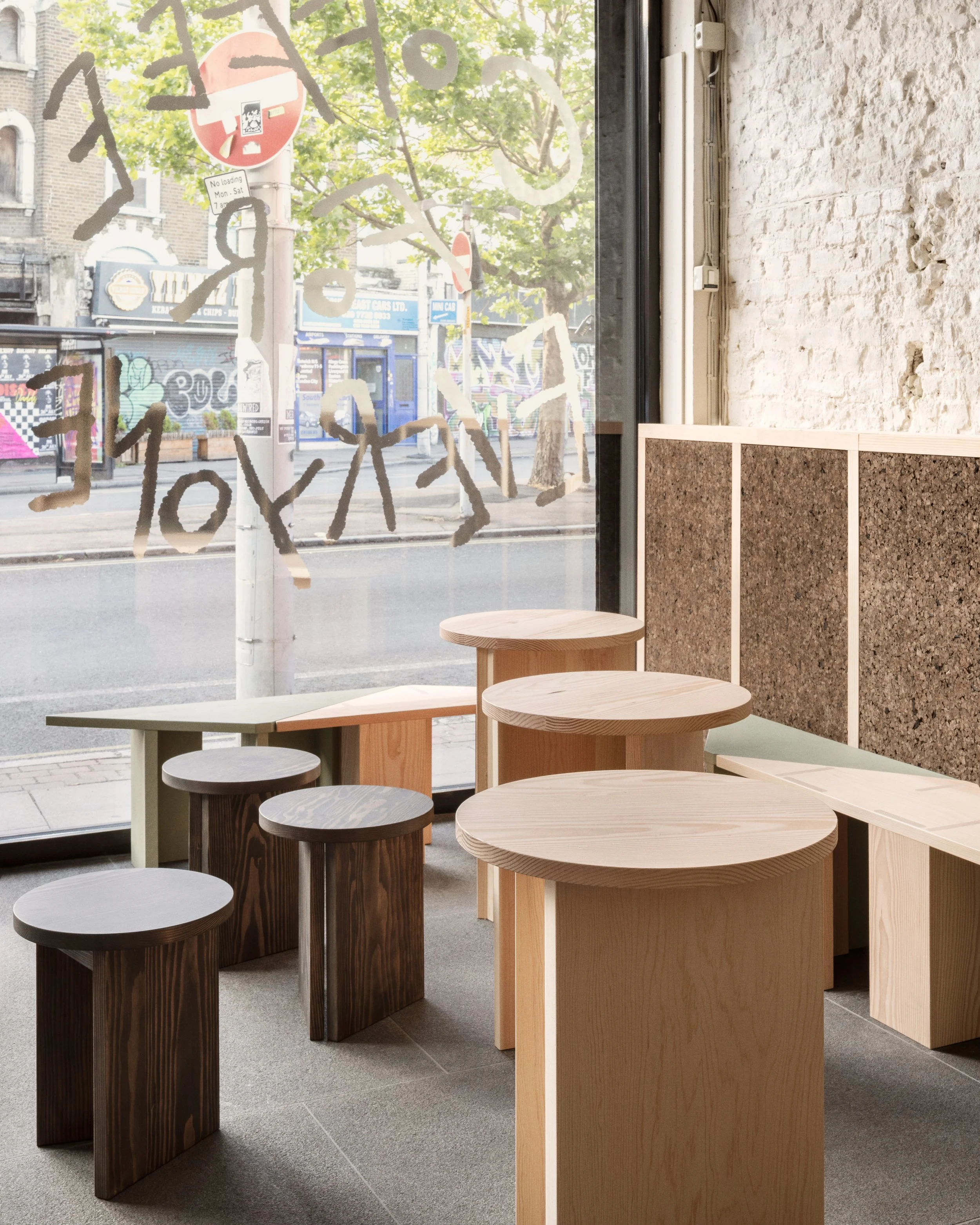 The concept responds to the character of Rye Lane—a setting shaped by movement, exchange and a constant flow of people. Within this context, the café embraces the humour, diversity and energy that define Peckham, while introducing a distinct layer of coffee culture rooted in warmth and connection. Low, modular seating lines the front of the shop to invite passers-by inward, transitioning to taller bar elements and shelving toward the back. Subtle references to the letters N, O, L and A are embedded throughout the furniture geometries, creating a playful continuity between the café’s identity and its interior elements.