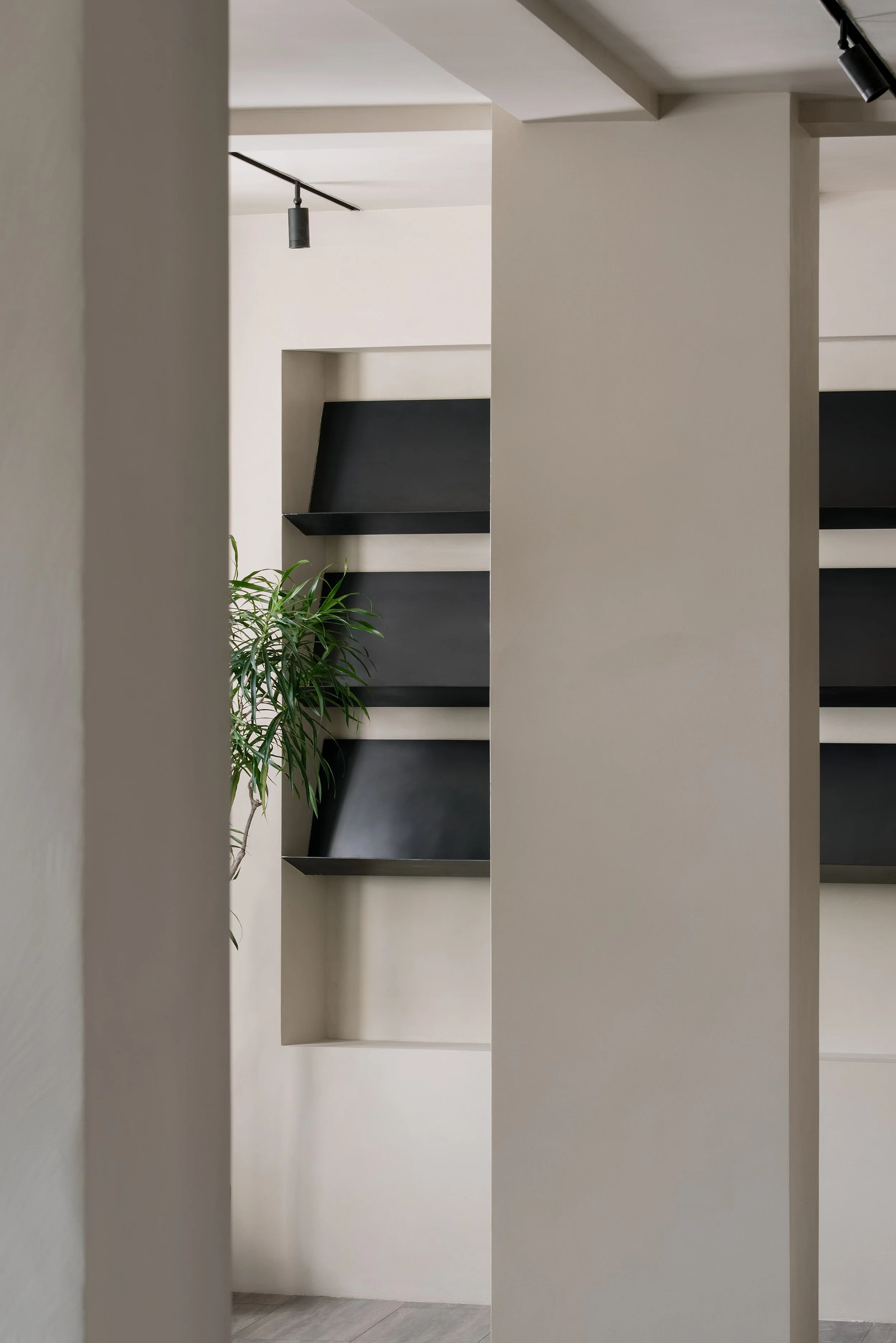 Upon entering Nordic Books, visitors are first welcomed by the Feitan Dessert Bar on the first floor, which features a contrasting material palette of muted lime green micro-cement against the more modern and dramatic blackened steel. The bar itself is hooded by a cascade of greenery, emphasising the blurring of boundaries created by the indoor-outdoor window seats. Towards the back of the space, a sculptural staircase sweeps through the four-floor building. The second floor features an open gallery space and showroom, decked fully in a dark chocolate oak parquet and softly coloured micro-cement walls. The space is kept neutral and inviting while punctuated by the organic textures in the exposed brick wall and natural granite display volumes. The third floor is comprised of a retail space, furnished with a range of sculptural display structures.