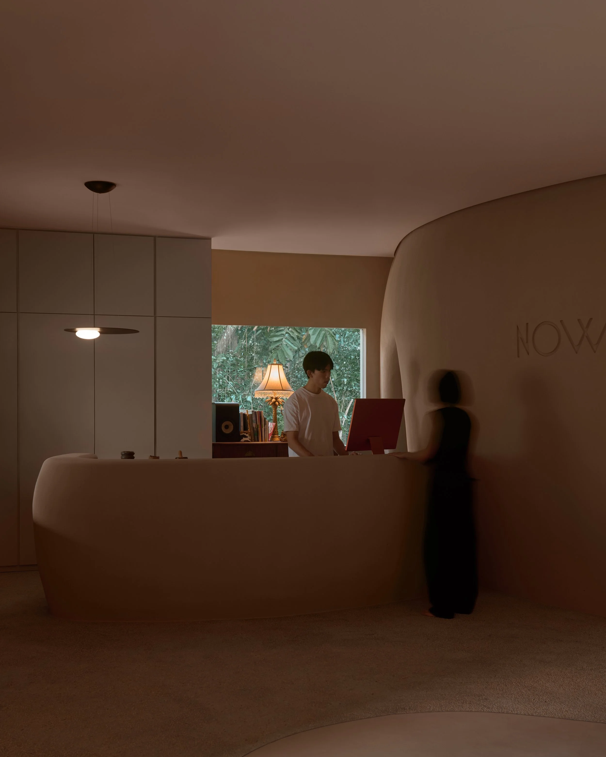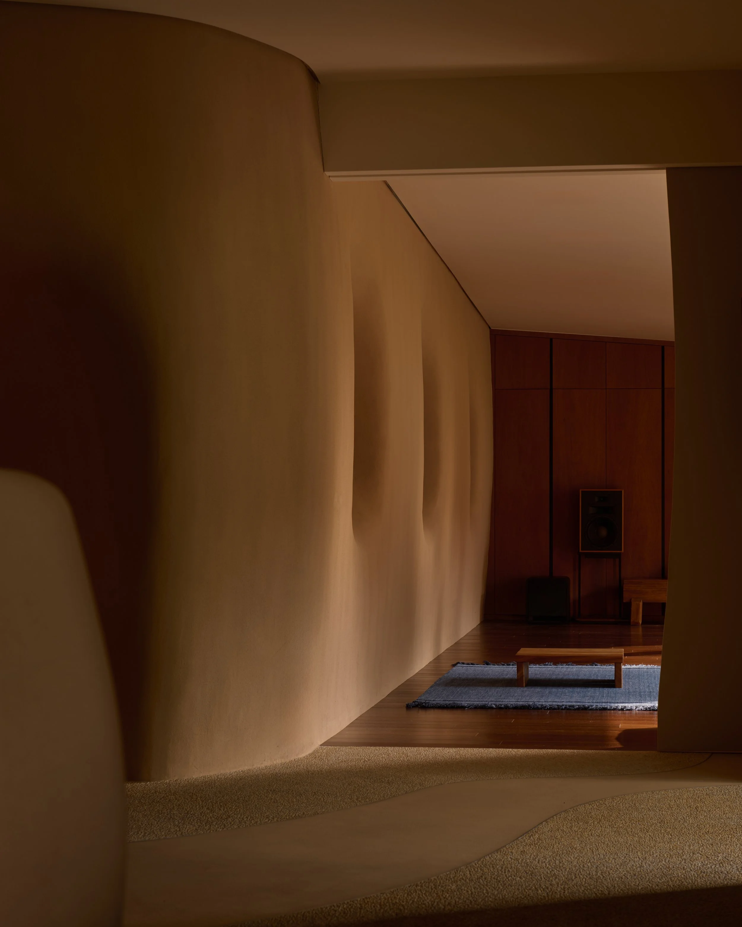 Material changes are central to how the project is read underfoot and at hand. A threshold of velvety microcement meeting tactile pebble-wash flooring heightens awareness of movement from exterior to interior. Deeper inside, sandy-textured stucco wraps the sculpted forms, creating a grounded, cavern-like ambiance that intensifies toward the changing areas.