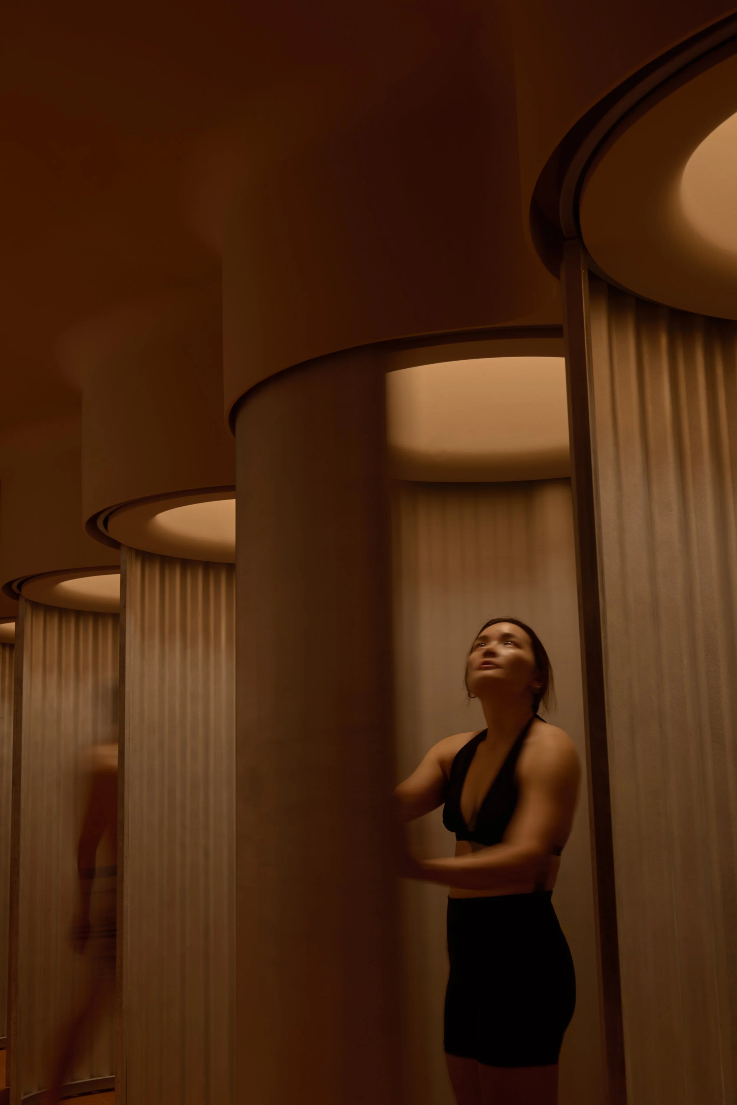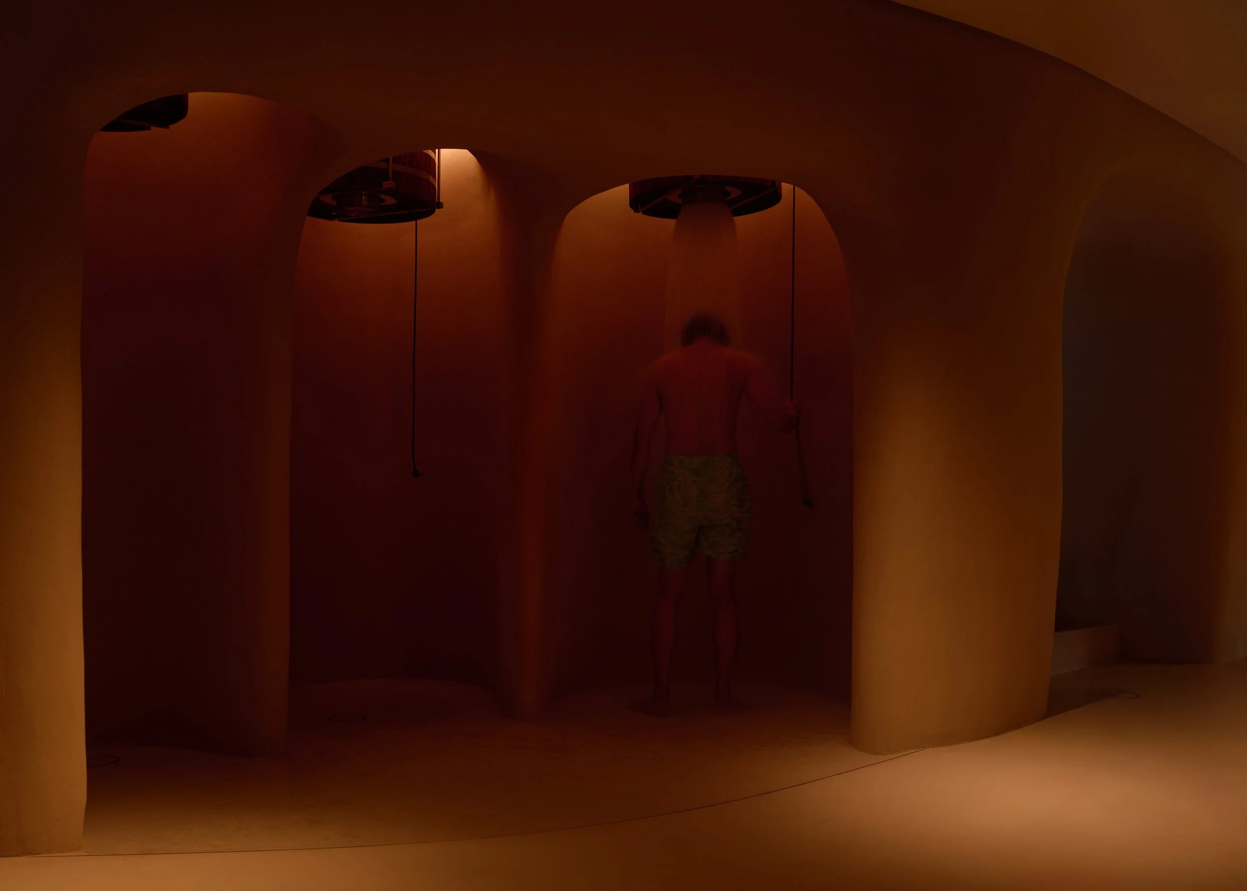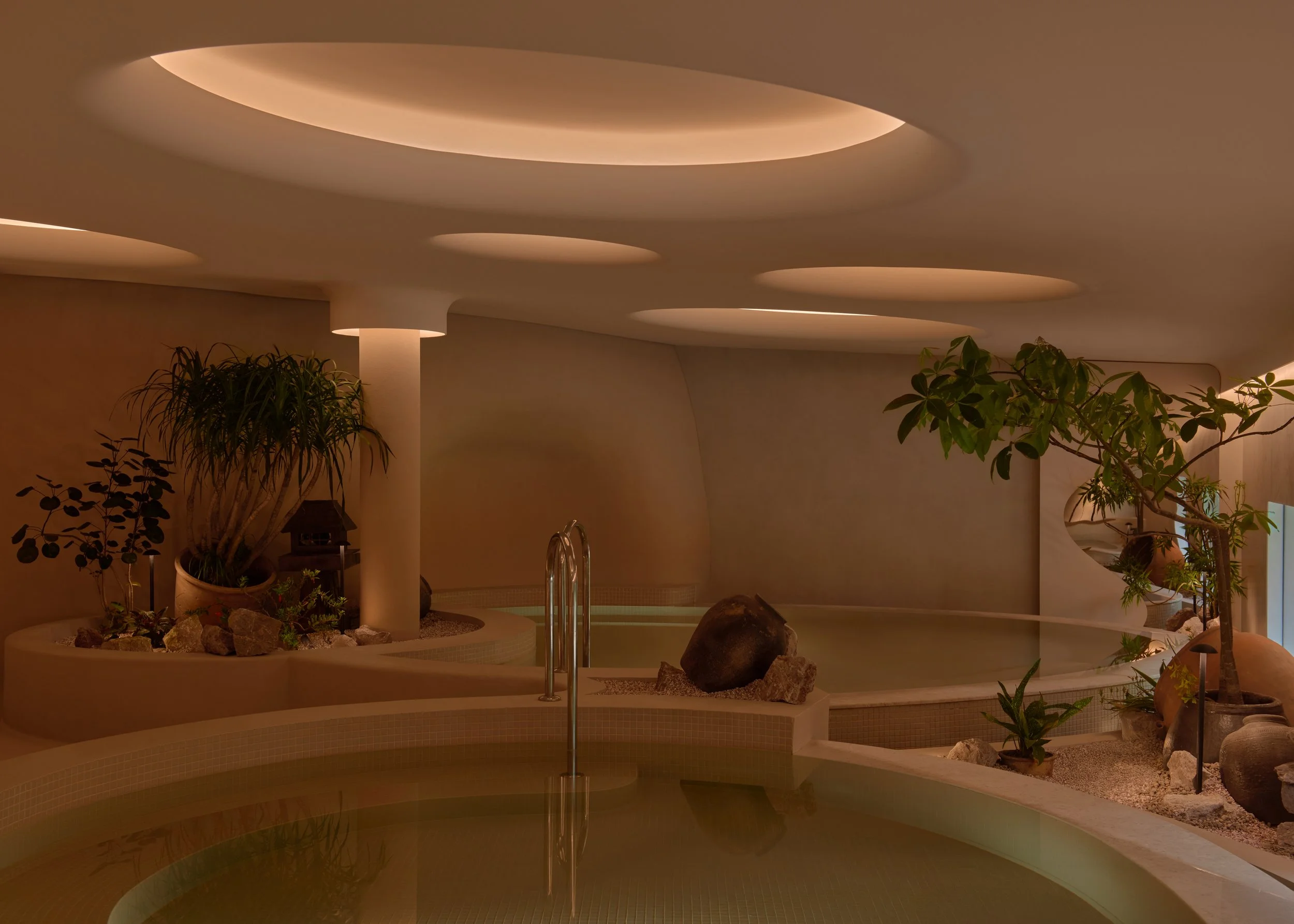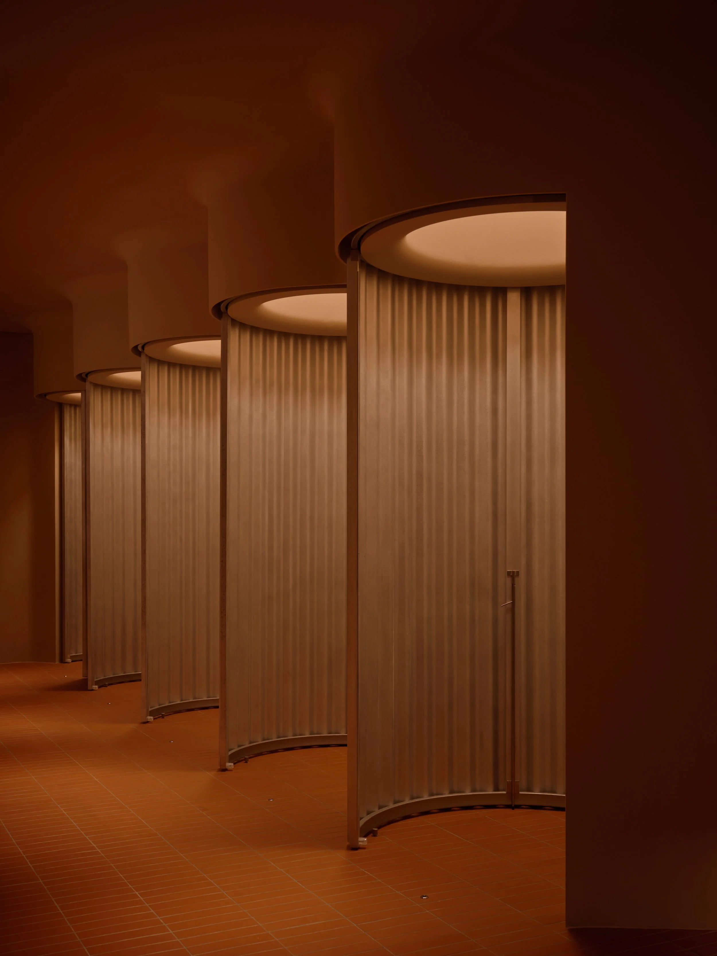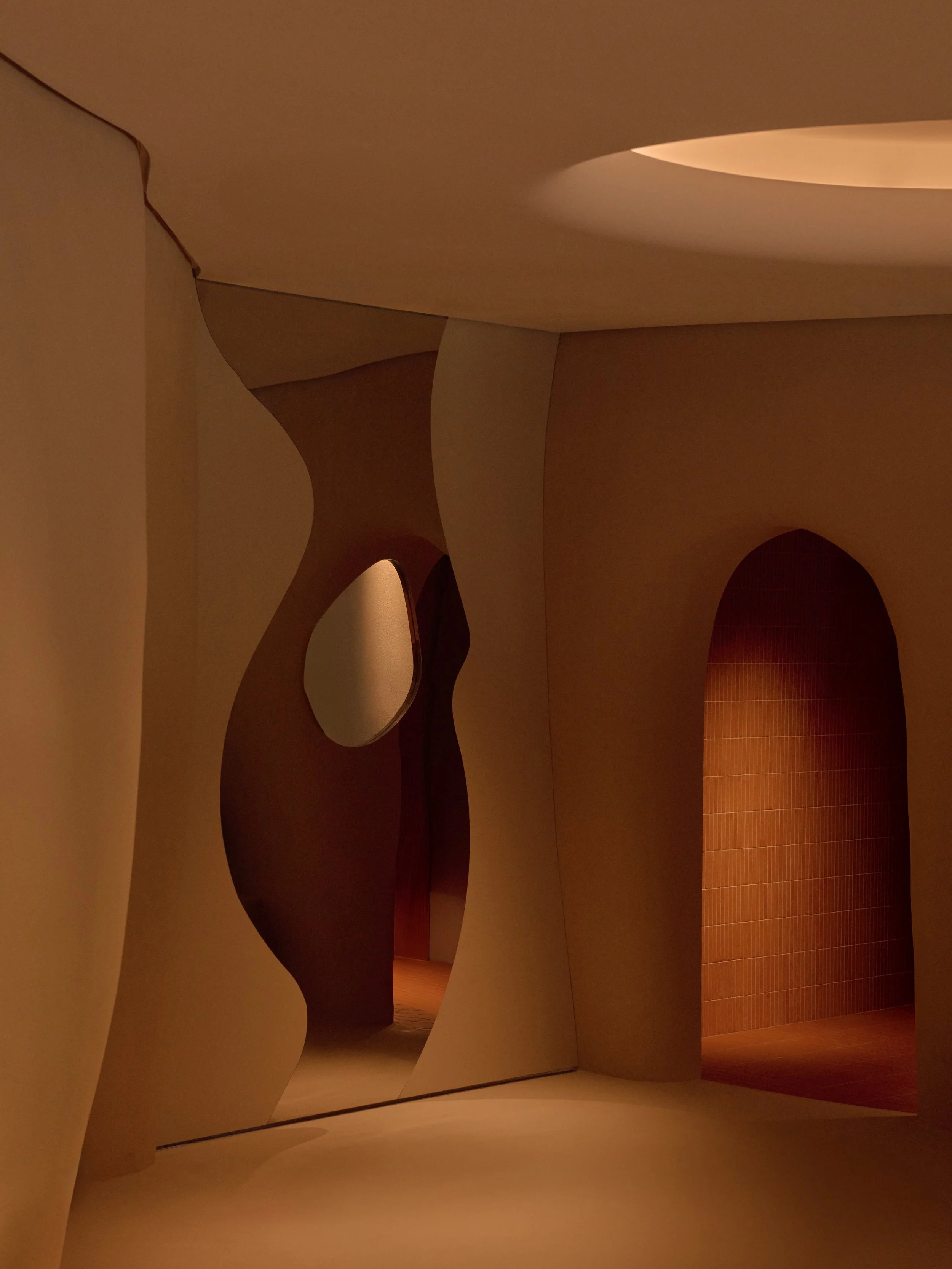 The experience is organised as a sequence of thermal and sensory shifts. Temperature, humidity, light, and texture change in measured steps, guiding visitors from arrival to bathing, then back toward a quieter state. Throughout, the architecture holds the body closely. Elliptical, sculpted volumes create pockets of enclosure, soften edges, and lend the spaces a calm, protective geometry.