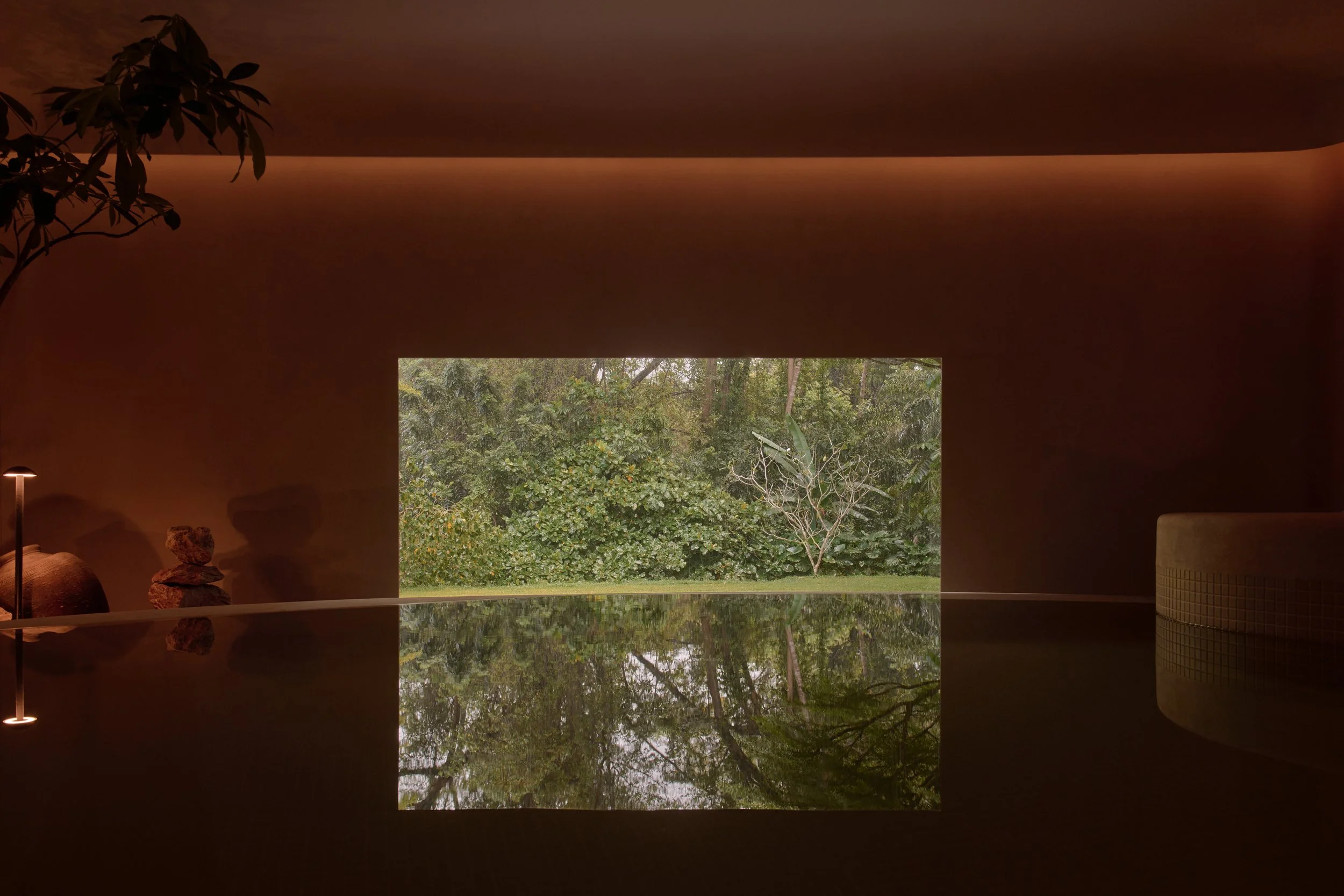 Clean apertures are cut into the façade to frame the jungle as a constant presence, without heavy thresholds or decorative framing. Views become part of the interior atmosphere, with softened light and carefully positioned openings allowing the forest to register as colour, movement, and depth. Infinity pools and framed vistas extend the sense of immersion, keeping the boundary between inside and outside deliberately thin.