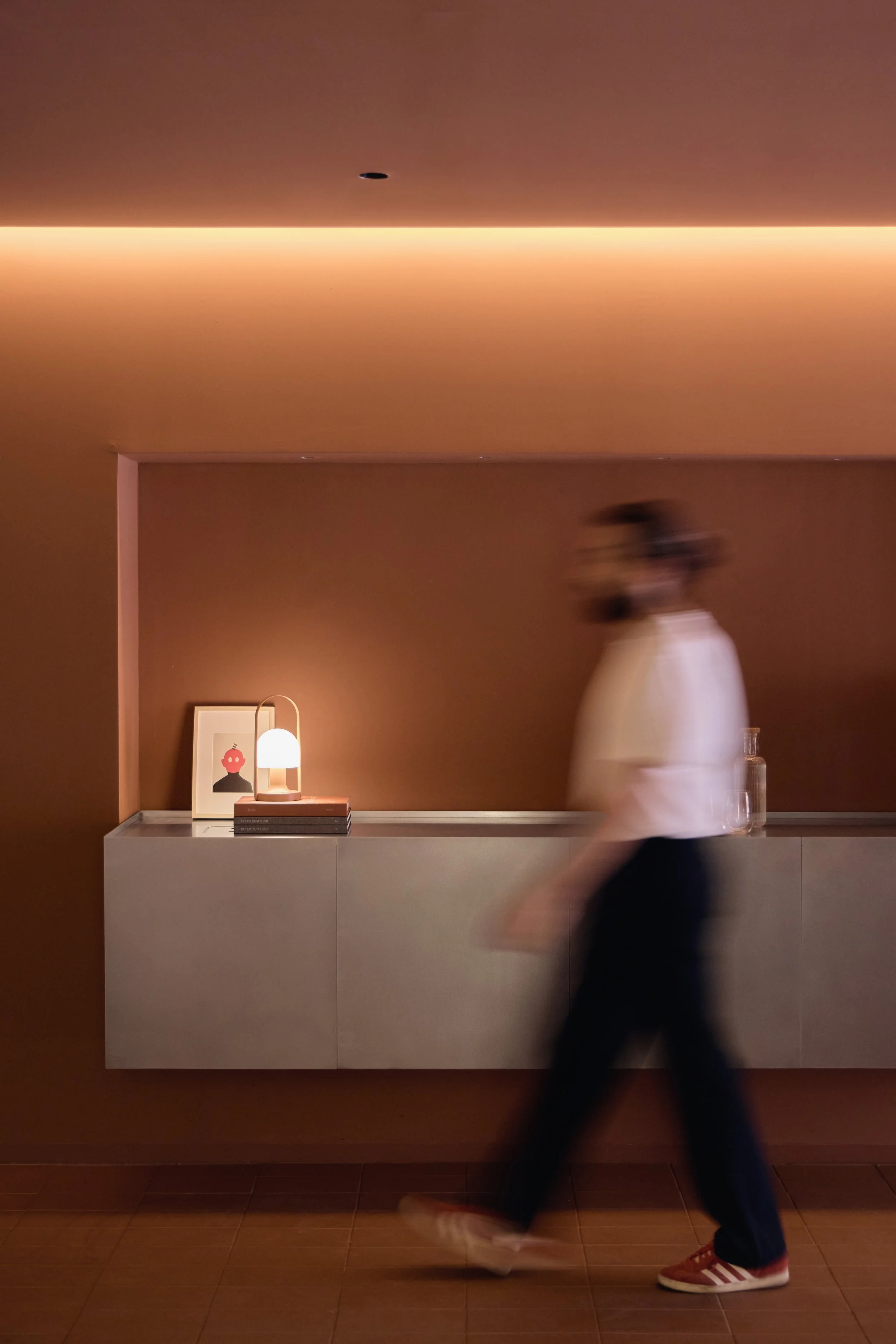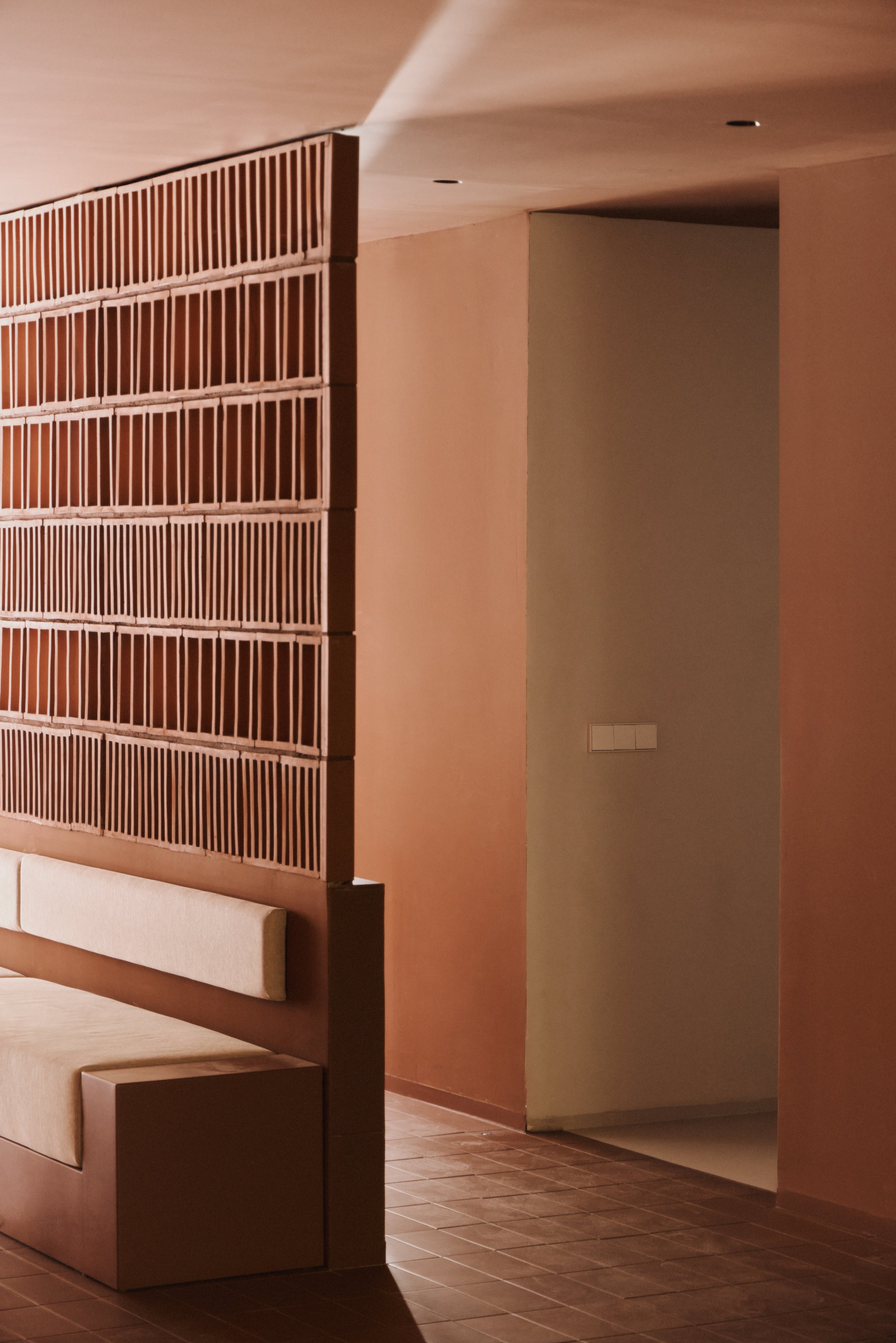 A defined palette of warm, earthy tones establishes the foundation of the interior. These hues extend across walls, ceilings and built-in elements, creating a continuous visual language. Rather than serving as ornament, colour structures the environment, marking transitions and supporting different functions. This continuity brings cohesion and calm, softening separations between rooms and encouraging a fluid experience. Subtle tonal variations introduce depth while maintaining restraint.
