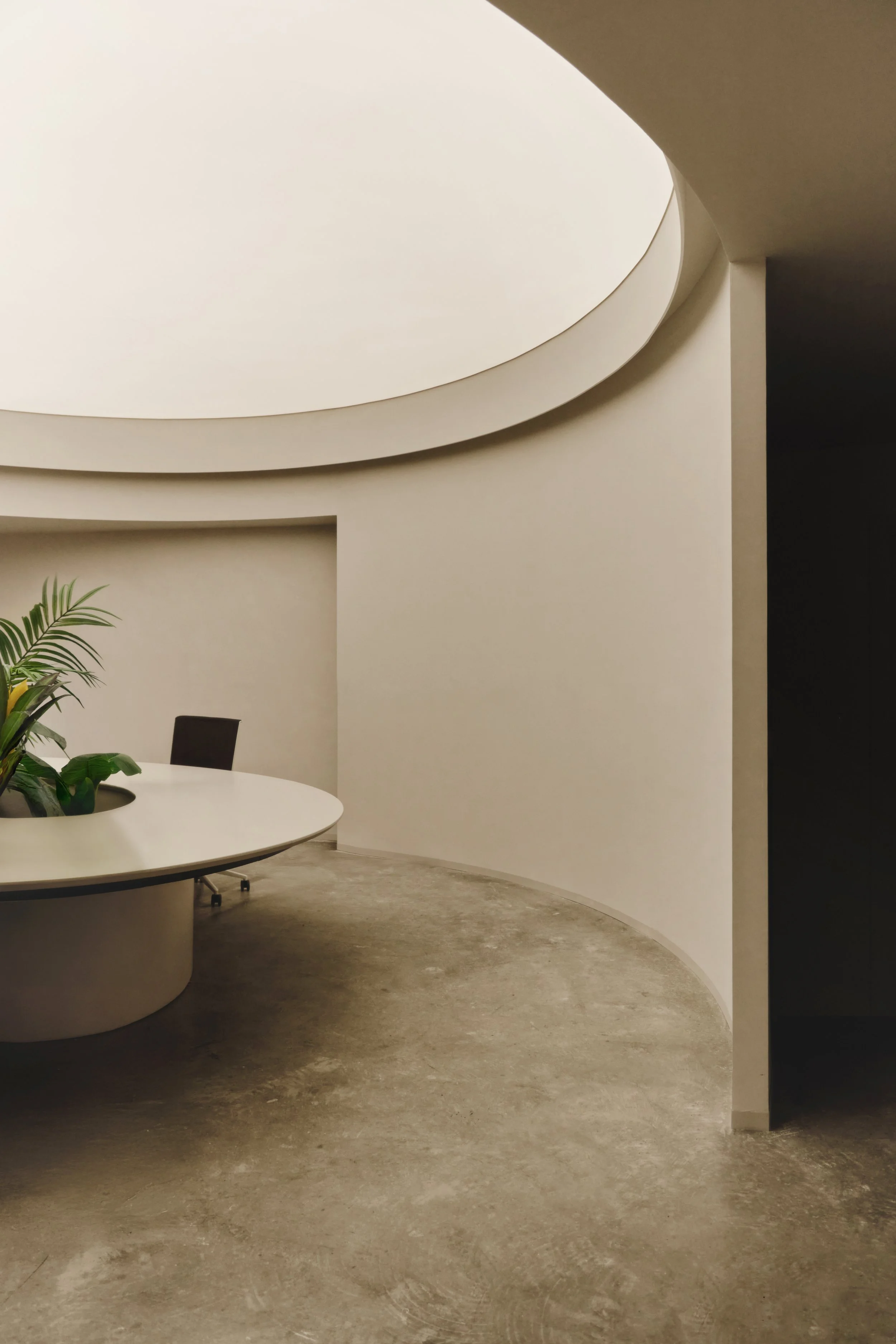 Light plays an equally important role in shaping the atmosphere. Natural and artificial illumination are carefully calibrated to move gently across matte surfaces, revealing texture and reinforcing volume. Shadows remain soft, and contrasts are controlled to support focus and comfort throughout the day. Light also enhances the perception of colour, giving surfaces a tactile presence and reinforcing the sensory quality of the workplace.