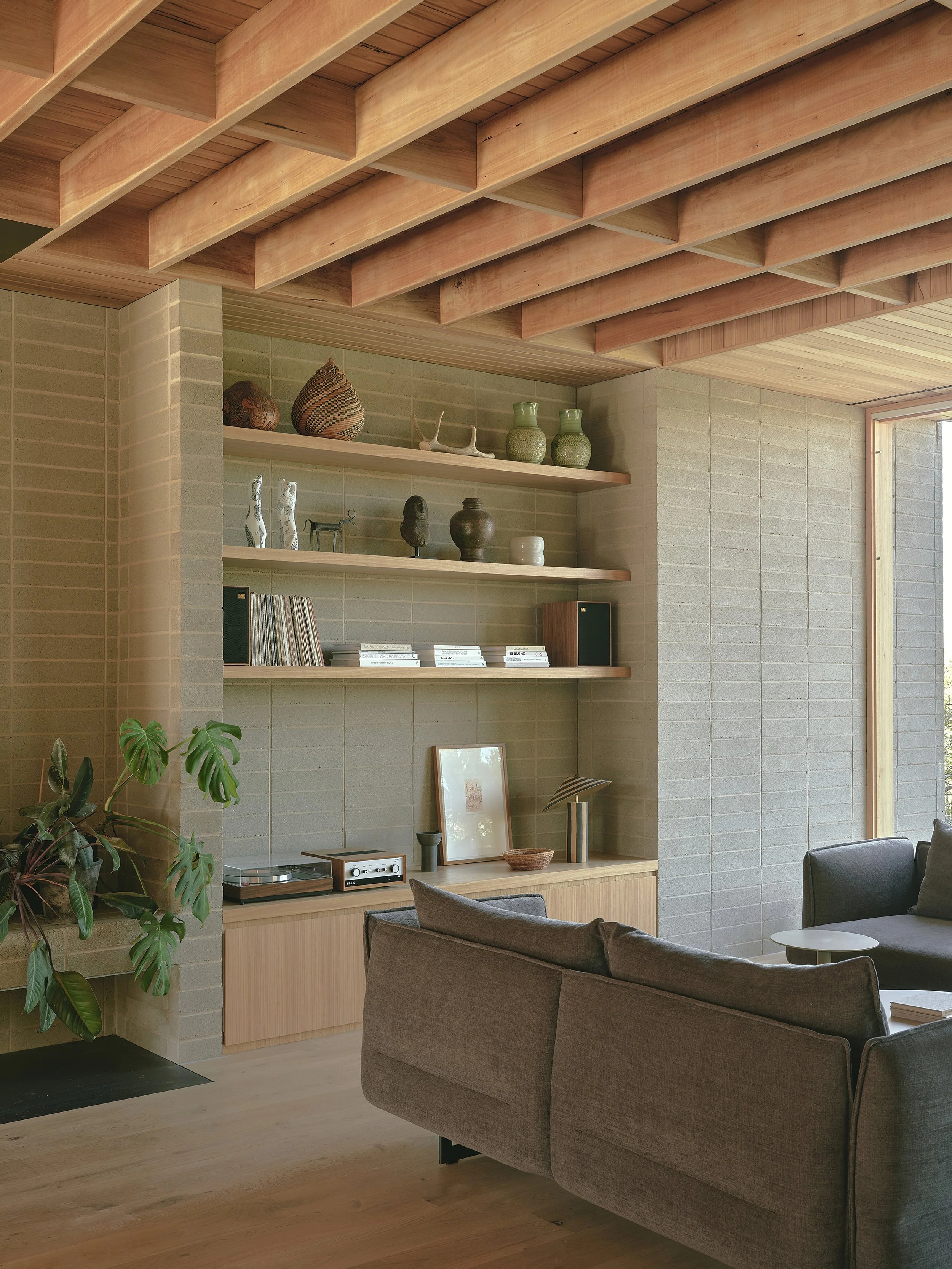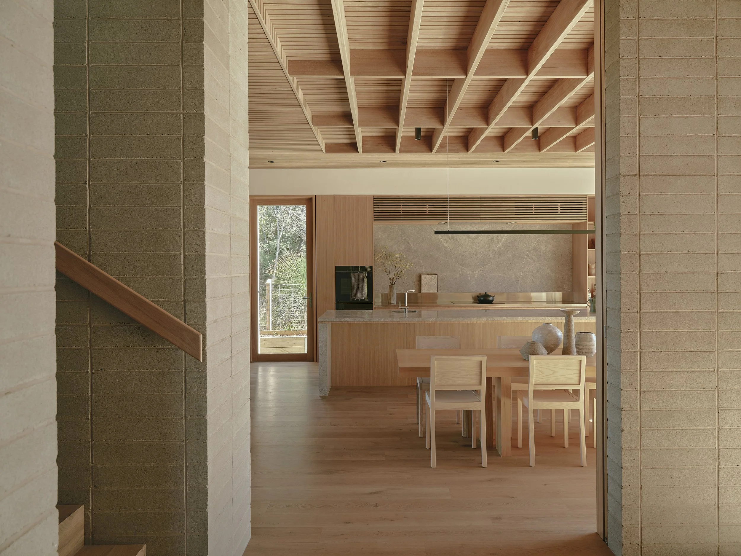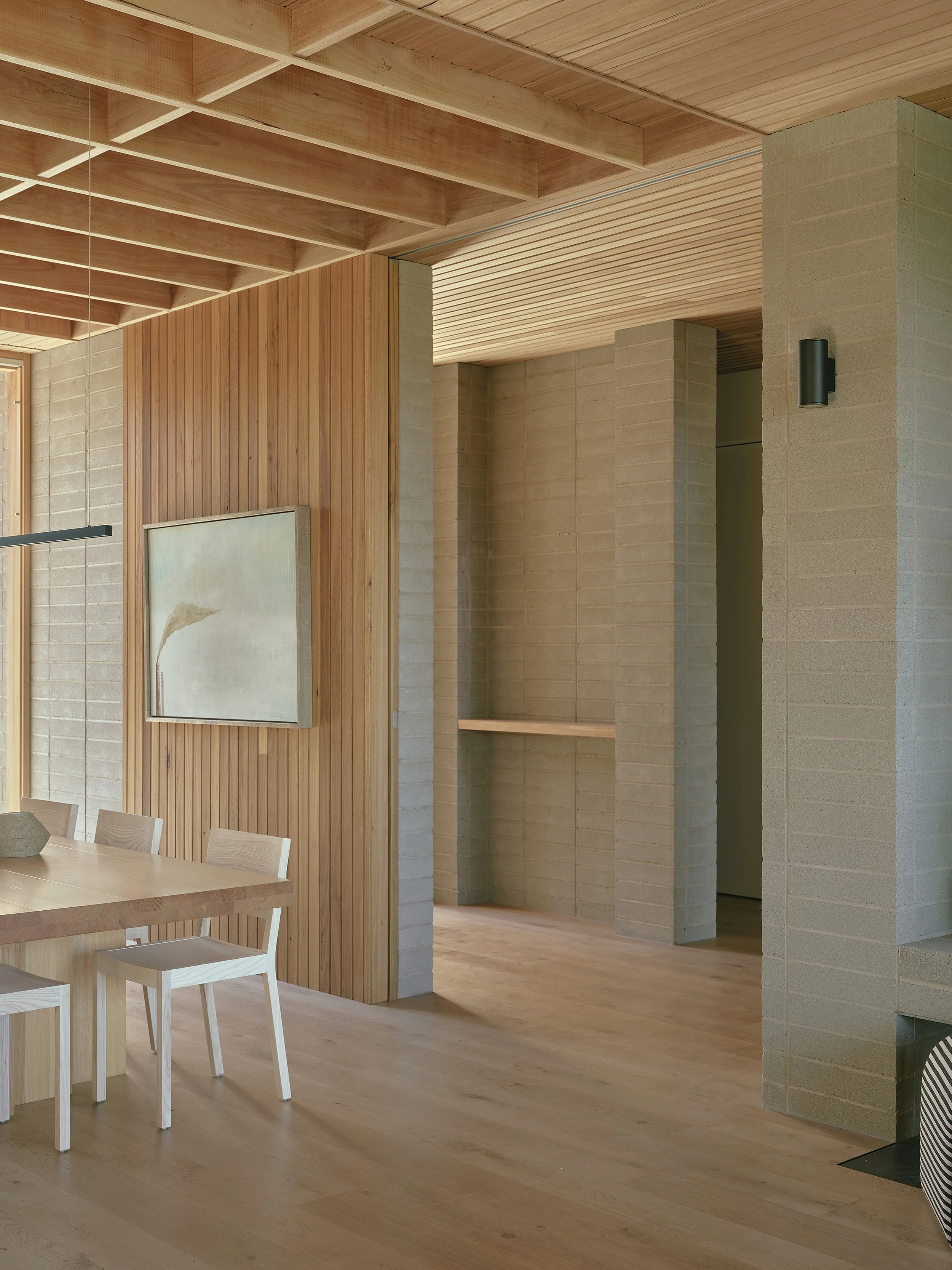 Within the home, the selection of materials contributes to a calm and enduring atmosphere, with finishes chosen for their warmth, durability, and ability to age gracefully in the coastal climate. The lower level is anchored by solid blockwork construction, which not only provides structural stability but also contributes valuable thermal mass that helps moderate the internal temperature throughout the year. Above, timber surfaces introduce a softer and more tactile character, drawing inspiration from the tones and textures of the surrounding vegetation and subtly reinforcing the connection between the interiors and the coastal environment beyond. Throughout the residence, the palette remains intentionally restrained, allowing the natural qualities of timber, masonry, and simple finishes to shape the character of each room without unnecessary embellishment.