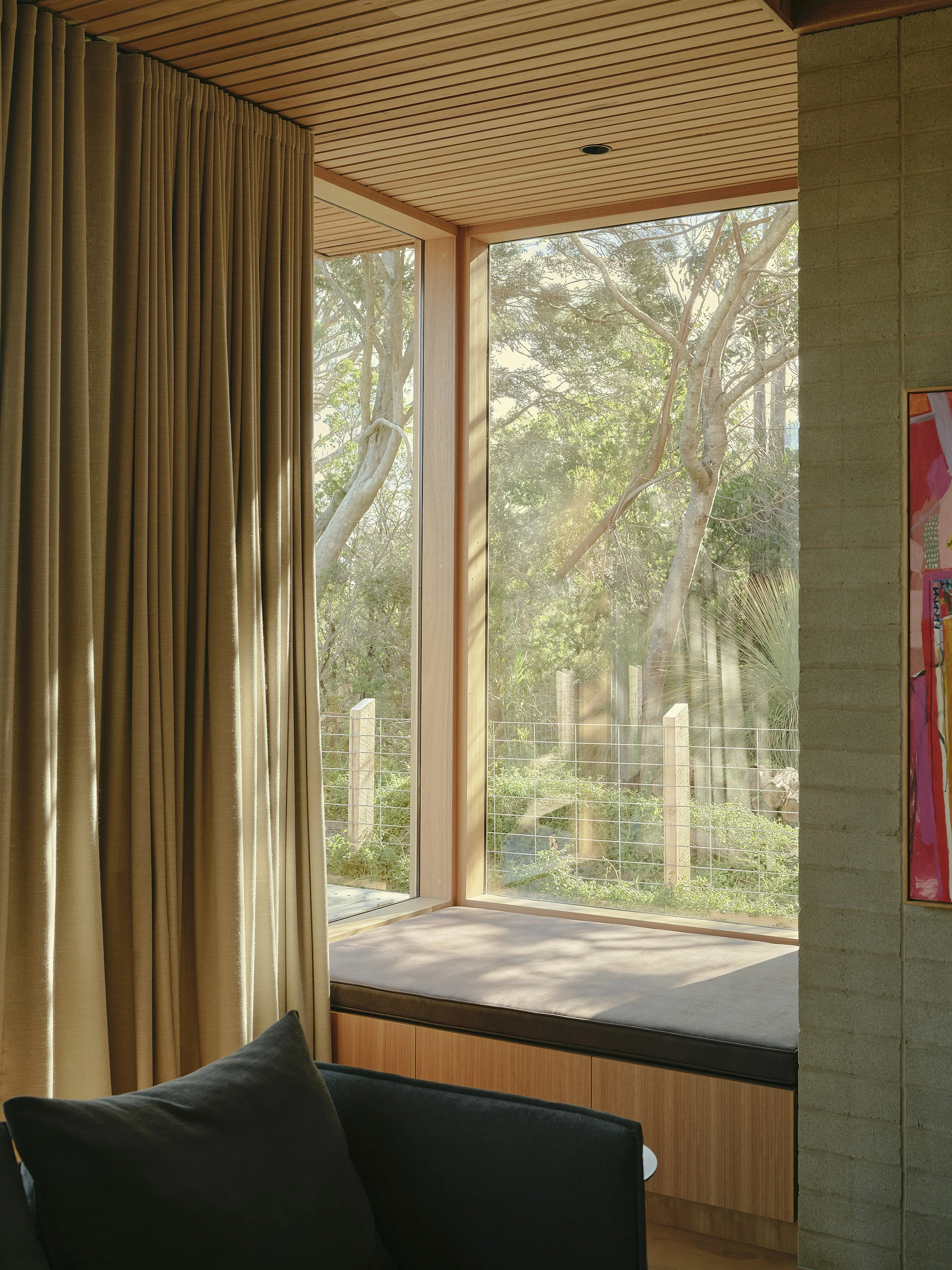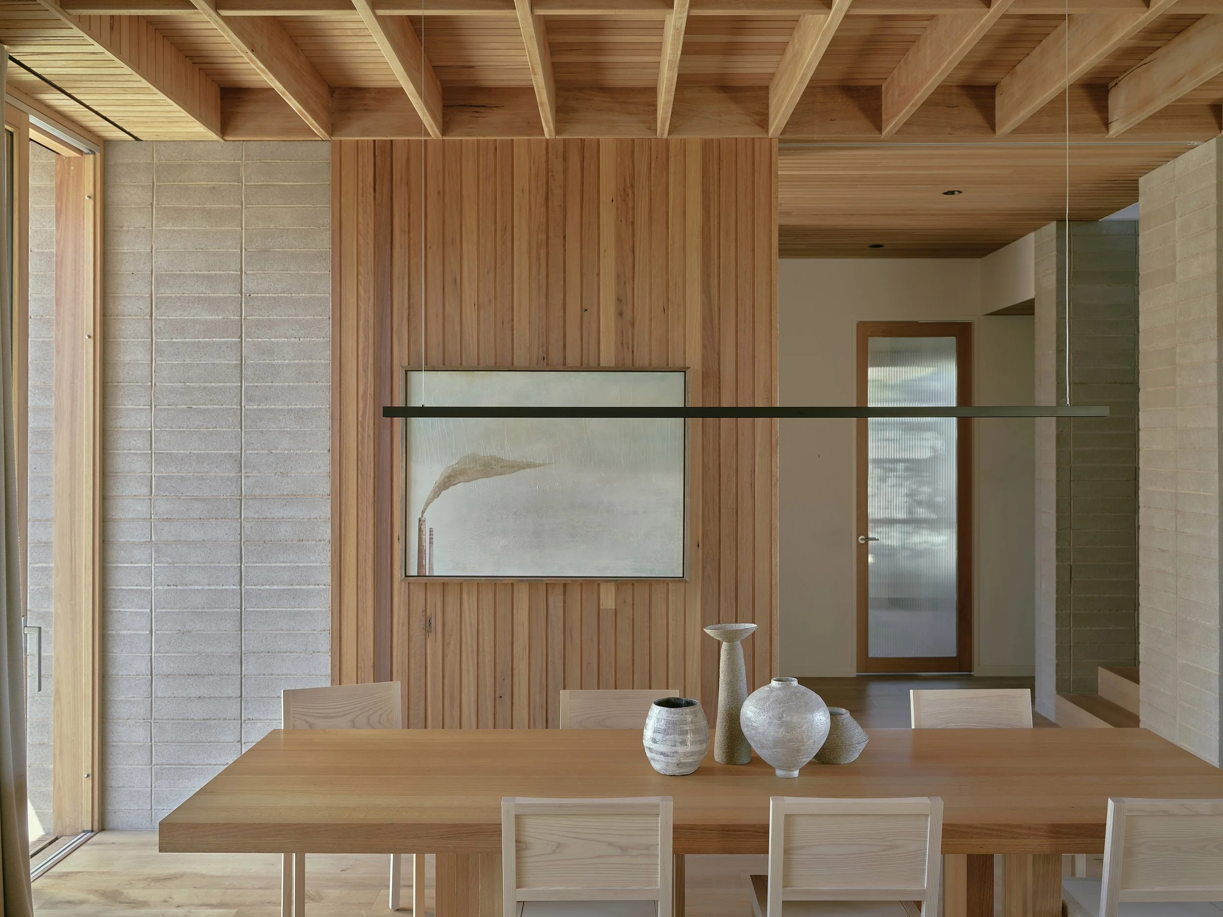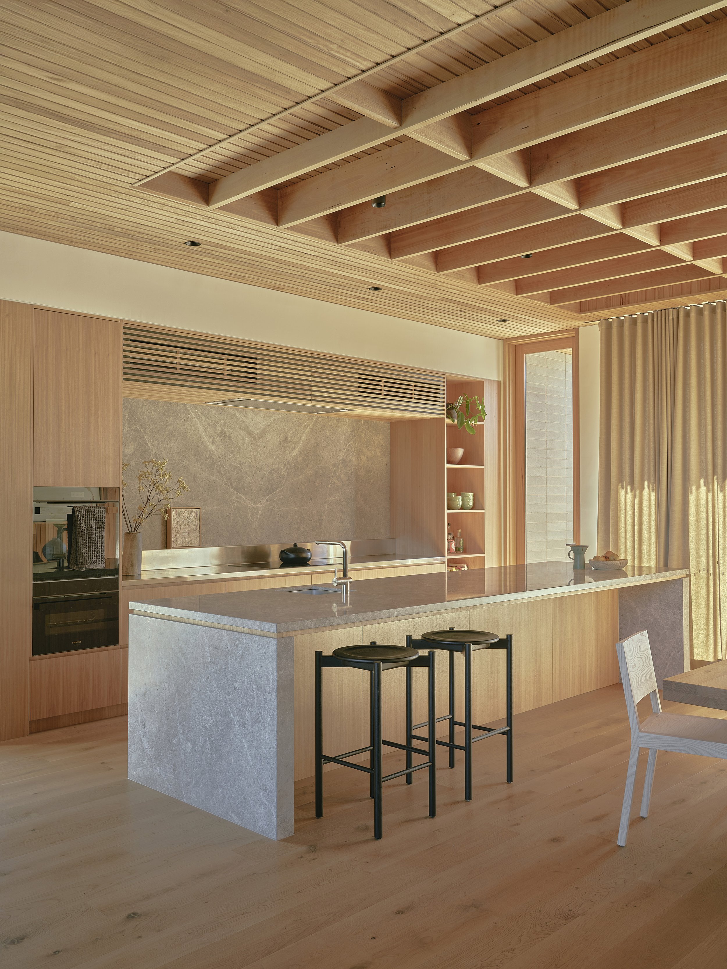 Within the home, the selection of materials contributes to a calm and enduring atmosphere, with finishes chosen for their warmth, durability, and ability to age gracefully in the coastal climate. The lower level is anchored by solid blockwork construction, which not only provides structural stability but also contributes valuable thermal mass that helps moderate the internal temperature throughout the year. Above, timber surfaces introduce a softer and more tactile character, drawing inspiration from the tones and textures of the surrounding vegetation and subtly reinforcing the connection between the interiors and the coastal environment beyond. Throughout the residence, the palette remains intentionally restrained, allowing the natural qualities of timber, masonry, and simple finishes to shape the character of each room without unnecessary embellishment.
