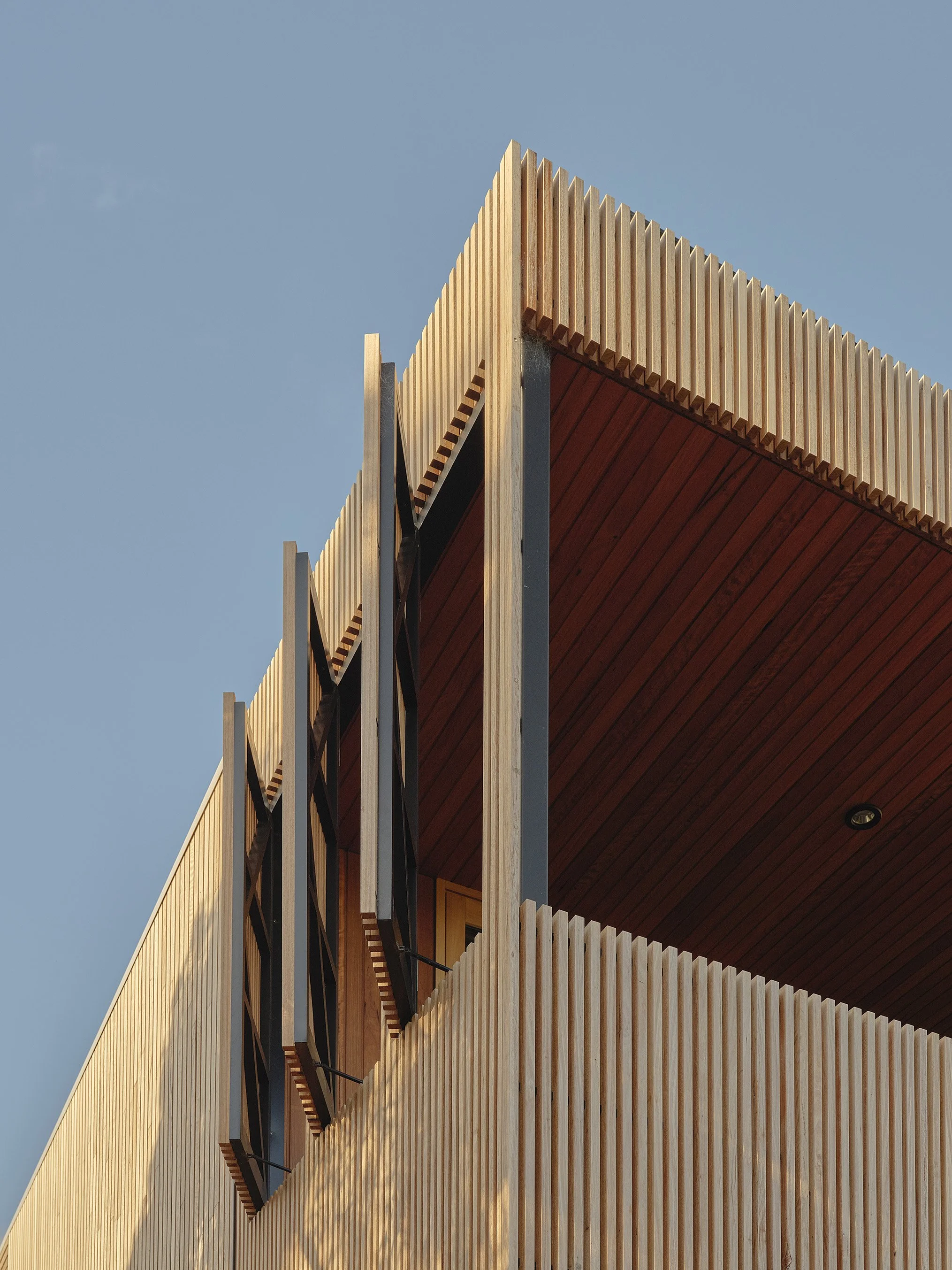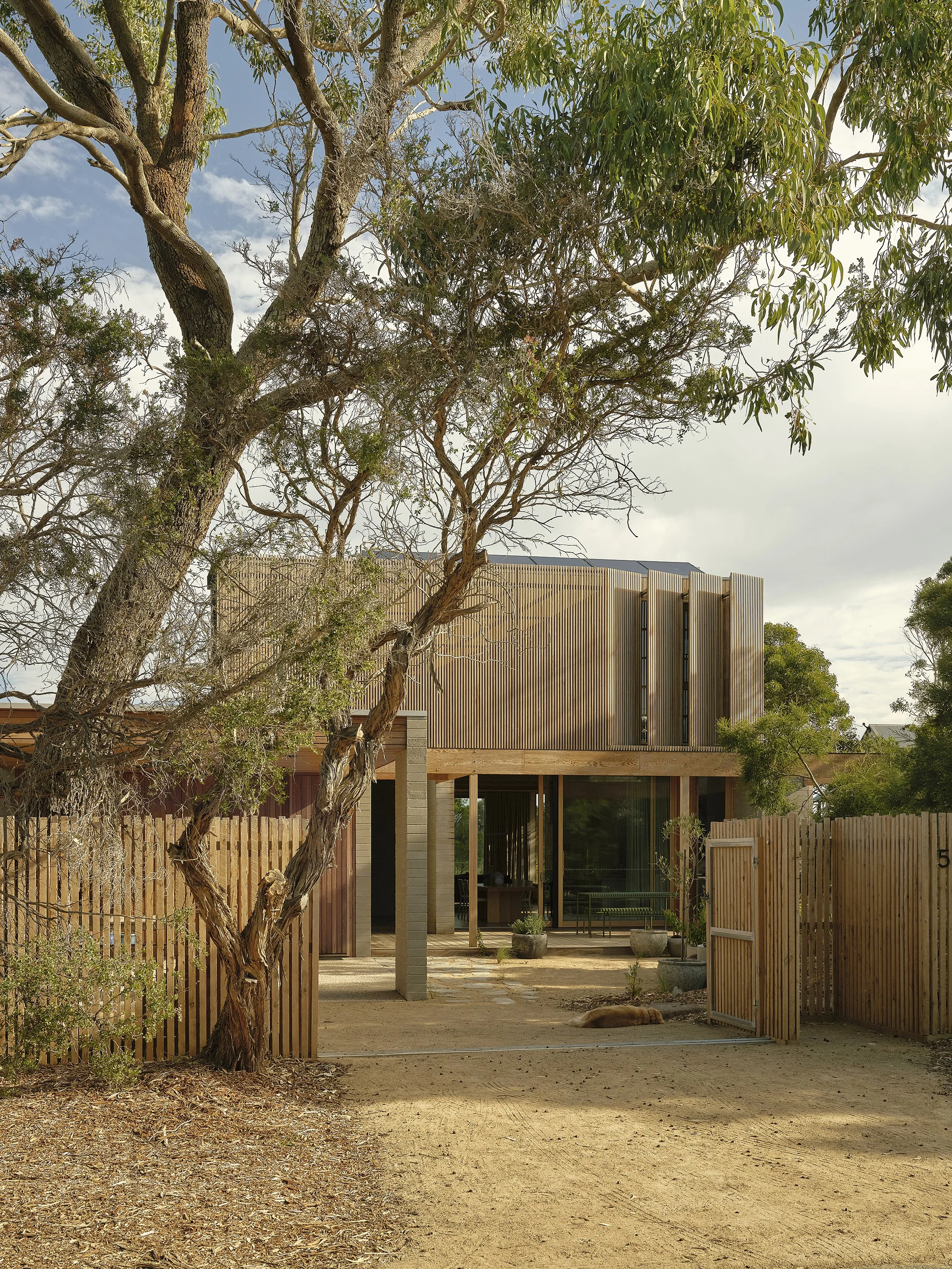 Timber screening elements wrap sections of the building and extend into the interior language of the home, filtering daylight and mediating the transition between inside and outside environments. These vertical elements reference the forms of the surrounding coastal flora while providing privacy and shade, allowing natural light to enter in a softer and more controlled manner throughout the day. The presence of these screens reinforces the relationship between architecture and landscape, creating layered thresholds that gently connect the interiors with terraces and garden areas.