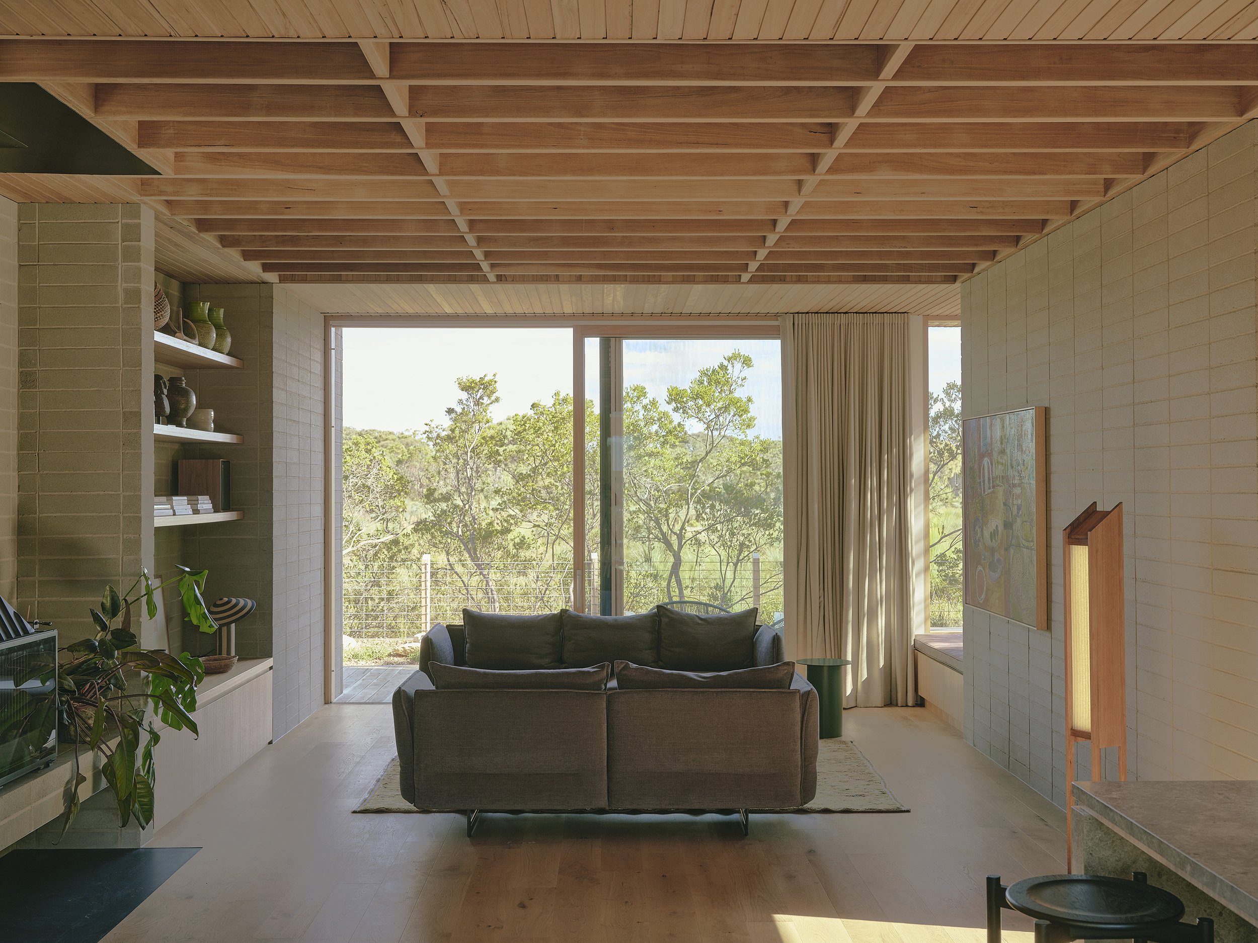 Environmental performance is also integrated into the broader interior strategy, with the residence operating almost entirely off-grid through the use of solar power, battery storage, and rainwater harvesting systems. Passive thermal principles, supported by the mass of the blockwork base and the orientation of the living areas, help maintain a comfortable internal climate with minimal reliance on mechanical systems, while native planting and durable finishes further reduce the need for ongoing maintenance.