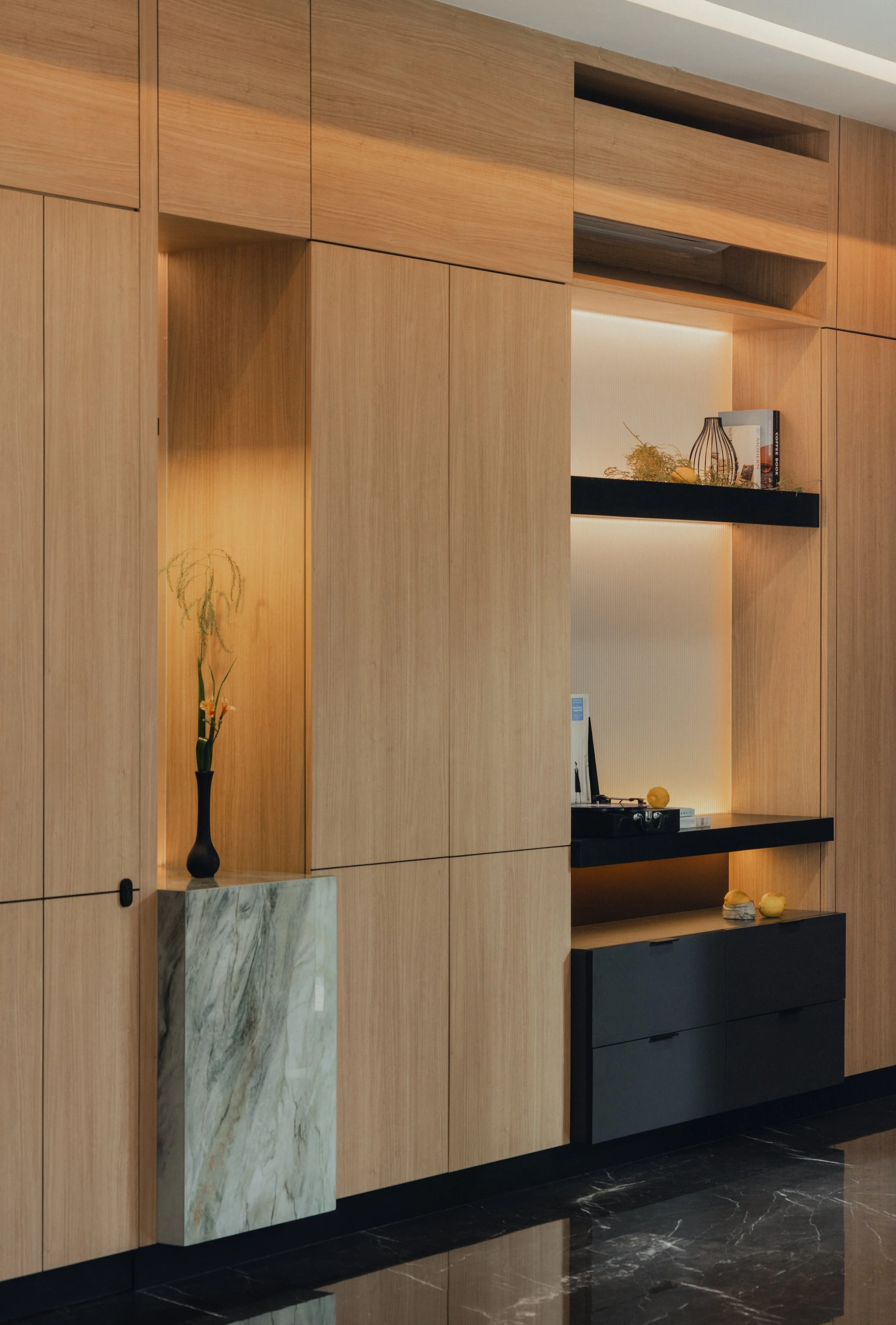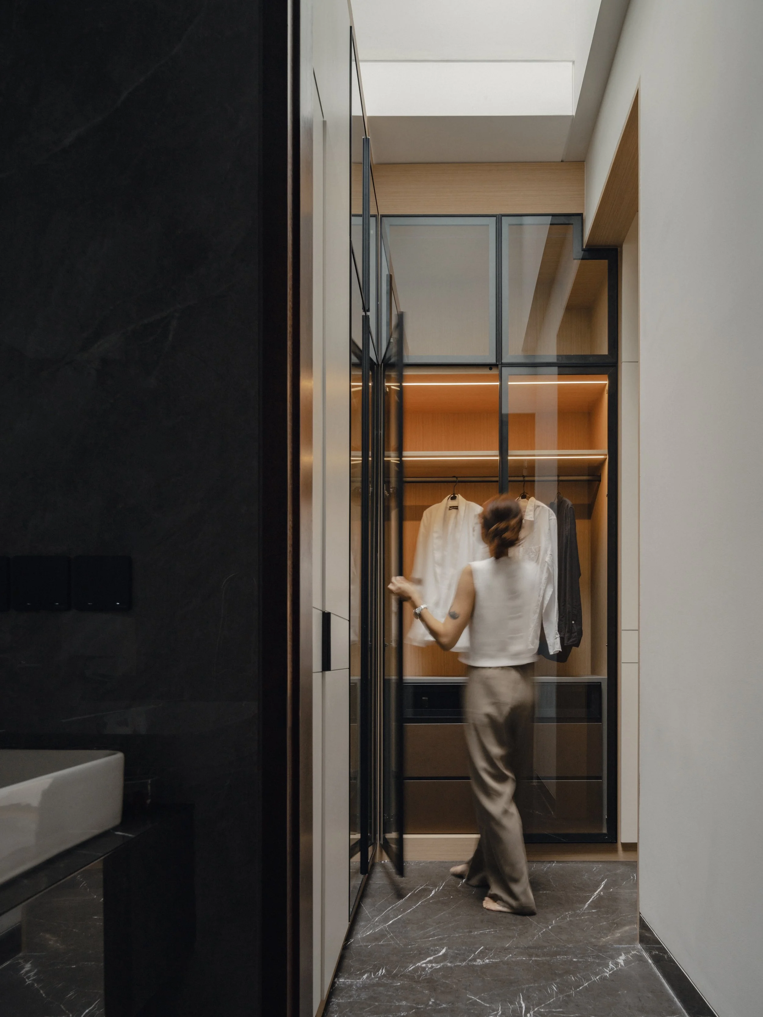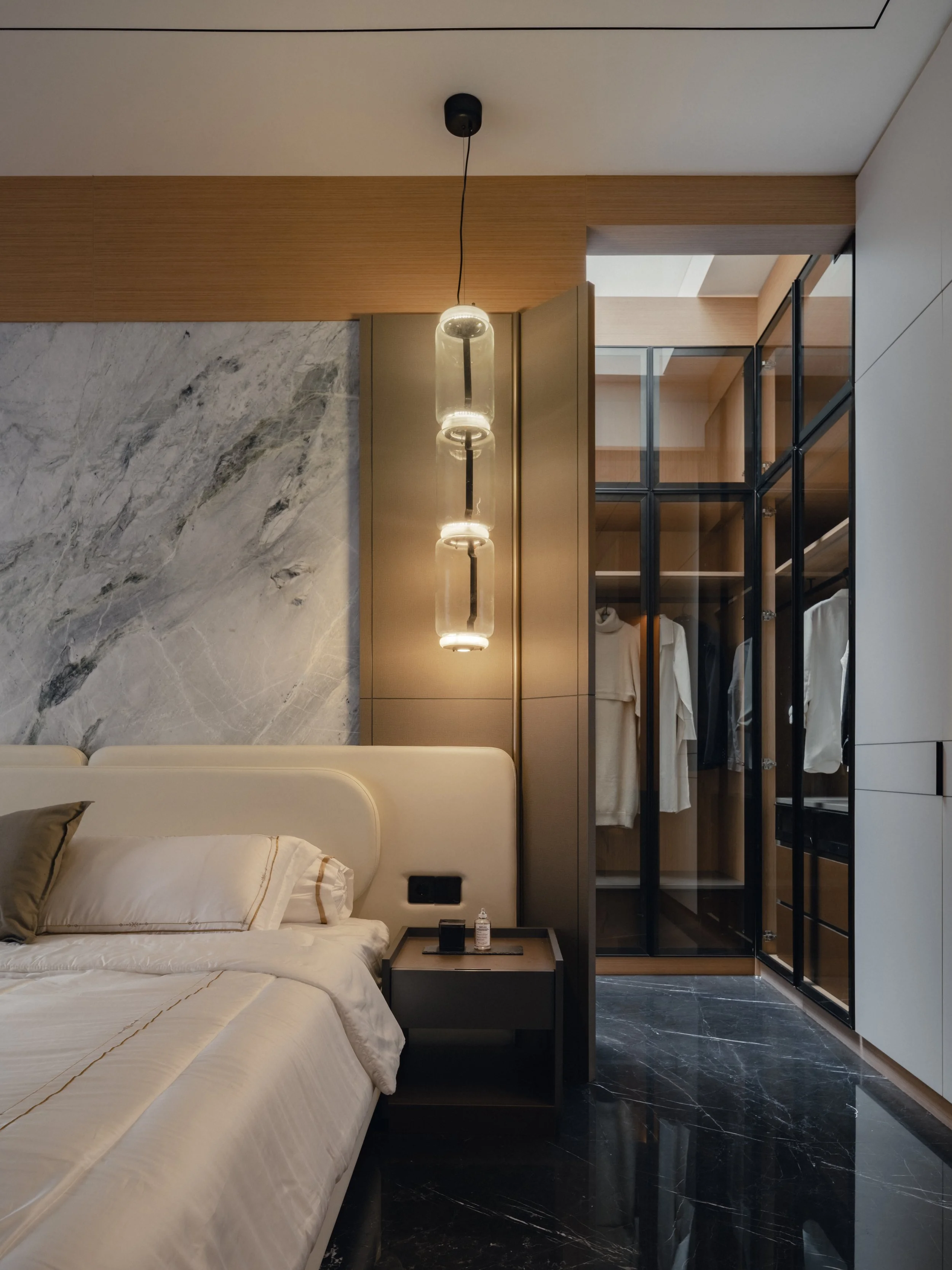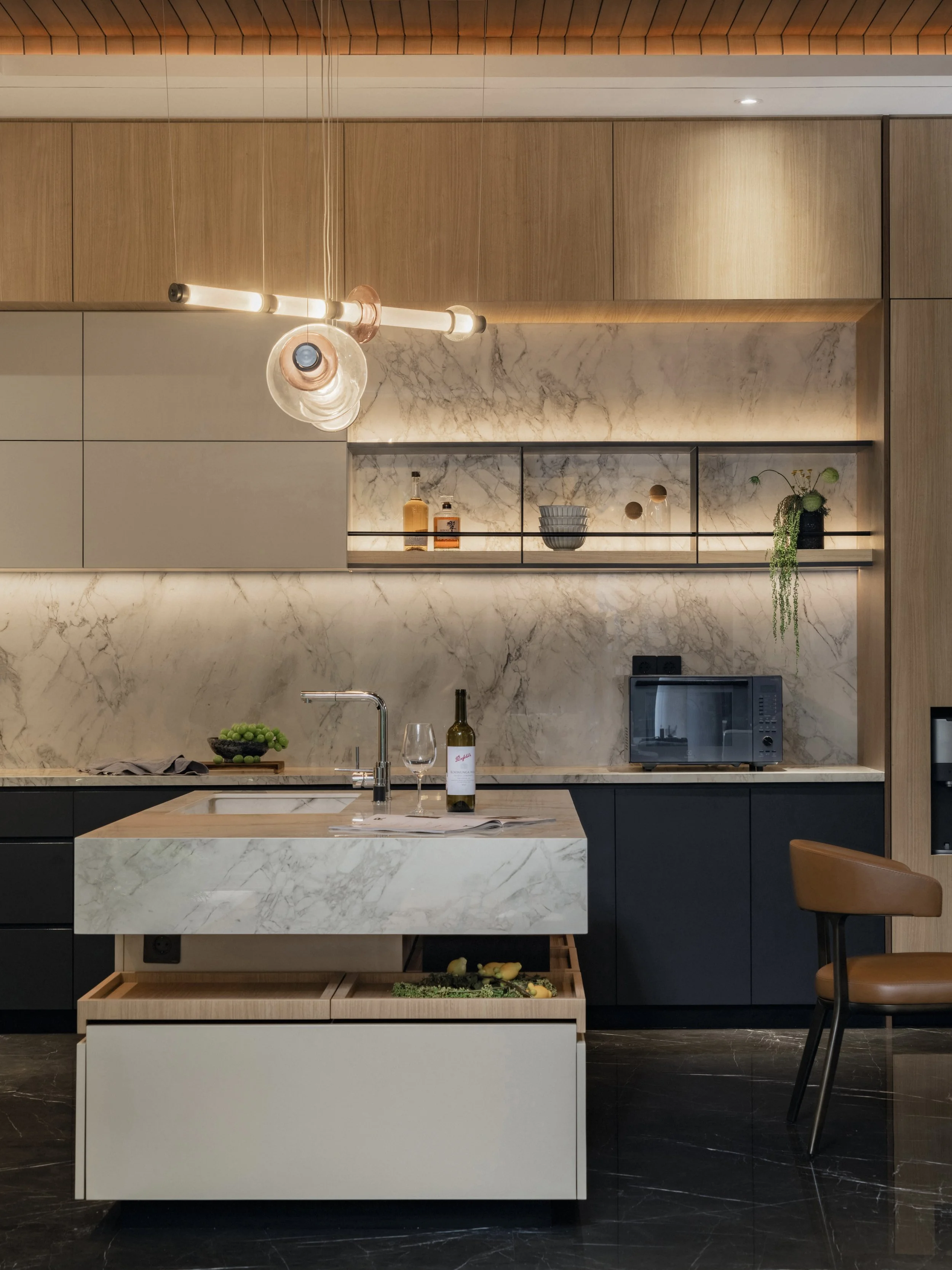 Inside, the material palette leans toward warmth and tactility. Expressive marble with dynamic veining defines key focal points, offering contrast against walnut finishes and dark marble flooring. Stone veneers enhance vertical surfaces with subtle texture while supporting durability for everyday use. Ambient lighting softens each room and amplifies the home’s rich tonal foundation. Every space introduces its own distinct feature — a unique texture, a tailored fixture, or a refined finishing detail — creating a sense of continuity while allowing for quiet surprises as one moves through the home.