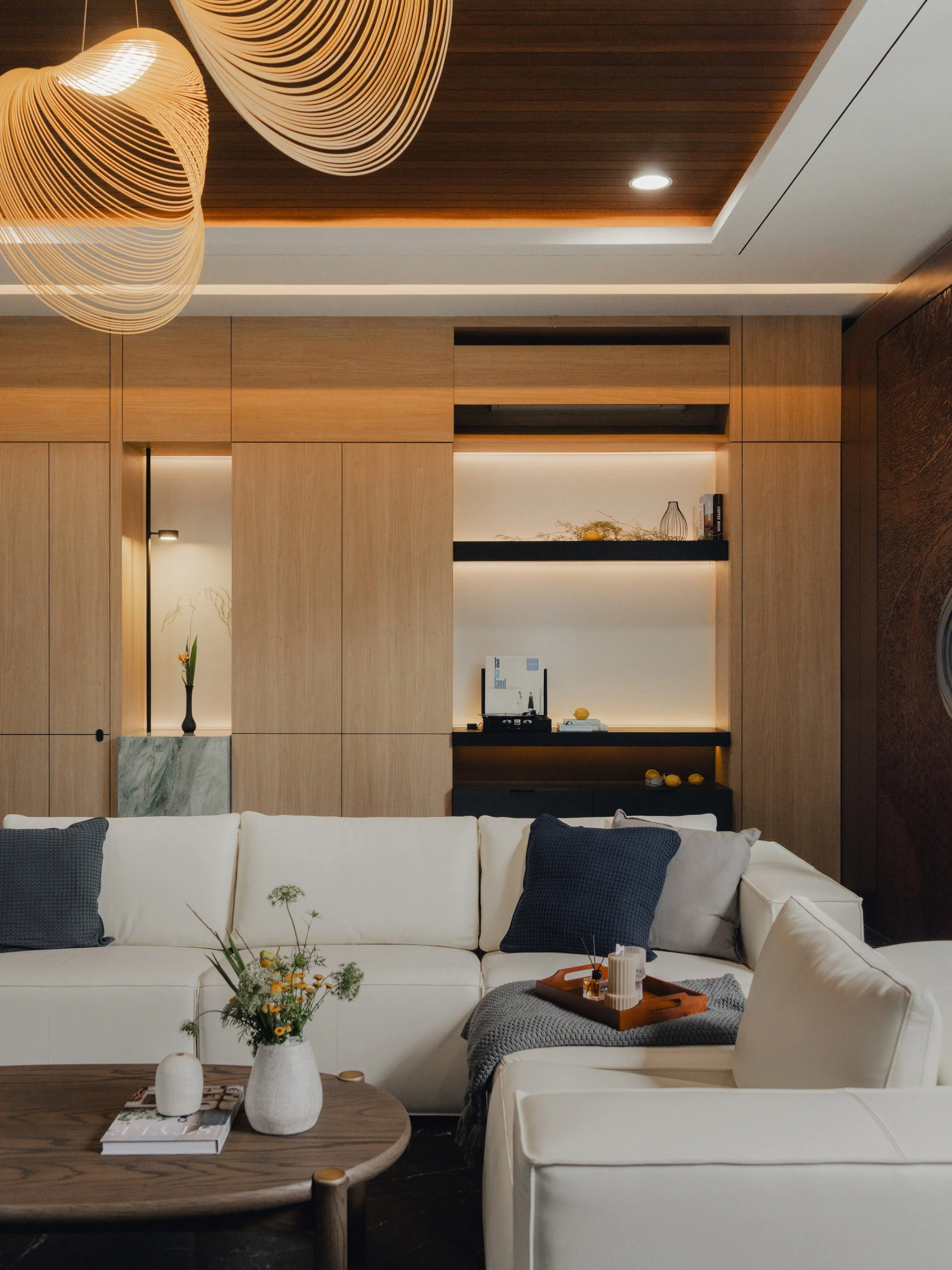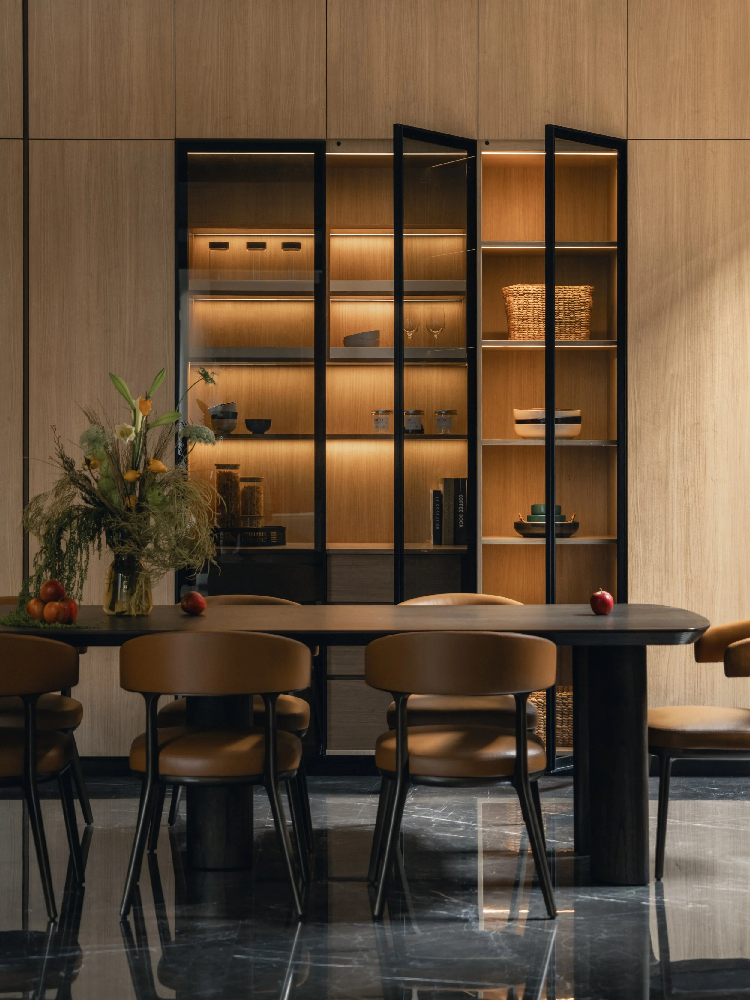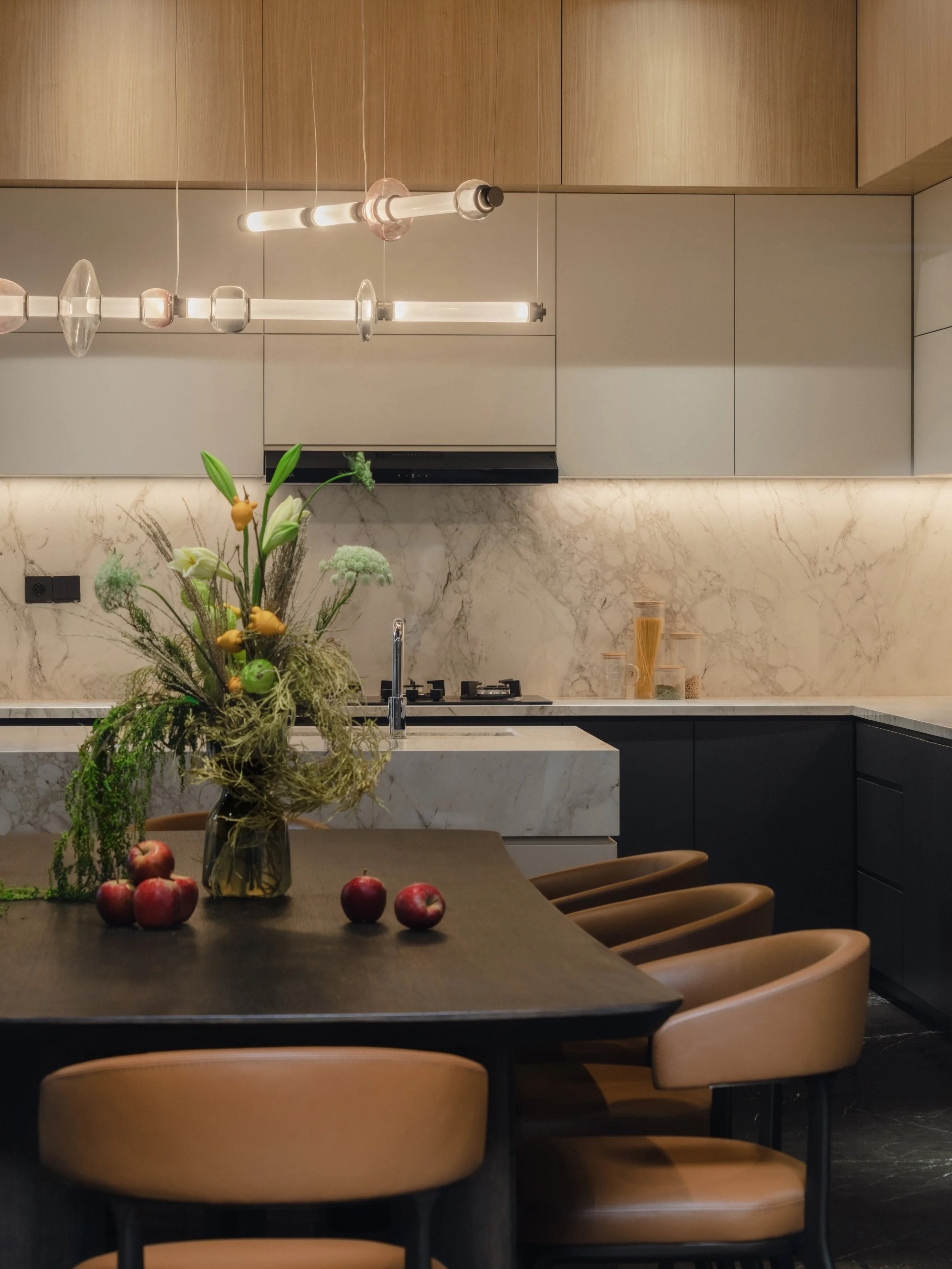 Inside, the material palette leans toward warmth and tactility. Expressive marble with dynamic veining defines key focal points, offering contrast against walnut finishes and dark marble flooring. Stone veneers enhance vertical surfaces with subtle texture while supporting durability for everyday use. Ambient lighting softens each room and amplifies the home’s rich tonal foundation. Every space introduces its own distinct feature — a unique texture, a tailored fixture, or a refined finishing detail — creating a sense of continuity while allowing for quiet surprises as one moves through the home.