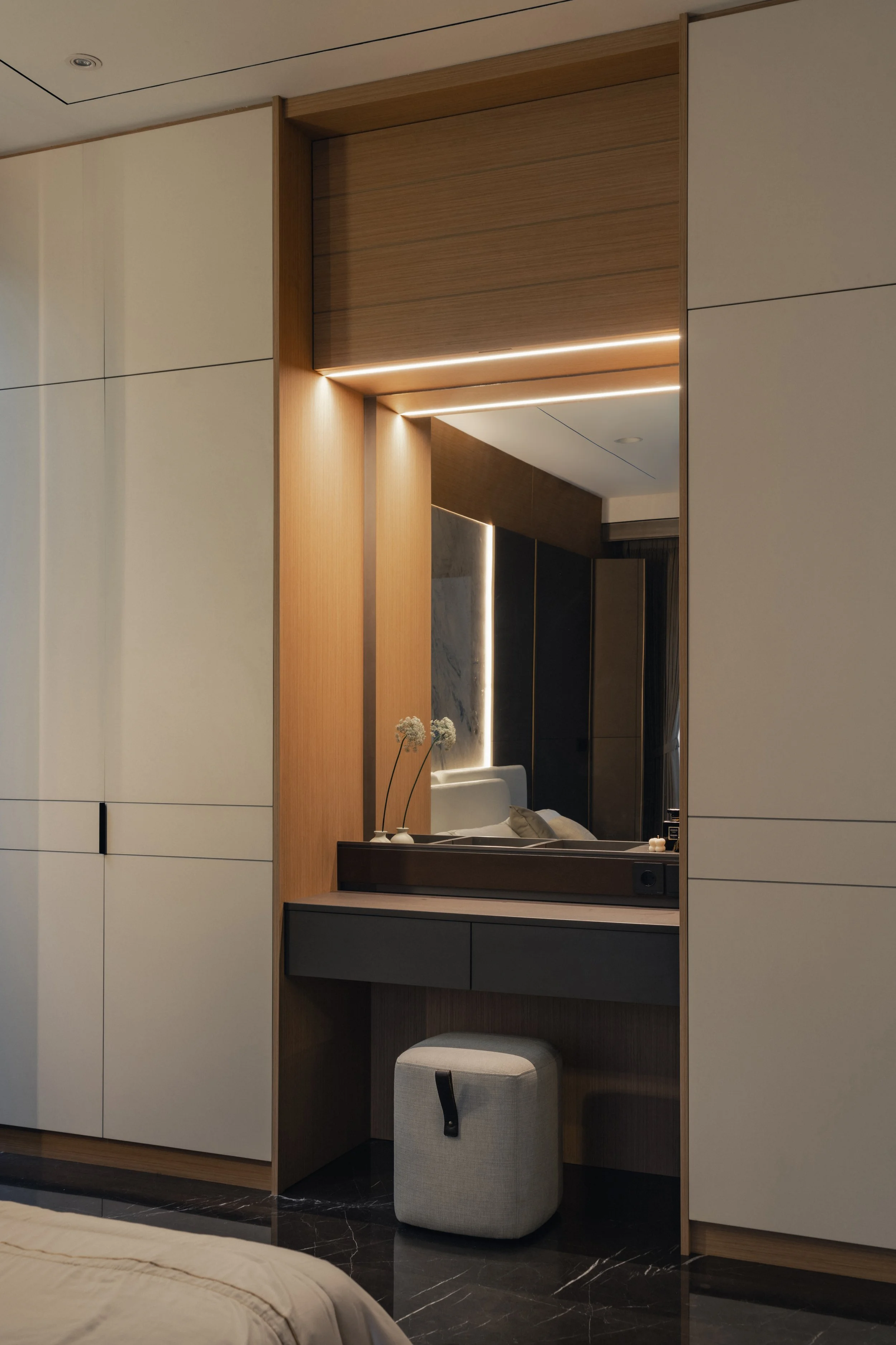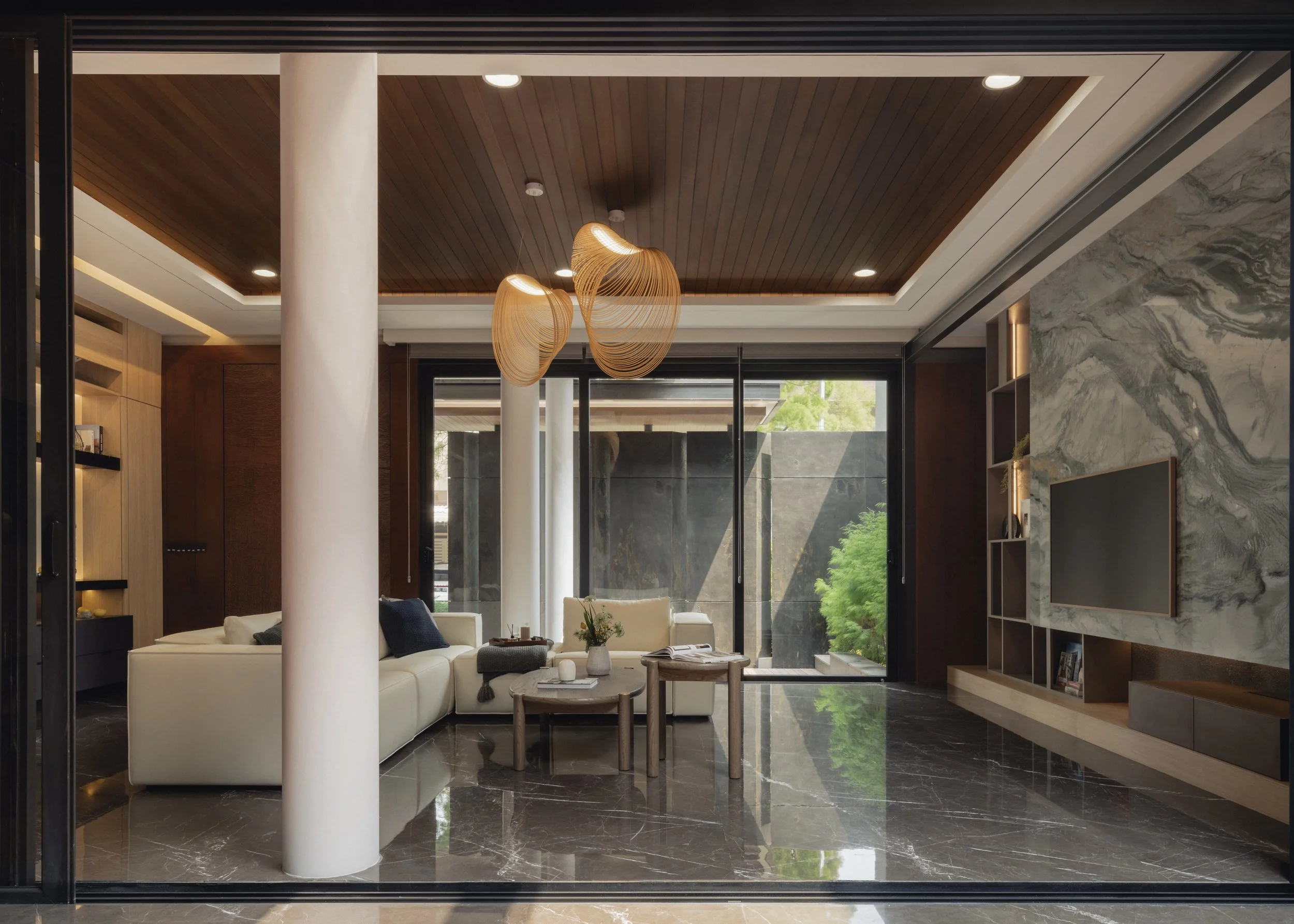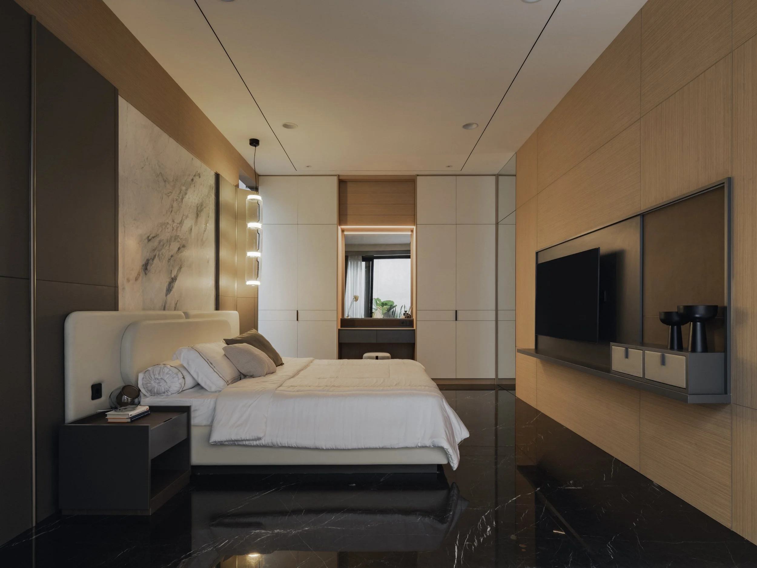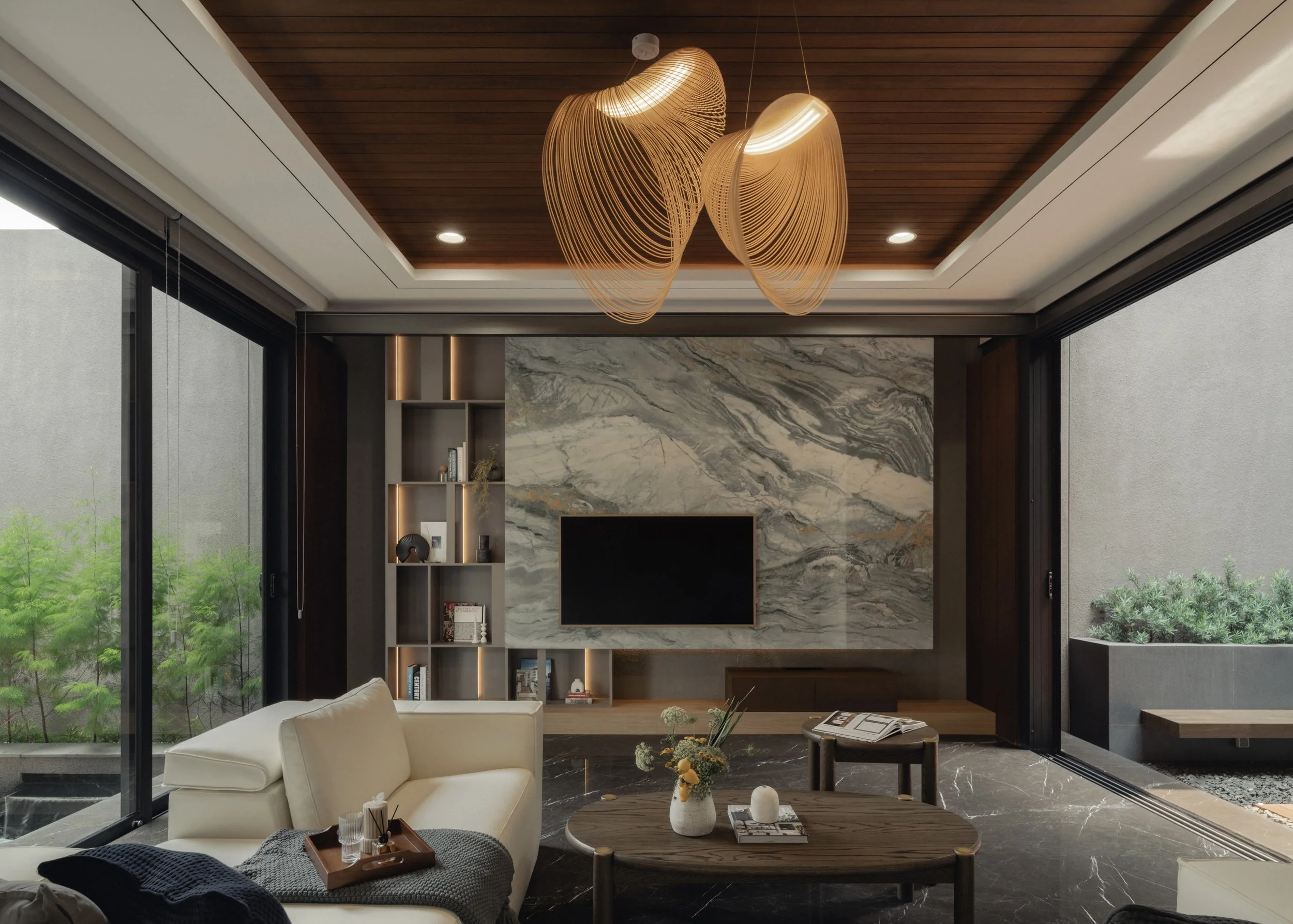 Inside, the material palette leans toward warmth and tactility. Expressive marble with dynamic veining defines key focal points, offering contrast against walnut finishes and dark marble flooring. Stone veneers enhance vertical surfaces with subtle texture while supporting durability for everyday use. Ambient lighting softens each room and amplifies the home’s rich tonal foundation. Every space introduces its own distinct feature — a unique texture, a tailored fixture, or a refined finishing detail — creating a sense of continuity while allowing for quiet surprises as one moves through the home.