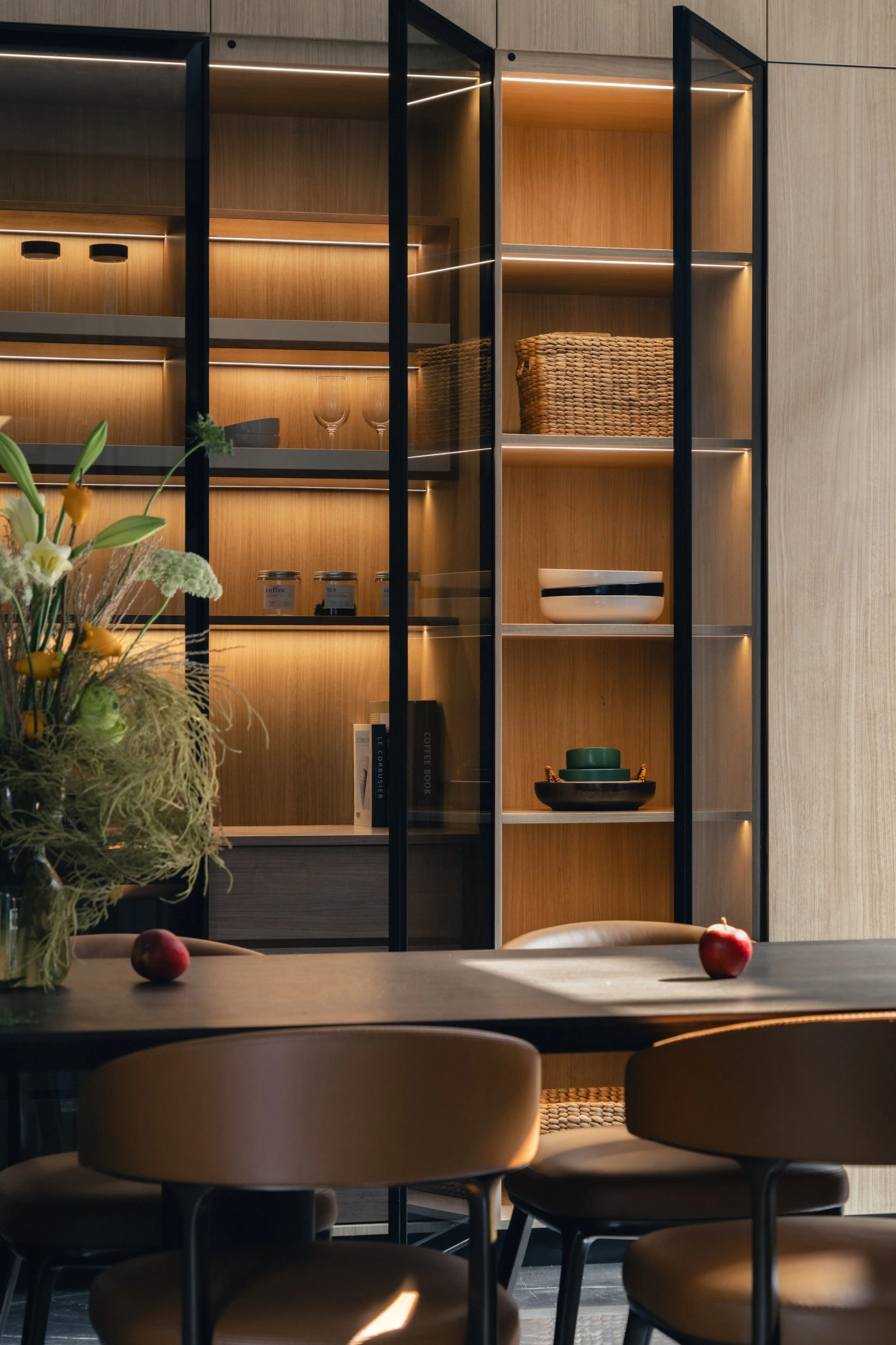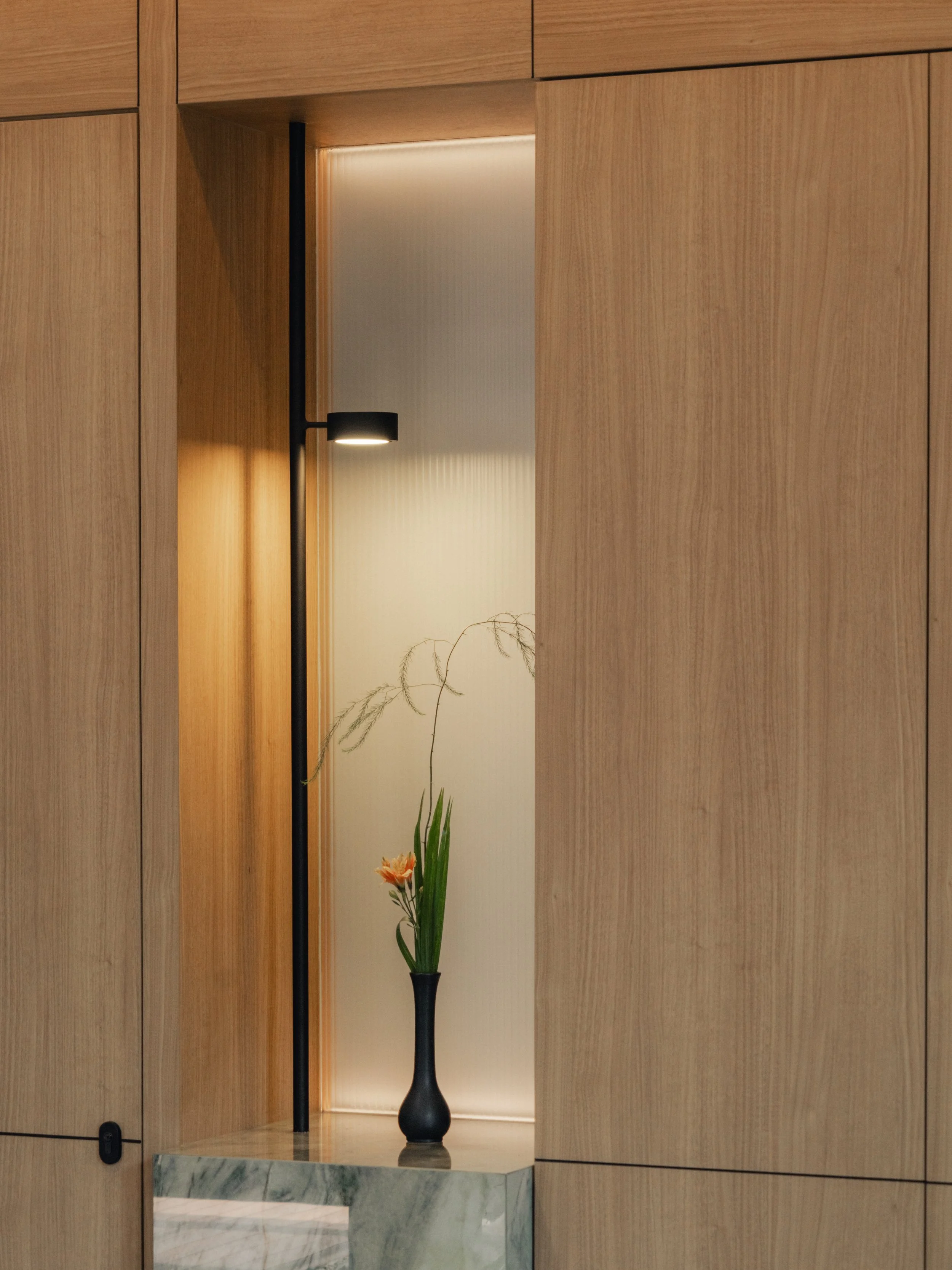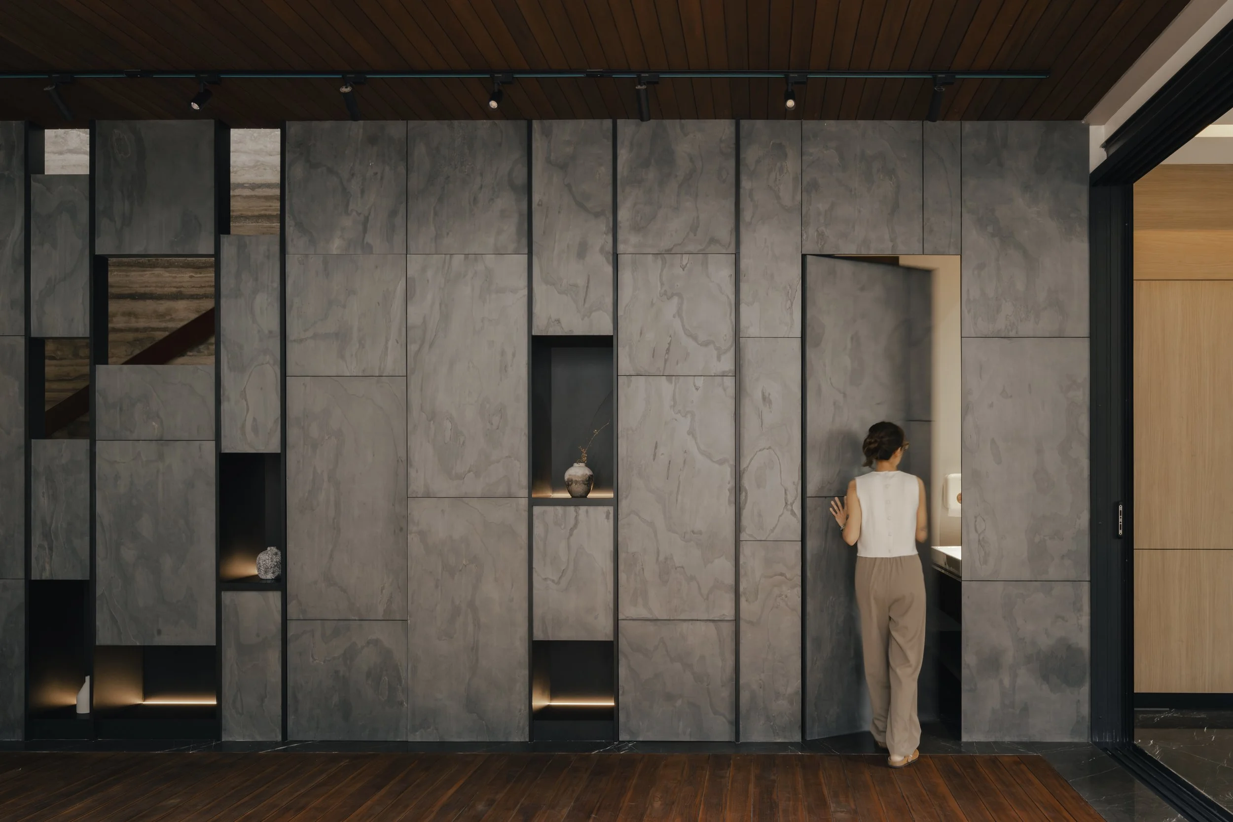 Among the bespoke elements, the staircase partition stands out as a central gesture. Clad in stone veneer, it serves as a sculptural divider facing the courtyard, echoing the material language of the exterior. Integrated storage and a concealed entrance to the powder room sit behind its monolithic appearance, preserving the visual calm of the ground floor. Its placement and finish create a harmonious dialogue between interior architecture and the surrounding landscape.