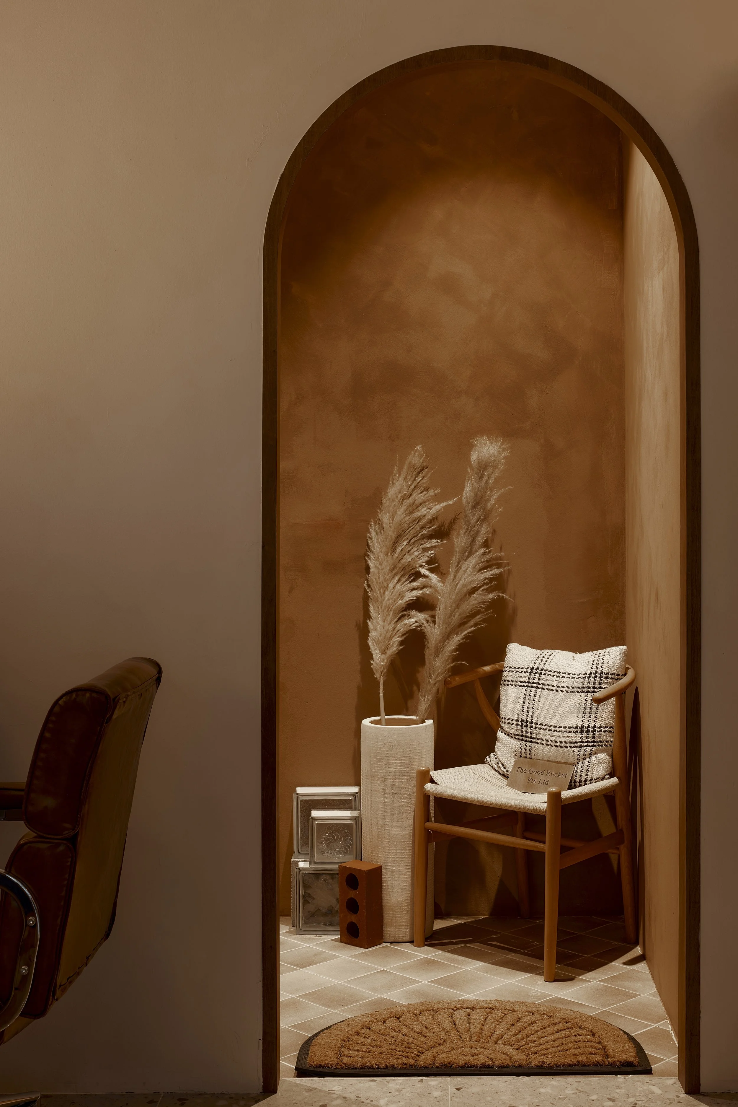 The palette threads authentic luxury with approachable warmth. Prada Green Italian marble introduces a precise, crafted note at touchpoints, its saturated green pairing naturally with rich wood laminate that deepens the room’s sense of tactility. Clean white bouclé in the consultation area nods to Parisian softness, while a glossy terrazzo underfoot keeps the space lively and bright, echoing the veining of stone without tipping into nostalgia. A maroon wall grounds these elements with a personal accent, chosen for its affinity with the overall scheme and its ability to hold shadow and light with equal poise.