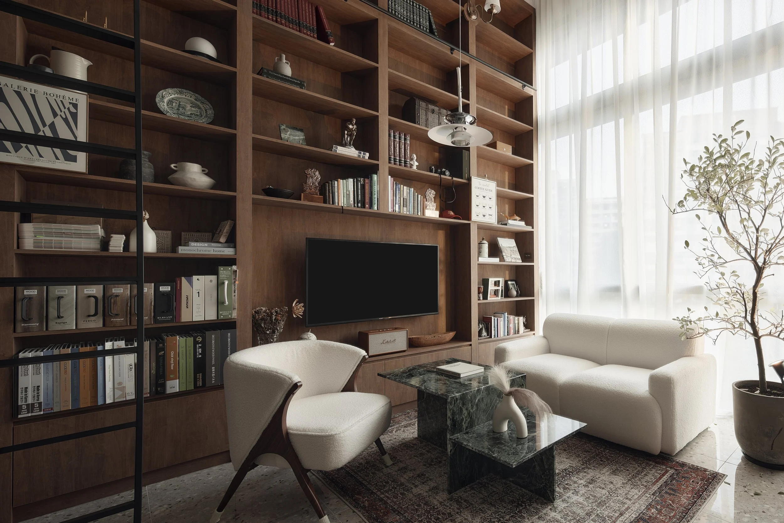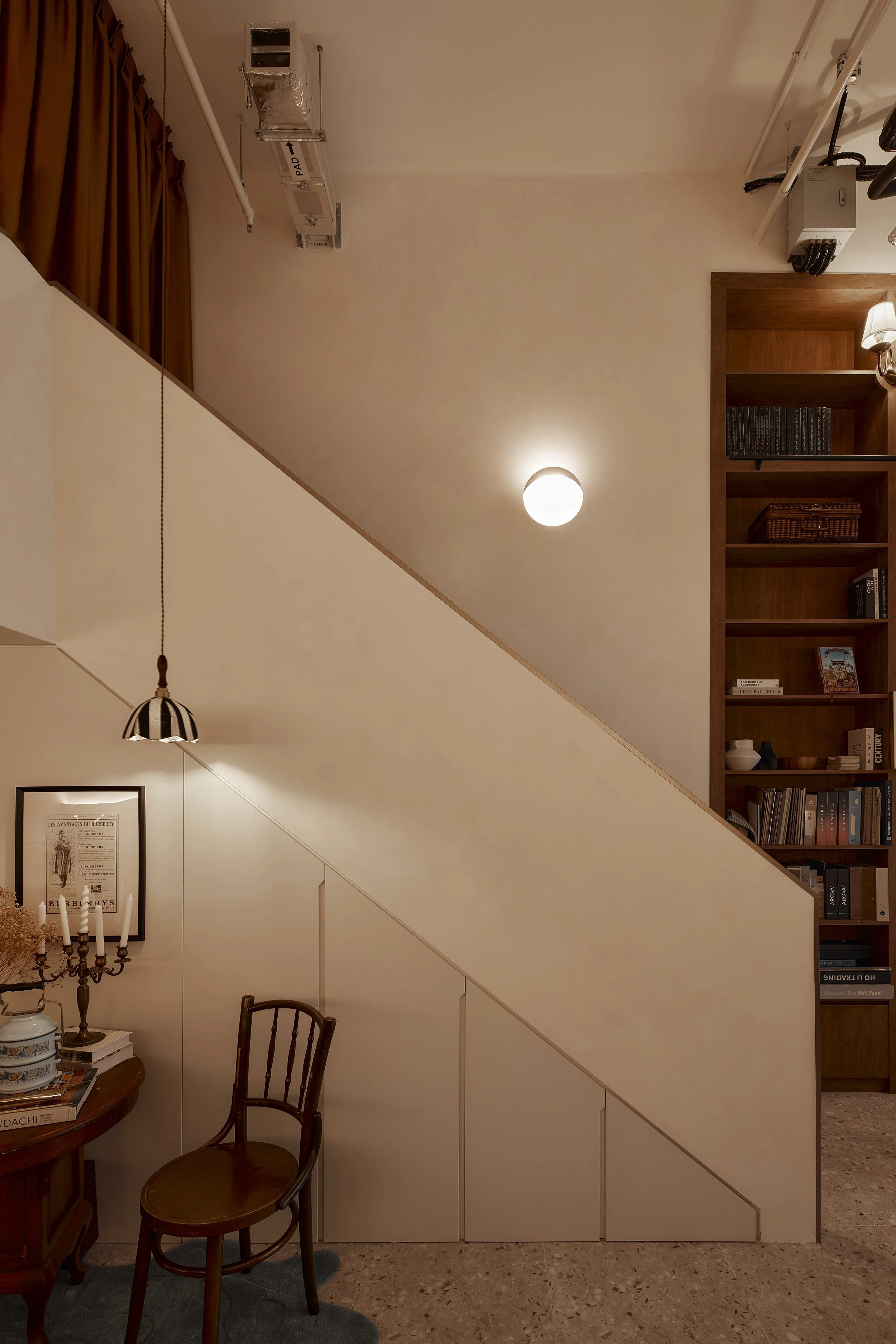 In keeping with the studio’s belief that quality does not always demand a premium, many pieces were sourced via Carousell. The cabinet by the window serves as a compact pantry, a solid timber round table near the stair stages rotating displays, and most wall art is pre-loved—each item adding narrative and patina.