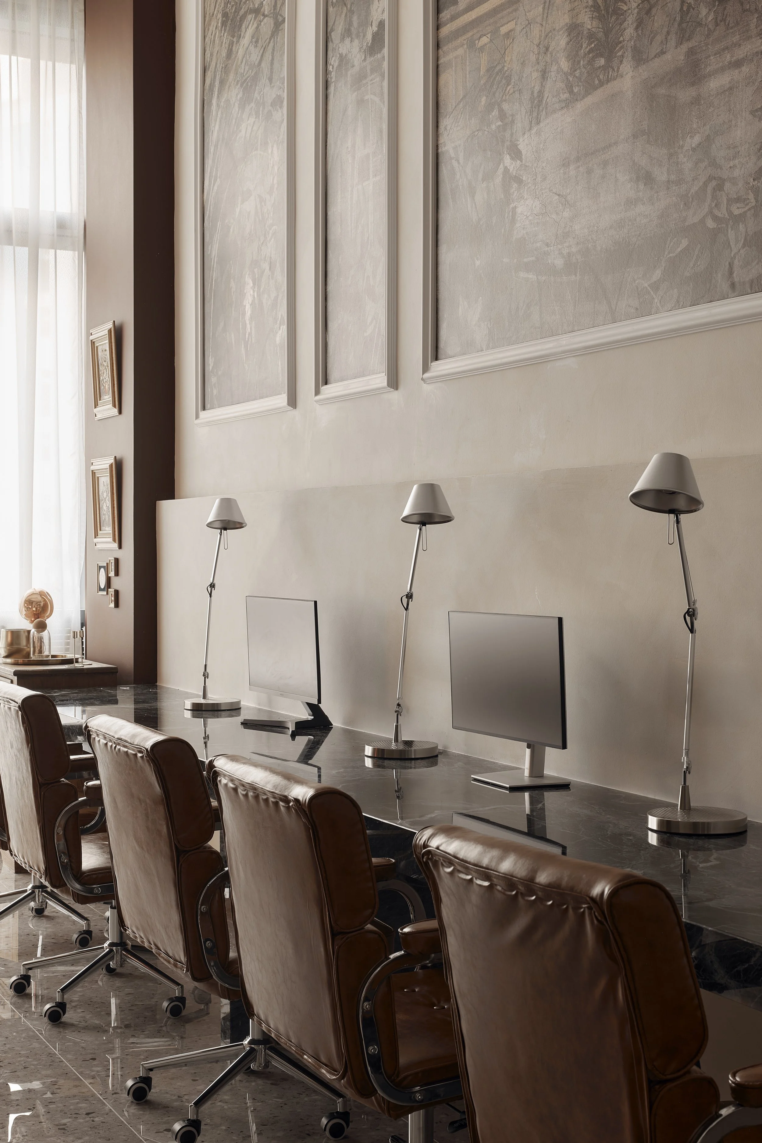 Lighting follows function across zones. An LED strip running almost the full right wall provides even illumination for the workstations. High-mounted wall lights on the bookshelves create a soft, atmospheric glow that suits meetings and evenings. A black‑and‑white pendant near the stair adds a playful, French‑inflected note and echoes the studio’s logo colours. The combination supports both focus and conviviality, keeping glare low and textures legible. The generous height and material choices mitigate echo, while soft furnishings and books further temper acoustics for conversation.