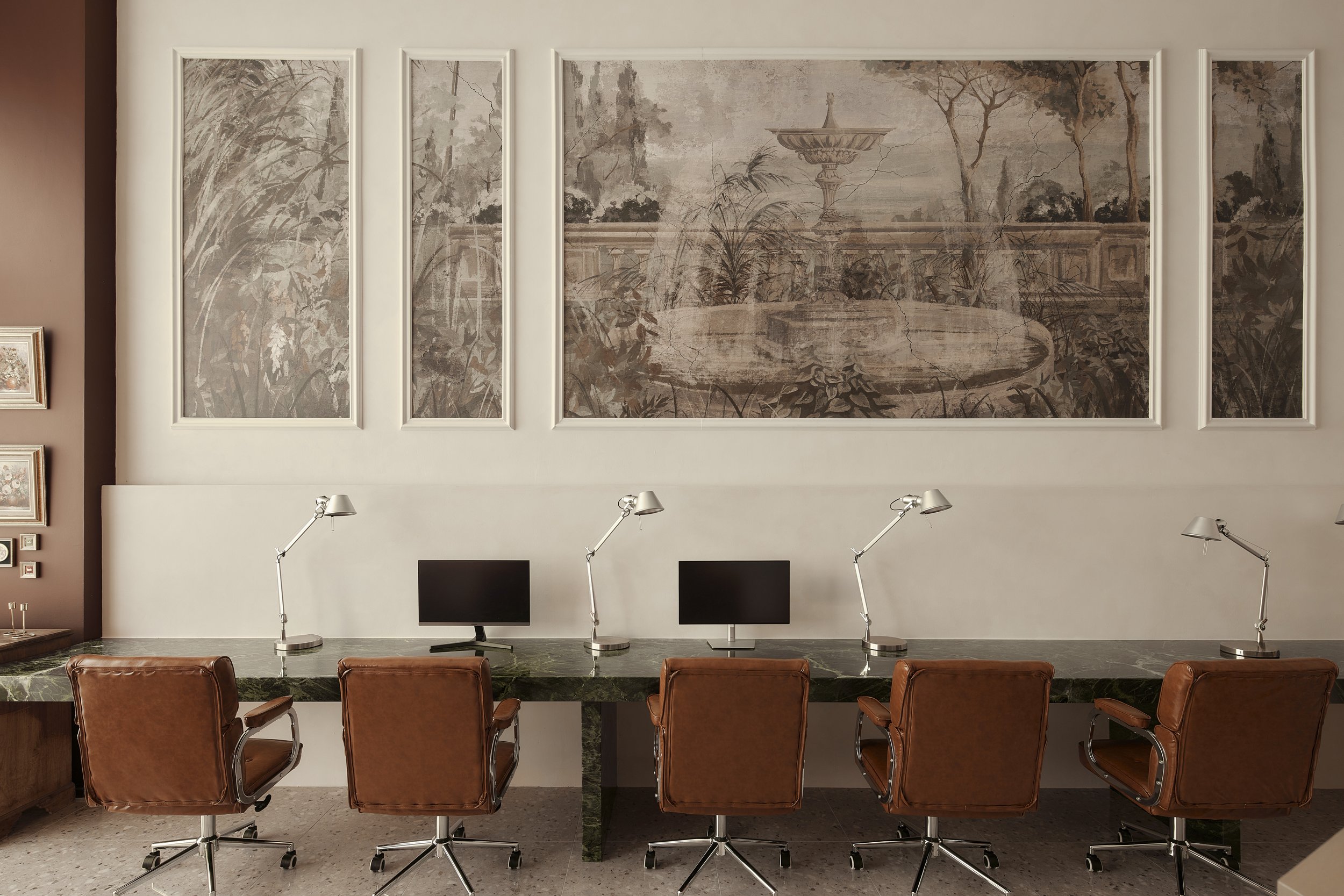 Drawing on a recent trip, founder Jeremy notes, “I had just returned from London and Paris, inspired by both cities’ attention to detail, the use of bold colours, and the beautiful and carefully thought‑out moulding,” which is translated into a compact vertical volume: a tall, dark bookshelf leverages the 5‑metre height, while beading and a large‑format wallpaper articulate the 8‑by‑5‑metre wall above the work desk. The wallpaper—lush greenery and a fountain—nods to Singapore’s garden city identity and pairs deliberately with green stone, while rounded lighting elements counter the rectilinear joinery and stair, softening edges and lending a salon‑like glow after dusk.