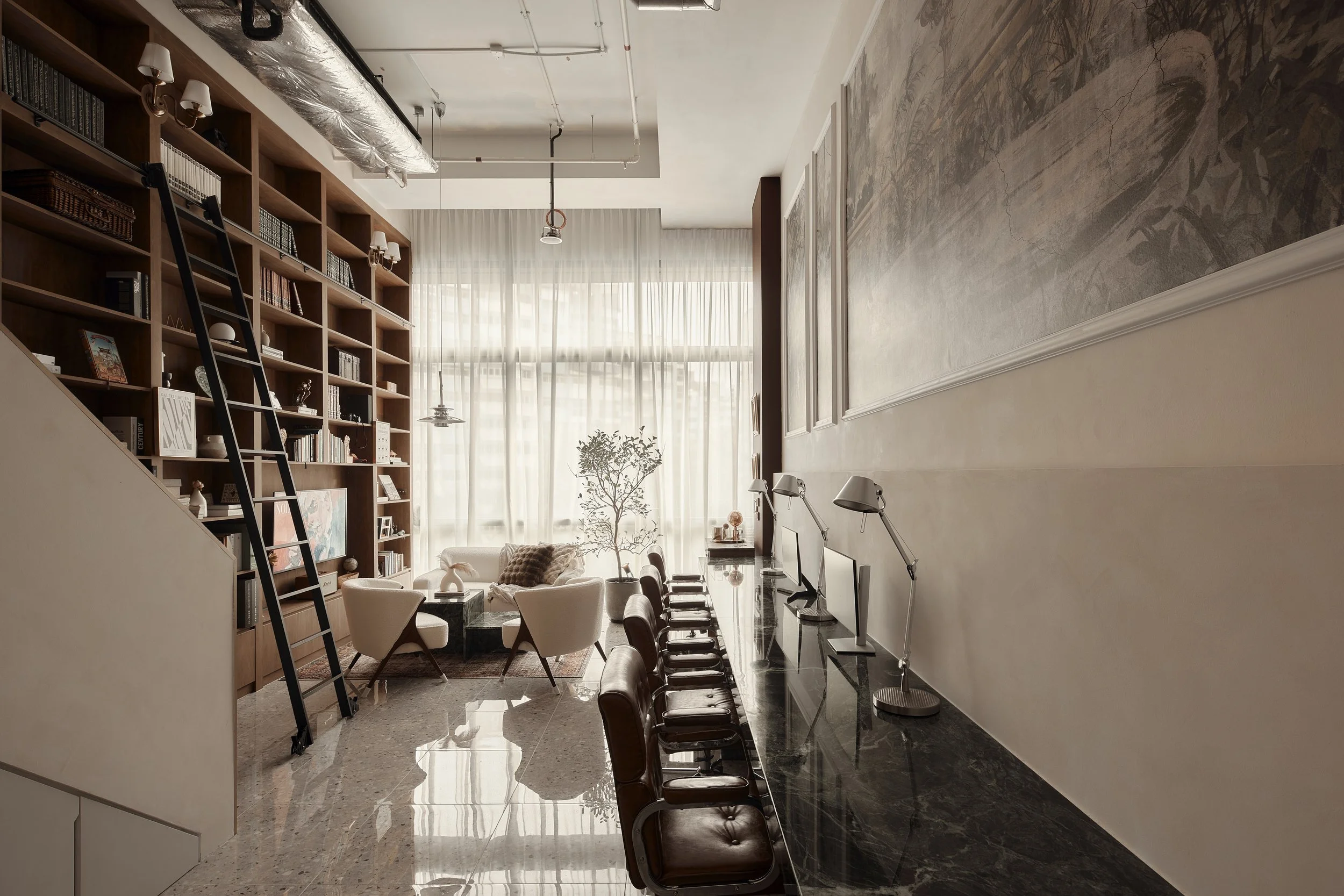 The office is designed to host clients as easily as it serves production. Seating is expanded without crowding the floor, consultation happens in the brightest zone by the windows, and samples are organized under the loft to keep the eye line calm. The entry foyer clarifies etiquette and brings a small ritual to arrival. Altogether, the environment is purposeful, warm, and ready for growth—an everyday space that reflects RENOSTUD.IO’s philosophy from concept through to the last detail.