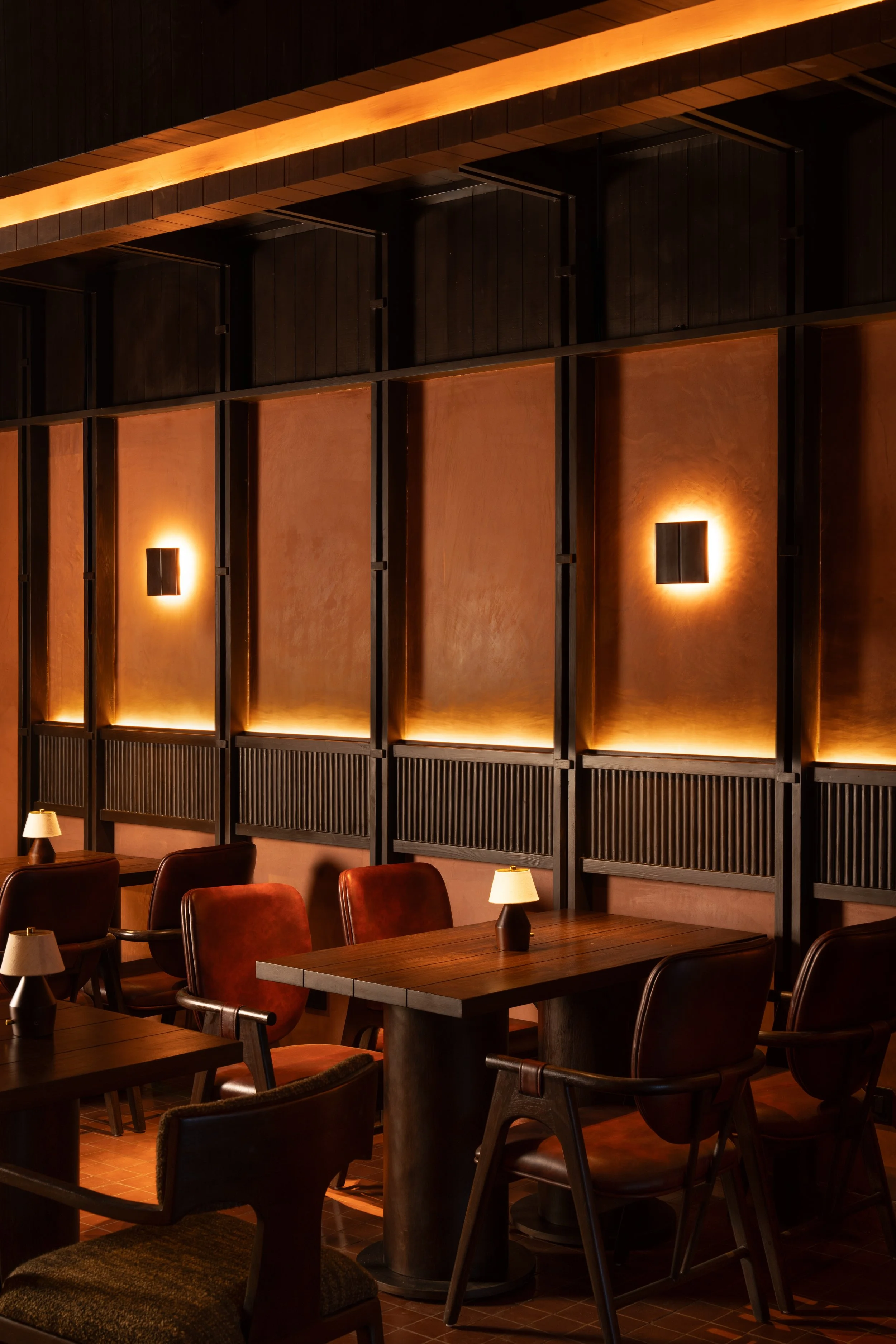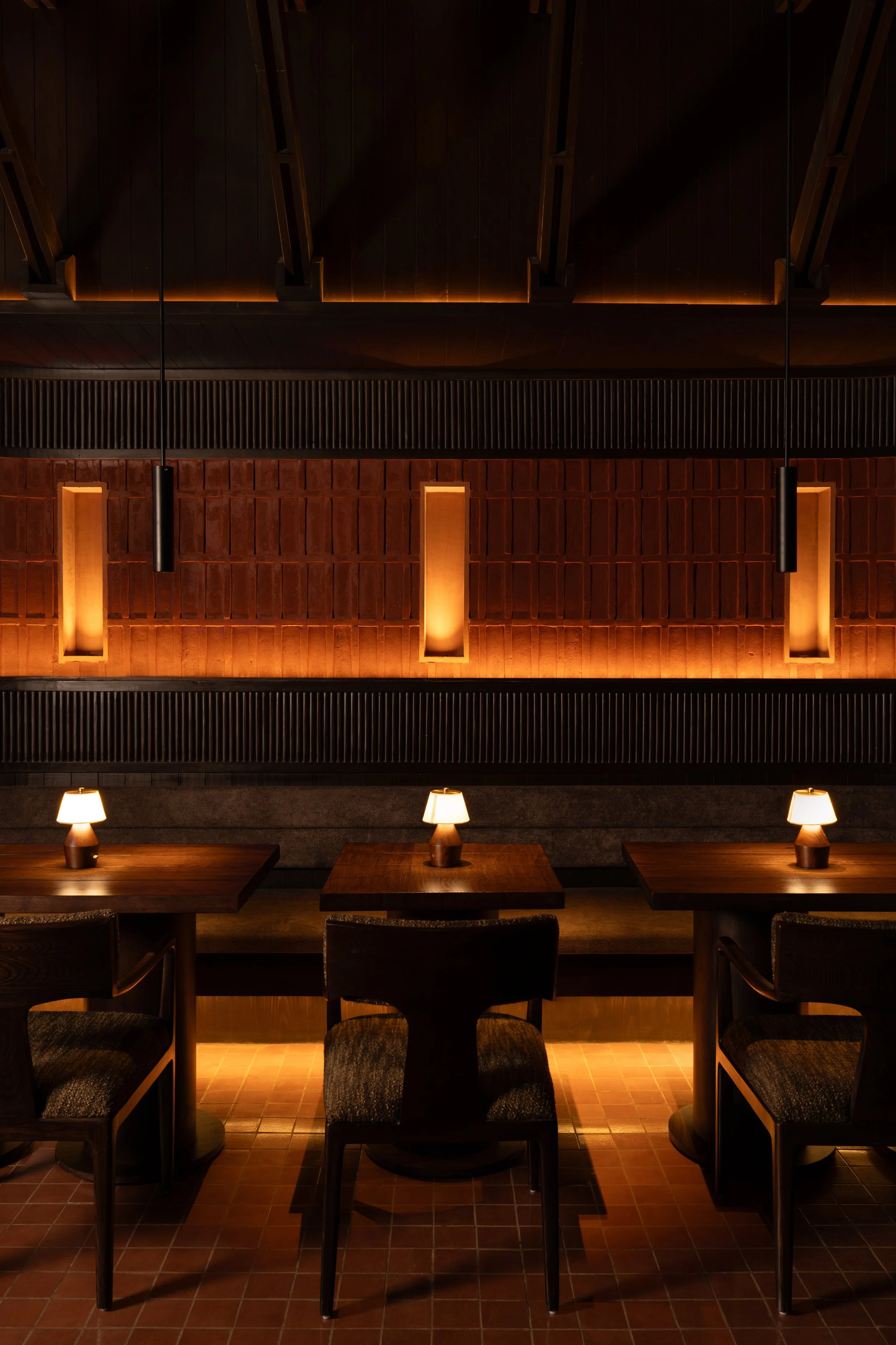 RENESA created custom terracotta brick modules specifically for She’s Here, using fluted relief to generate depth and shadow. Under low amber lighting, these surfaces become tactile and acoustically soft, absorbing sound and reducing visual distraction. The palette remains restrained, leaning into burnt umbers, oxidised browns, and charred blacks so that illumination, not colour, carries the primary expressive weight. The architecture stays quiet, allowing repetition, shadow, and depth to reveal its character over time.