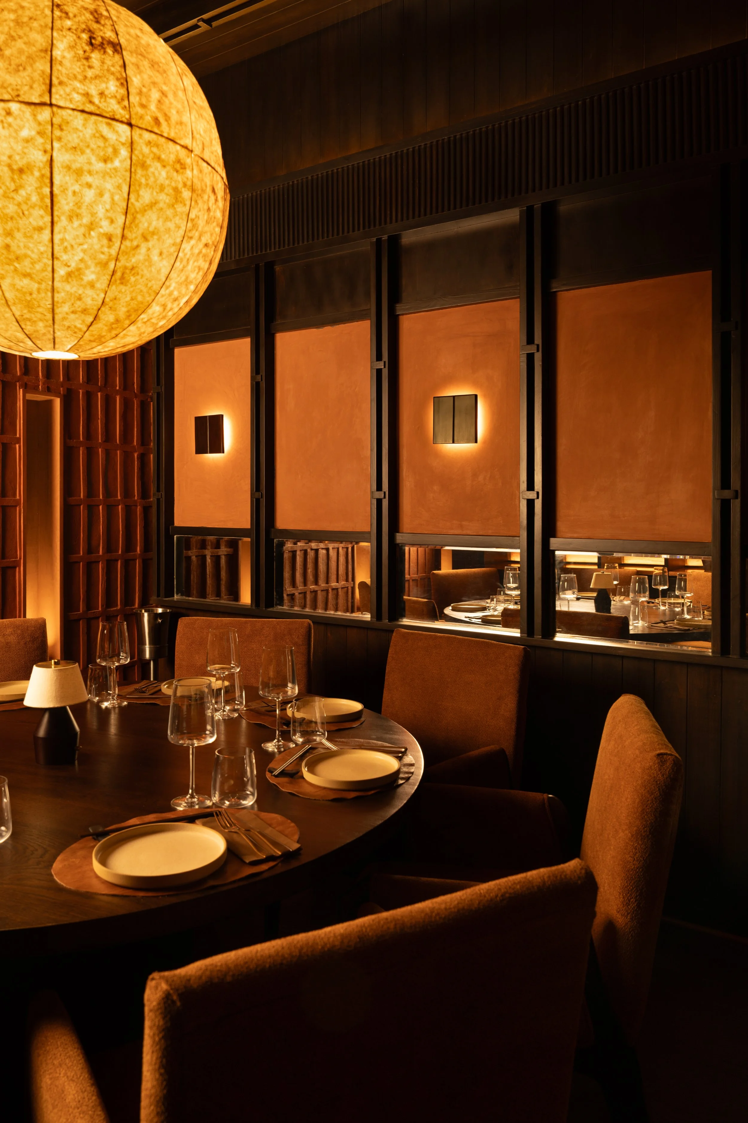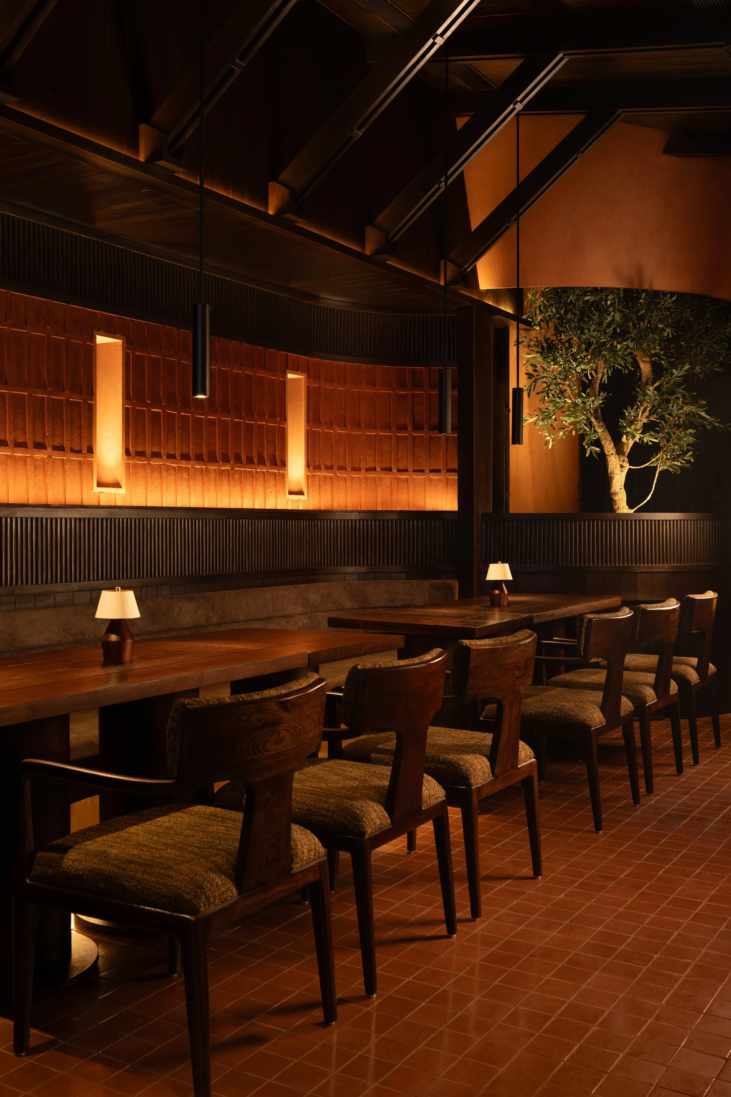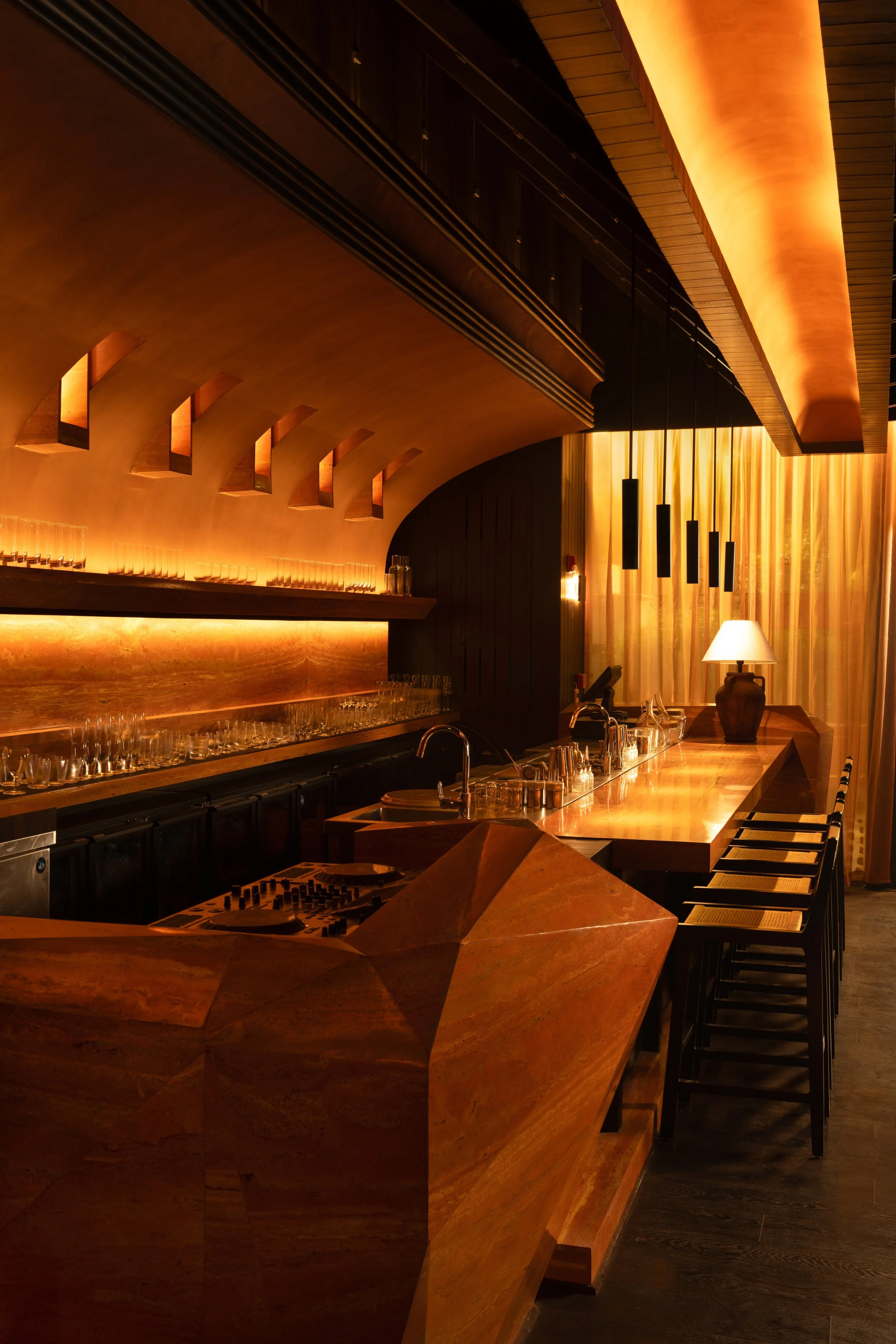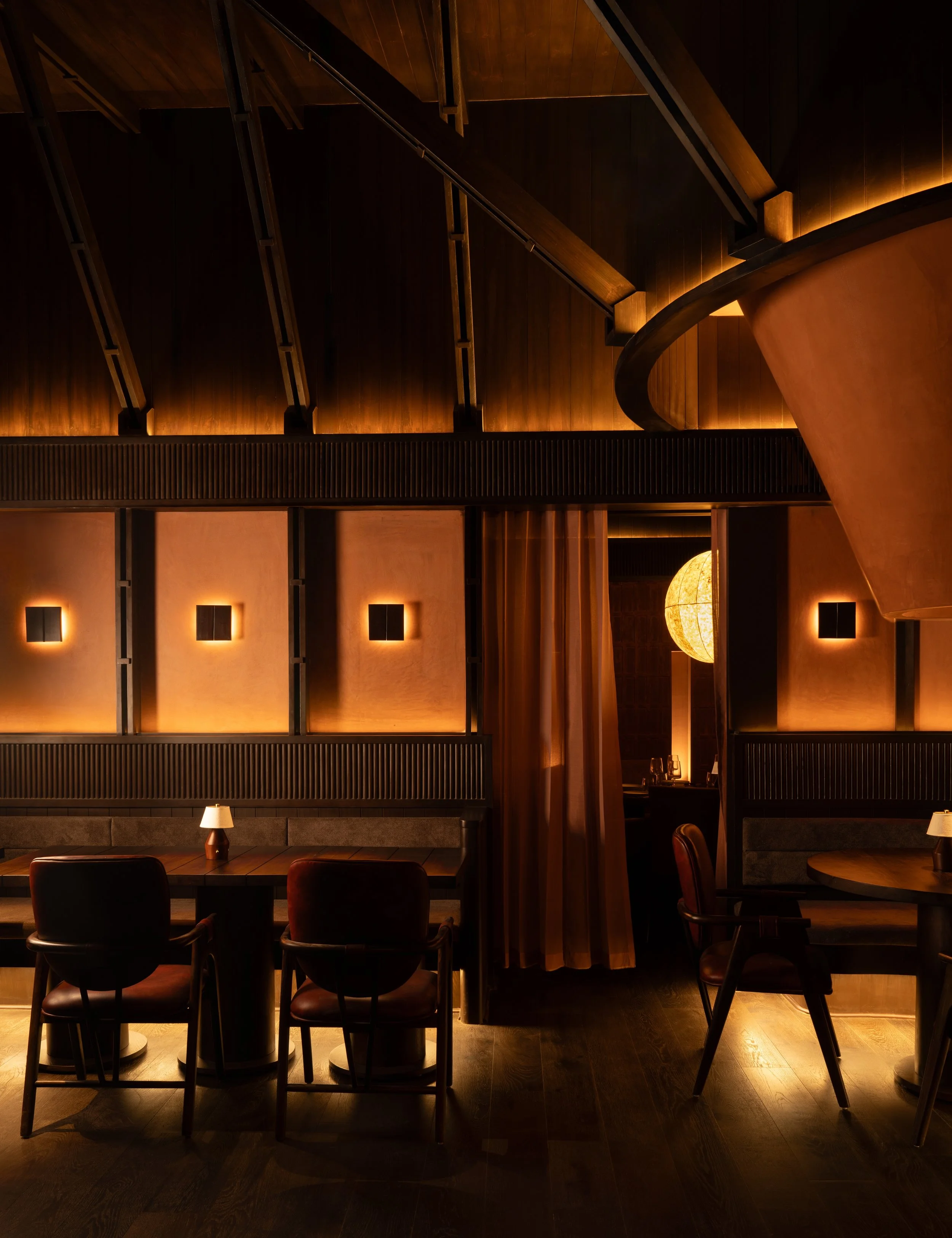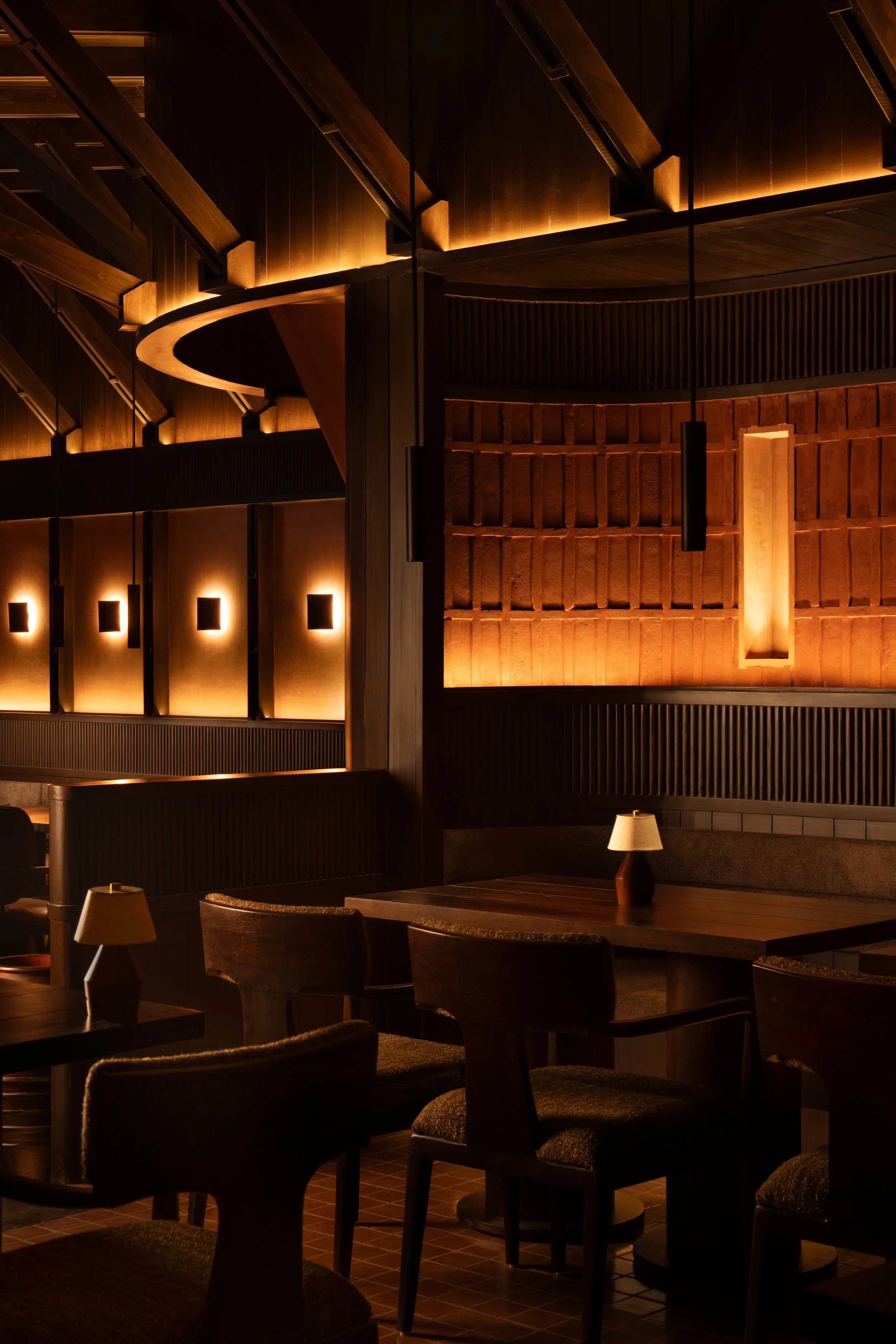 Concealed coves follow the ceiling’s curvature, while pinhole apertures punctuate clay-plastered walls with small pockets of warmth. Cylindrical pendants drop in measured intervals, directing attention to key surfaces without disturbing the room’s composure. The brightest points are reserved for the table setting, keeping the act of dining as the main ritual within the architectural envelope.