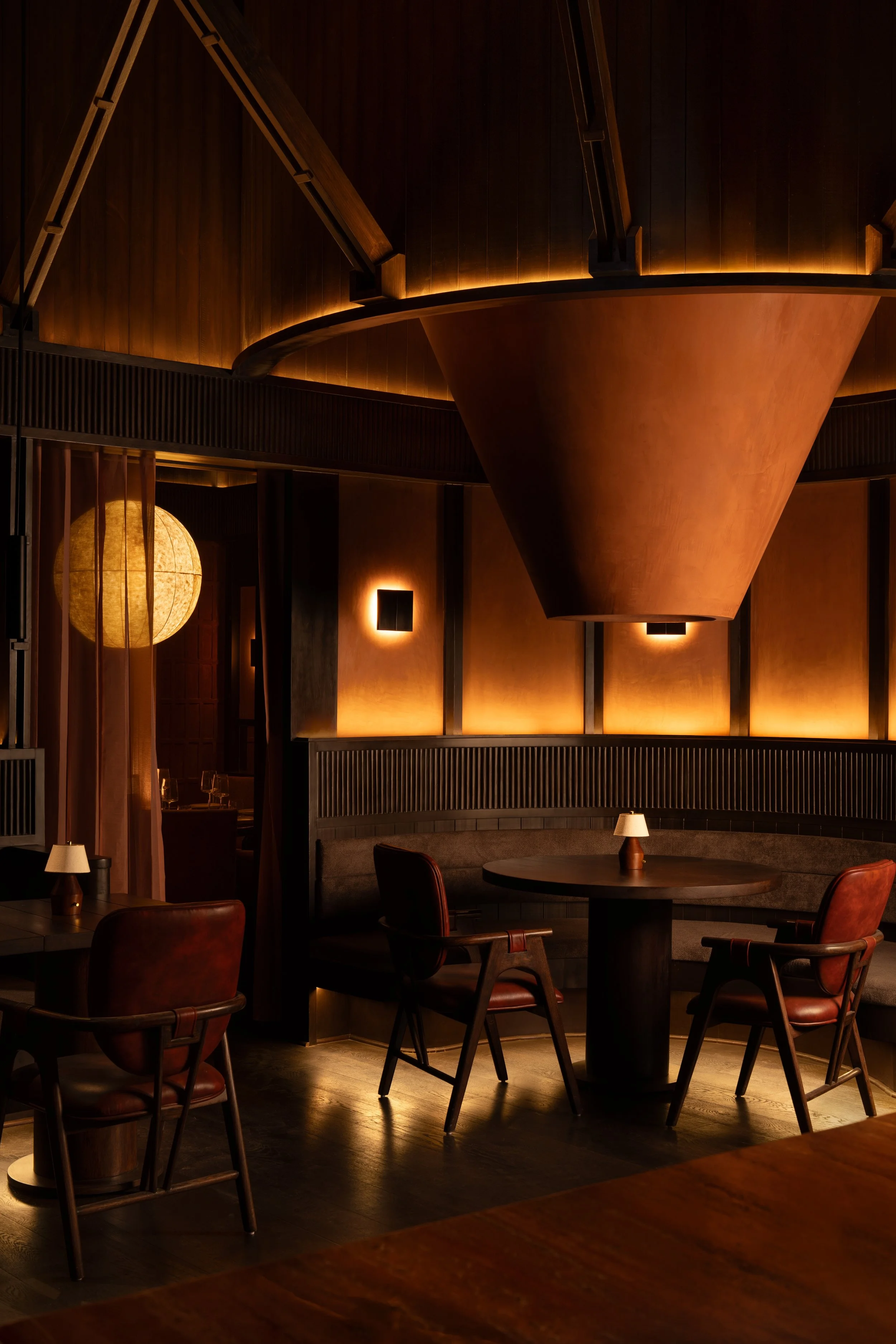 The interior reads as a continuous spatial sequence, with circulation and seating braided into a single composition. Curved banquettes trace the perimeter, shaping pockets of intimacy without fully separating diners from the room’s social energy. At the centre, a sculptural bar acts as the project’s anchor and point of orientation. Above it, a hovering terracotta canopy sits like an inverted vessel, establishing a clear landmark while gathering the room’s movement around a defined gravitational core.
