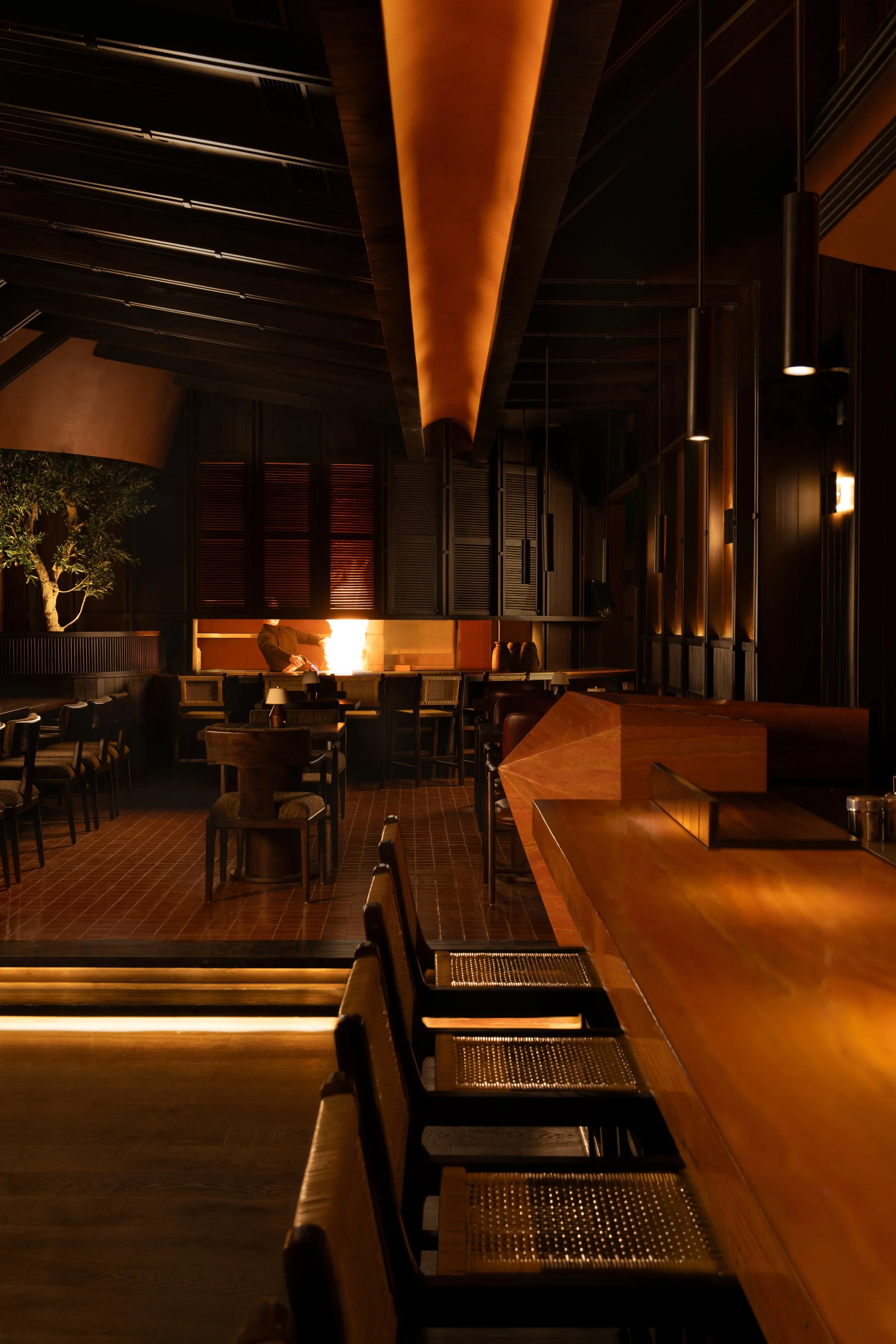 The culinary programme continues the same ethos. Contemporary Japanese cuisine, shaped by fire, fermentation, and reduction, is prepared in visual dialogue with the dining room. Behind the bar, glimpses of flame and craft reinforce the sense that food and space operate as a single experience, with movement and making forming part of the atmosphere.