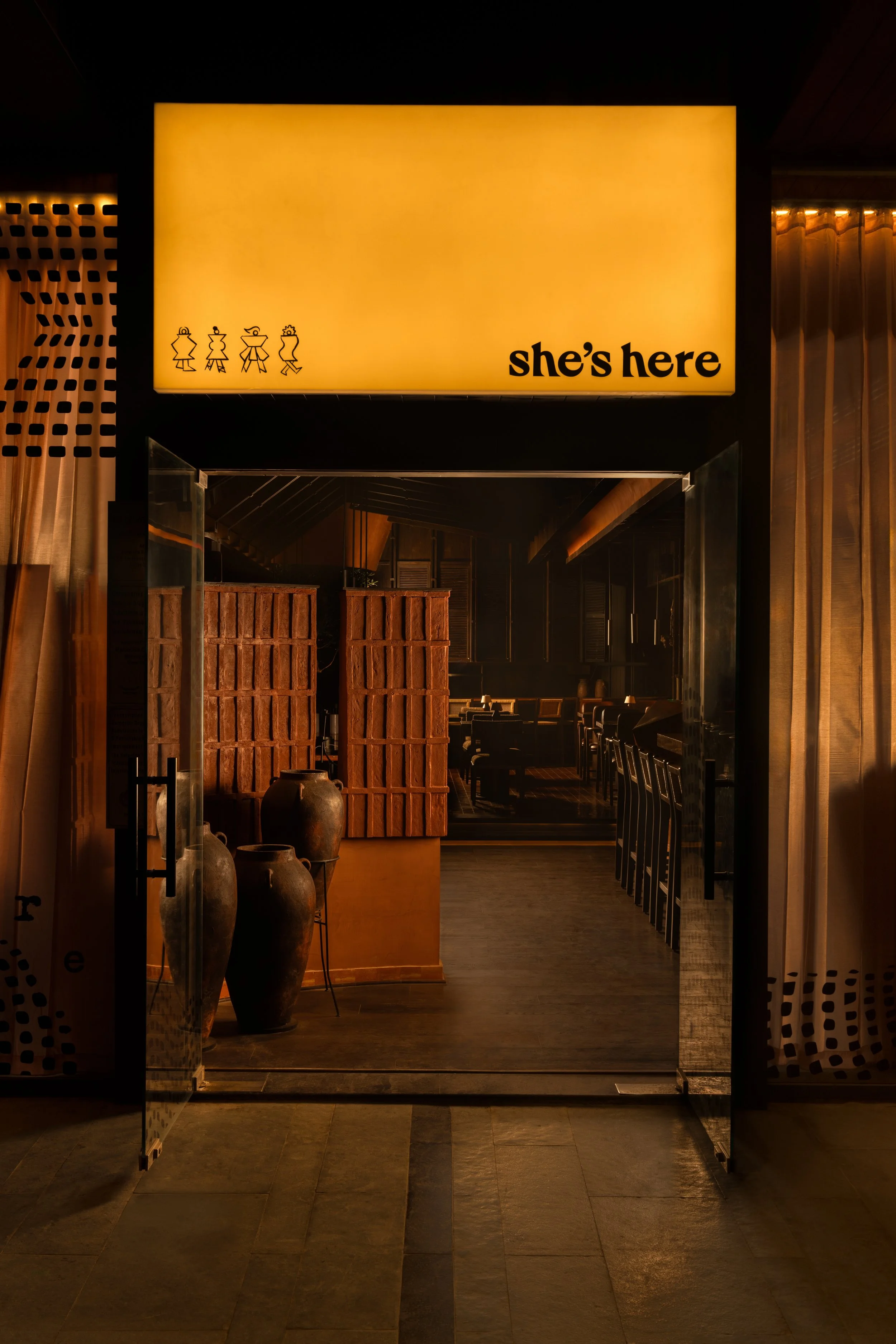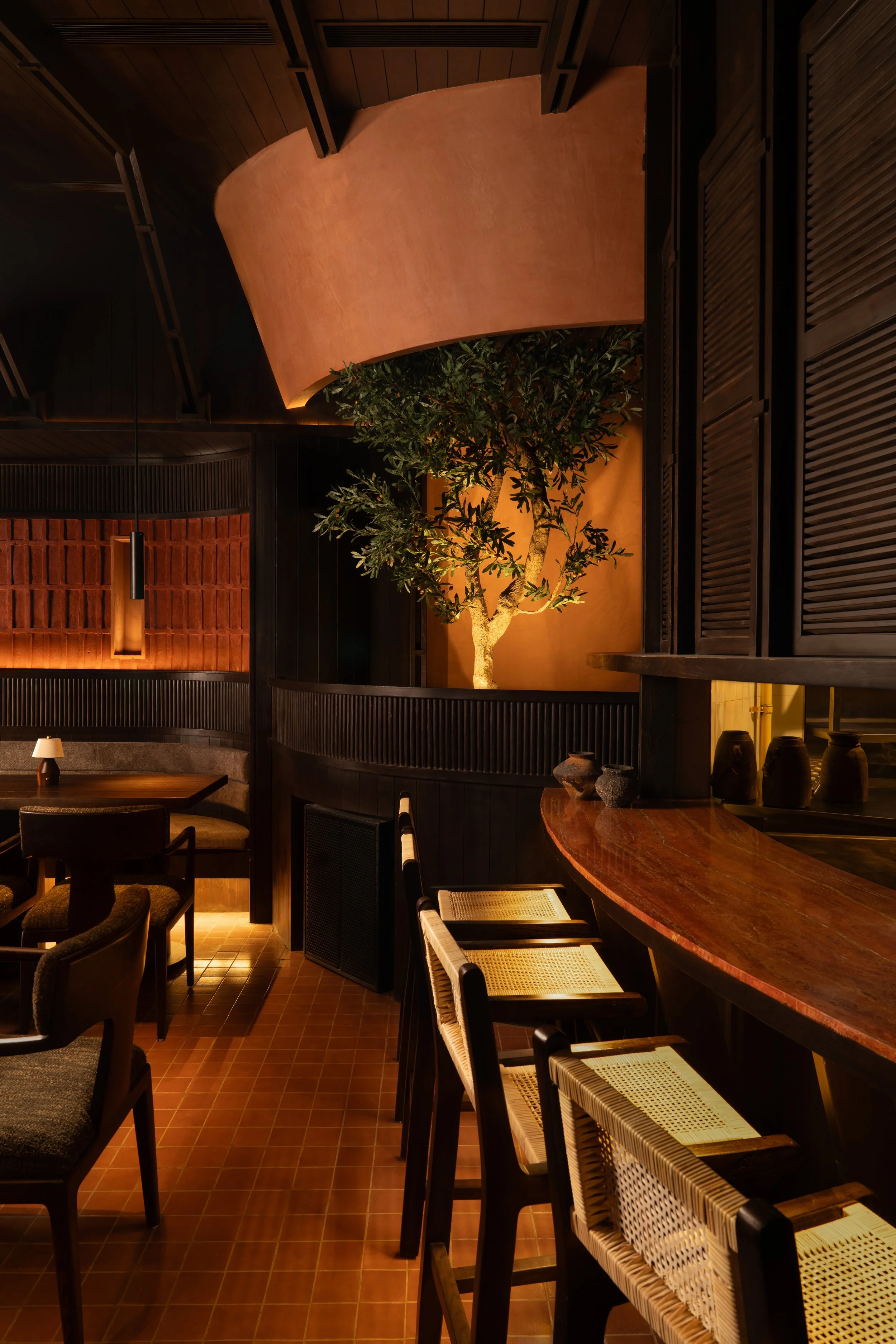 Conceived in dialogue with RENESA’s earlier project, CallMeTen, the restaurant carries forward a shared architectural DNA while shifting the emotional temperature of the space. Where its counterpart drew on darkness and mineral weight, She’s Here turns to terracotta, earthen plasters, and layered timber volumes to build warmth through surface, proportion, and carefully controlled light.