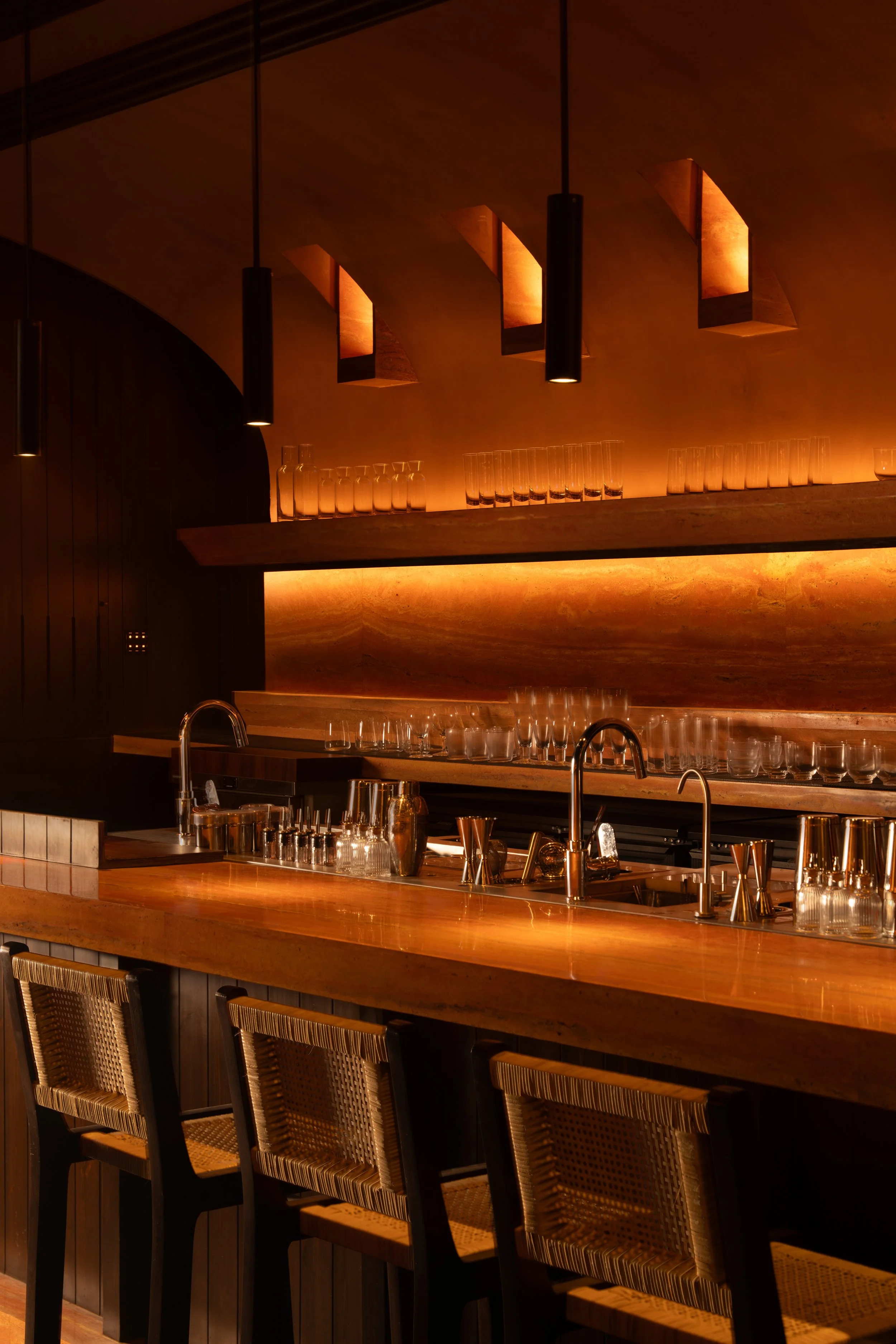 Bespoke furniture completes the project’s architectural grammar. Low timber tables, cane-backed bar stools, curved banquettes, and leather lounge chairs echo the interior’s proportions and soften the room through touch. Details are resolved with restraint: wood grain remains visible, brick stays raw, and metals are brushed, not polished. The intent is a space that can mature with dignity, gaining depth through use rather than chasing a pristine finish.