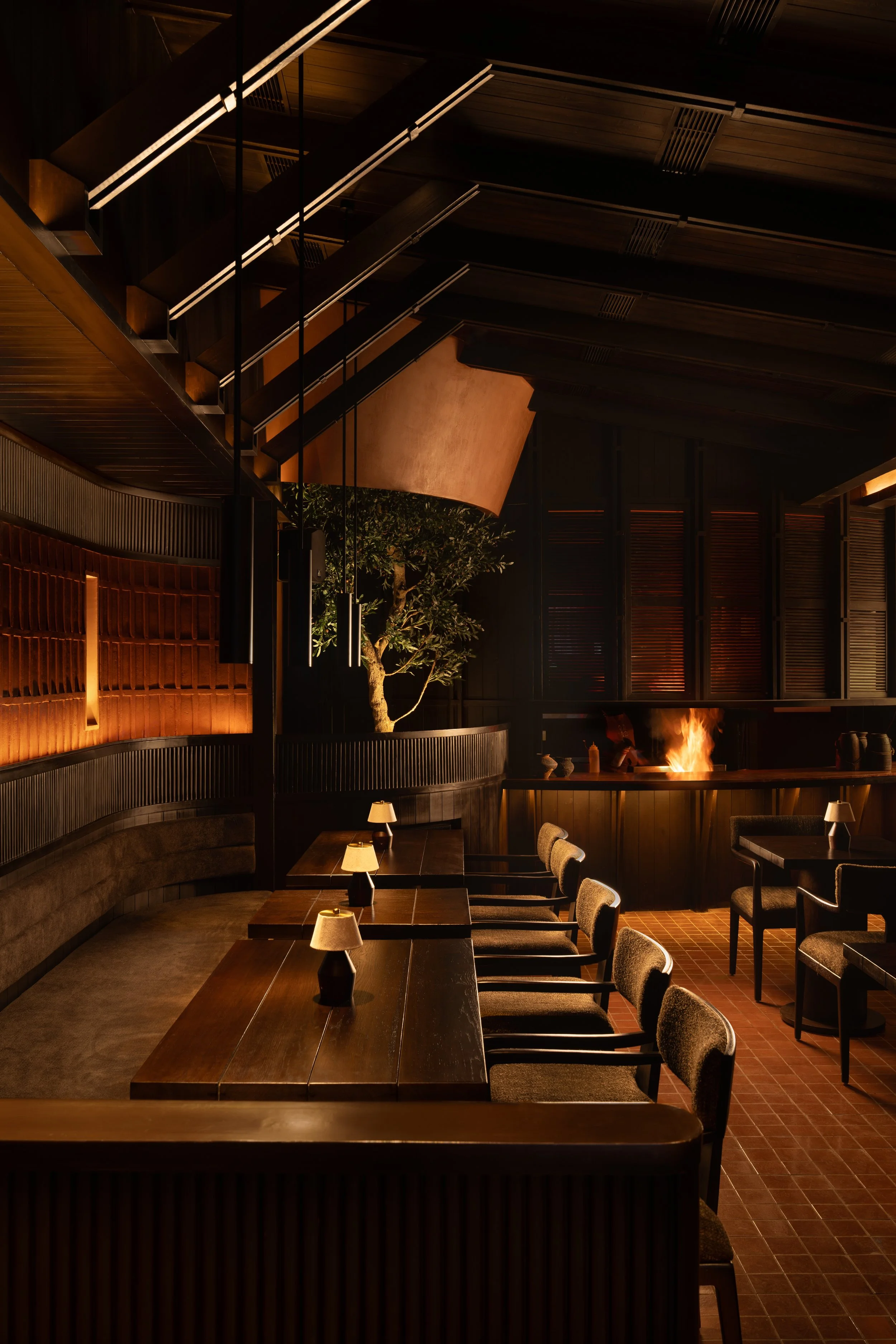 A living tree is integrated beneath the central canopy, rising through a circular opening as if rooted inside the building itself. This singular gesture introduces an organic interruption within the crafted interior, bringing tension and stillness into balance. It reads as a pause within the space, a reminder that life remains imperfect and unscripted even in tightly controlled environments.