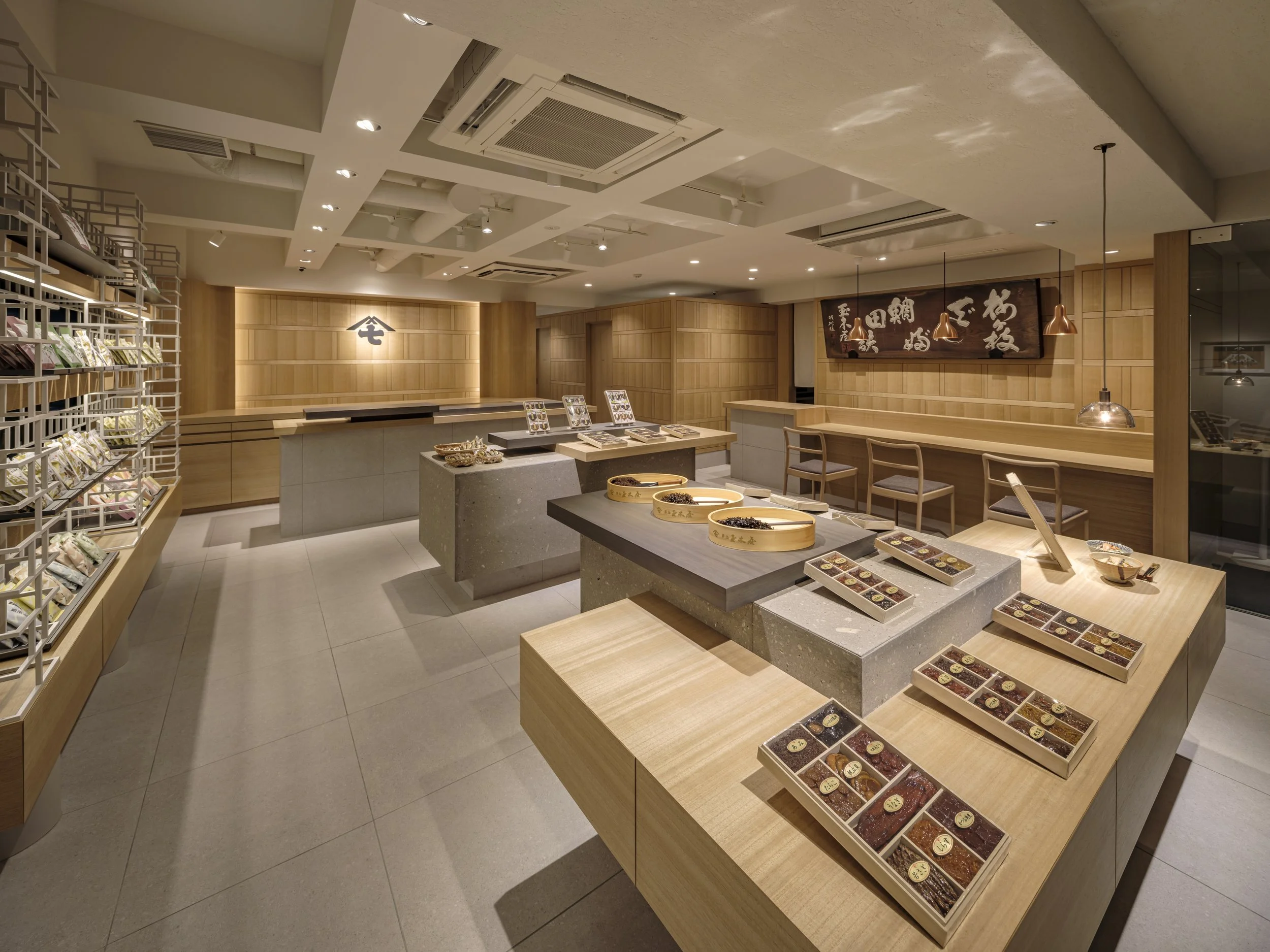 Materiality anchors the design in the brand's history. Paulownia wood, traditionally used to store and sell tsukudani in boxes, appears across walls, counters, and display units. The proportions of these elements subtly reference the partitions of such boxes, tying the contemporary interior to its historic roots. Fixtures rest on stone bases, their subdued tones complementing the warmth of the timber. Pale-coloured floor tiles, inspired by Edo-period illustrations of the store, are GREENGUARD-certified, reflecting a commitment to environmentally conscious choices.