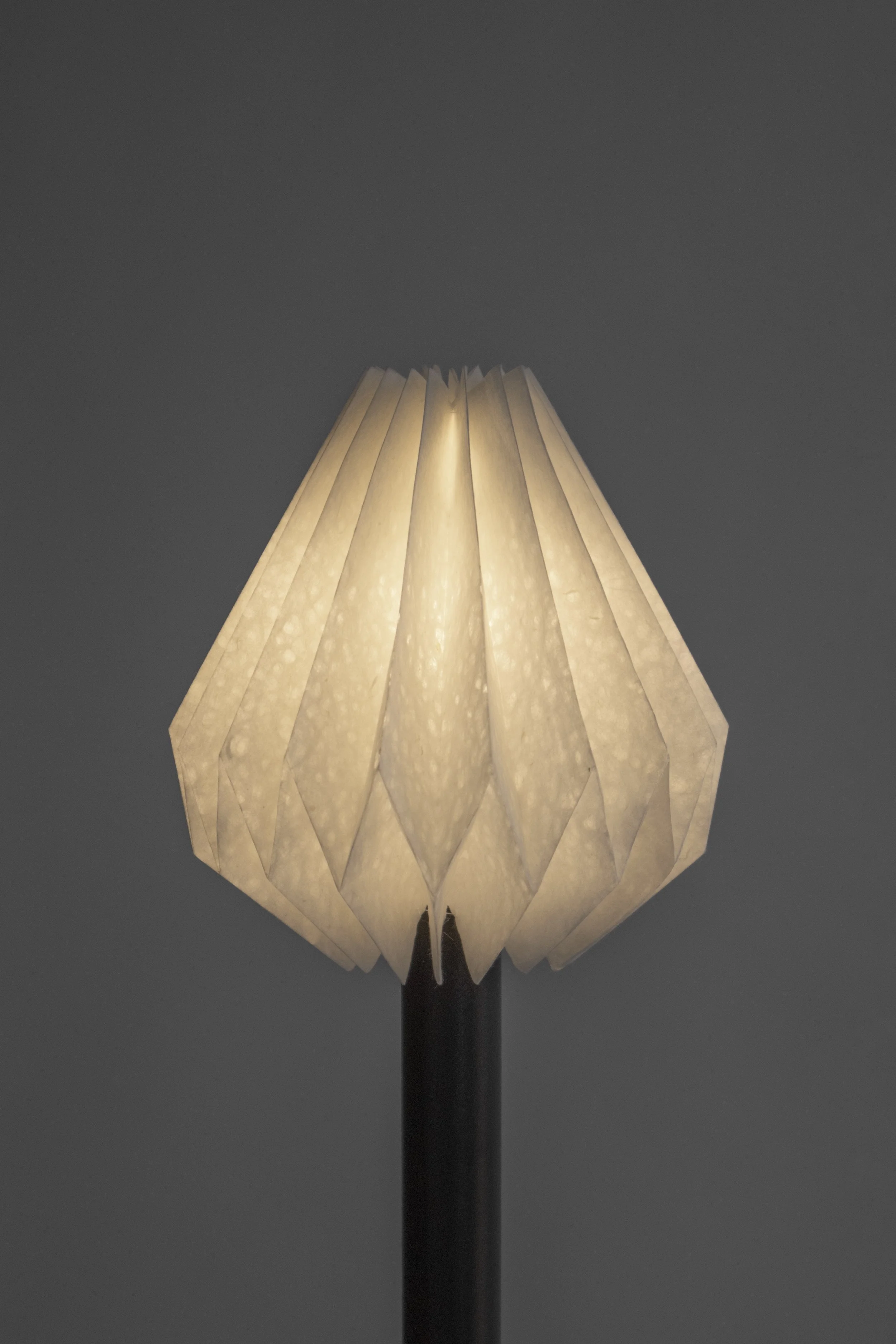 Each of Gabriel's lighting pieces was made using handmade washi from Nao Washi, a 300-year-old family-run paper mill in Saga, Japan, where Gen Taniguchi was also the 7th-generation owner. The Flag series drew from nautical references, with floor and wall lamps that used dual washi scrolls to suggest sails in motion. In contrast, Obelisk presented monolithic, asymmetrical columns of light, where washi wrapped over hinoki wood structures like glowing towers. Carnation, a tribute to Portugal's 1974 Carnation Revolution, reimagined rifles as peaceful symbols, with pleated washi lampshades that resembled delicate flowers.