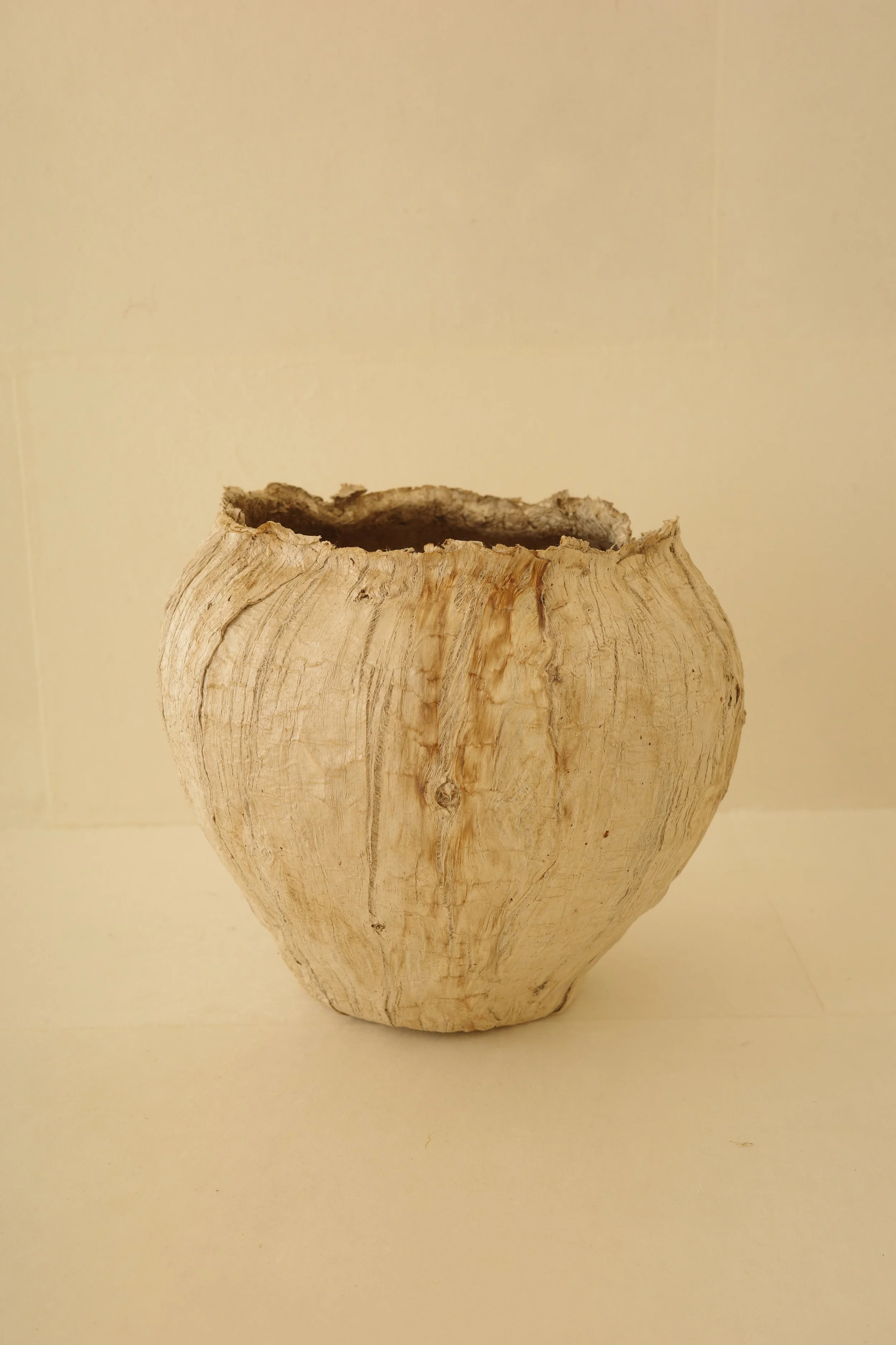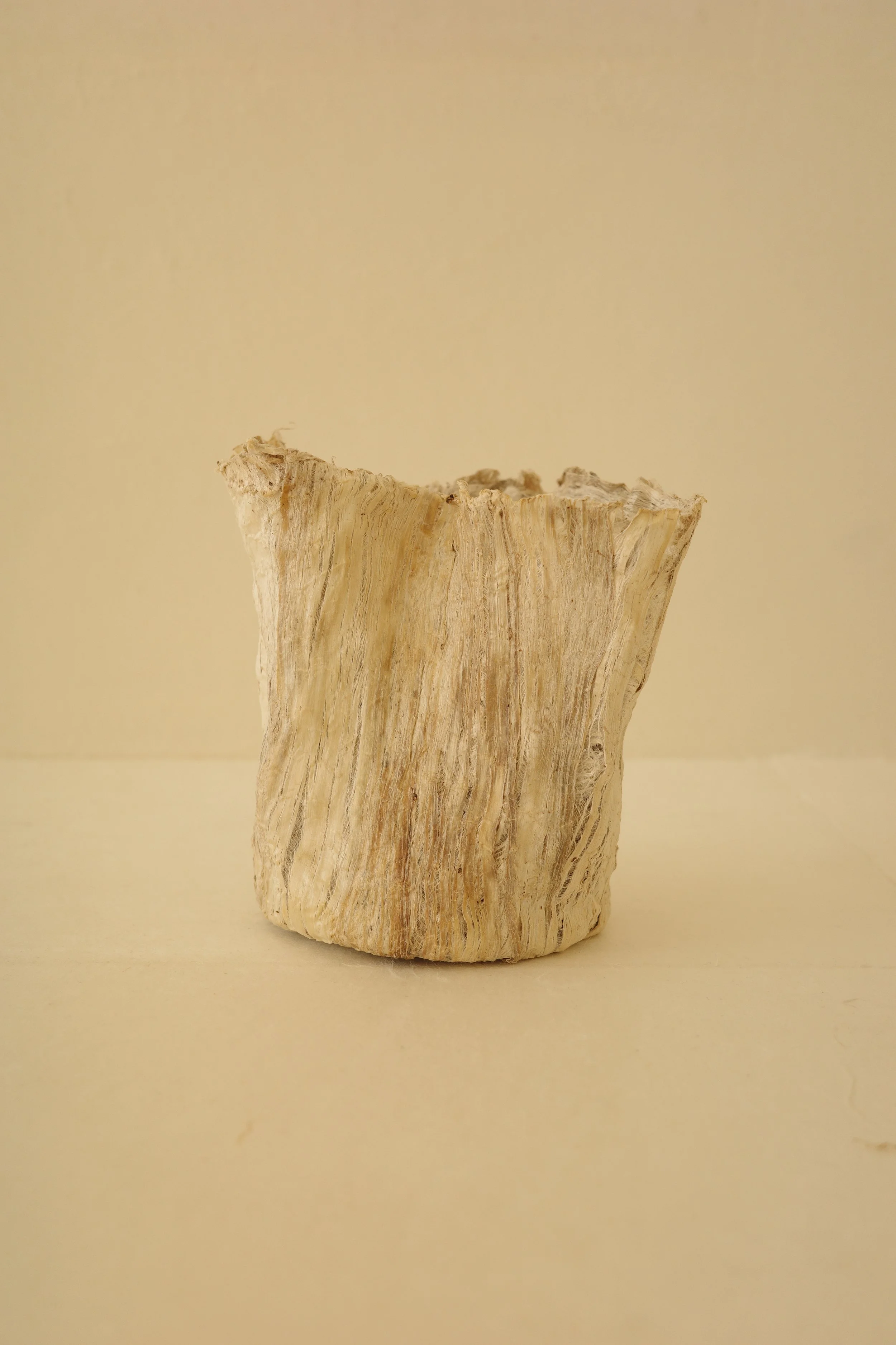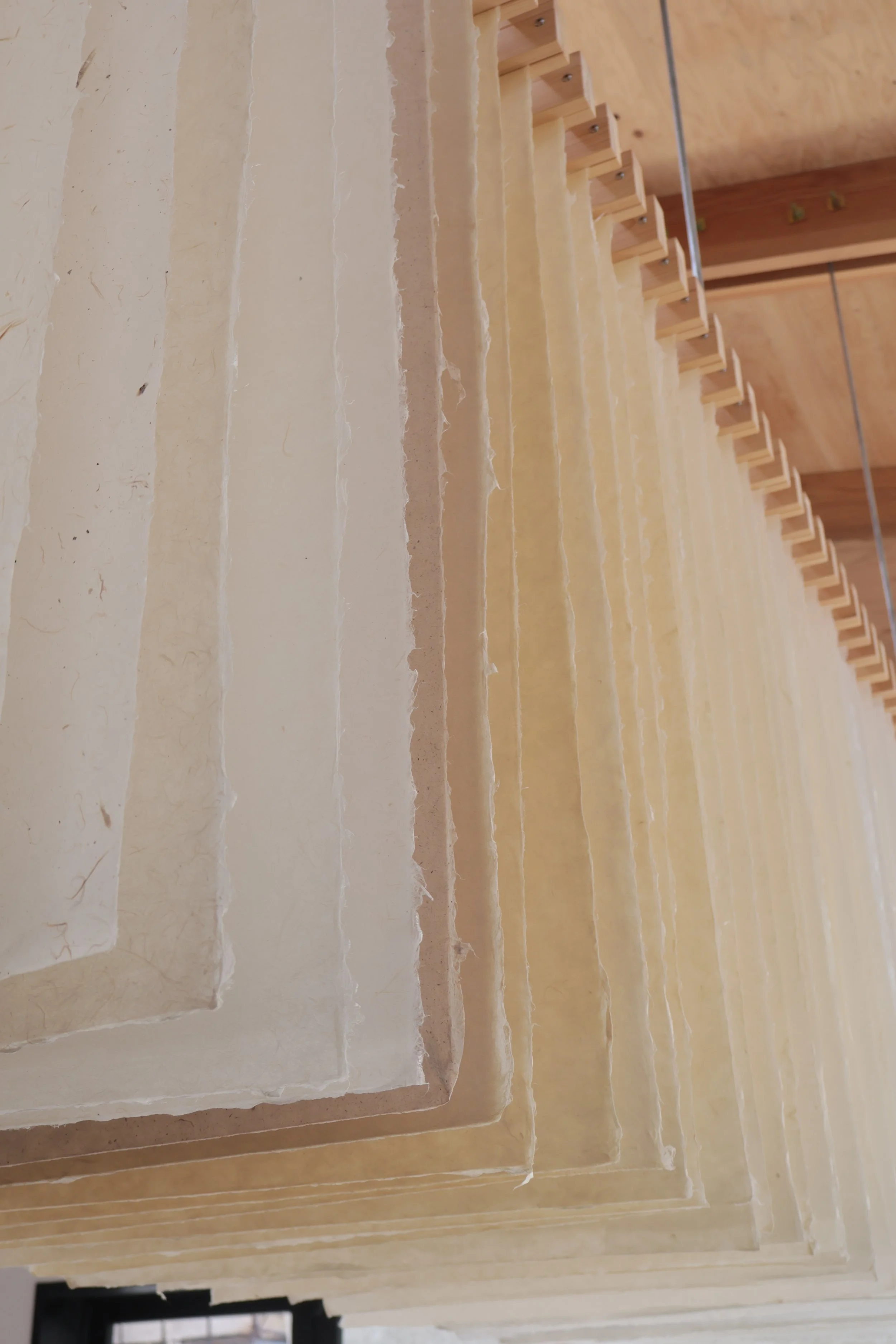 Adding a sculptural counterpoint, Gen Taniguchi's Kago series was made not from processed washi, but from the raw bark of the Kaji tree, the same trees his family had cultivated for generations. Using a technique inspired by traditional Japanese hariko craft, Gen allowed the natural fibres to form and hold shape without adhesives. The result was a raw yet poetic meditation on human connection to nature, echoing the cyclical beauty of the material itself.