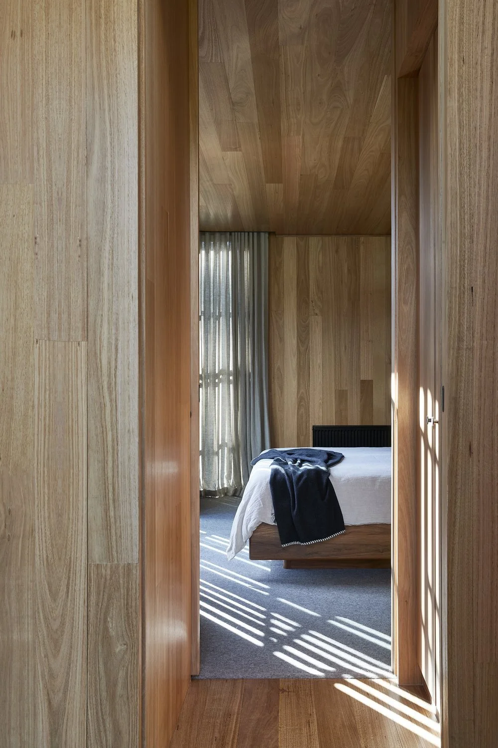 Inside, the interiors draw from both Scandinavian restraint and coastal familiarity. An elemental material palette of warm timber and soft neutral tones grounds the home, contrasting the recessive dark exterior. Open-plan living areas extend across the upper level of the new extension, immersed in dappled light and enveloped by treetop views. These elevated spaces reinterpret the original cottage’s deck – once the heart of the home – creating a continuous connection between past rituals and present-day living.