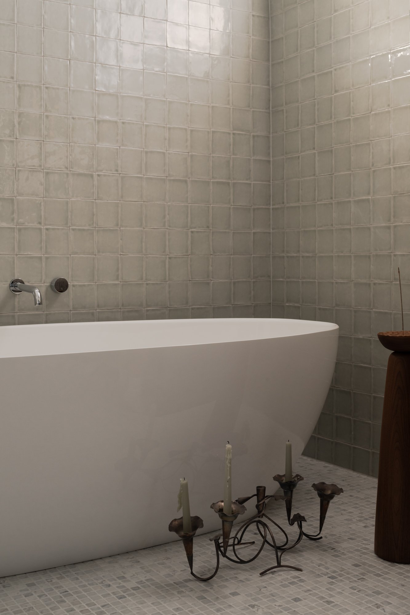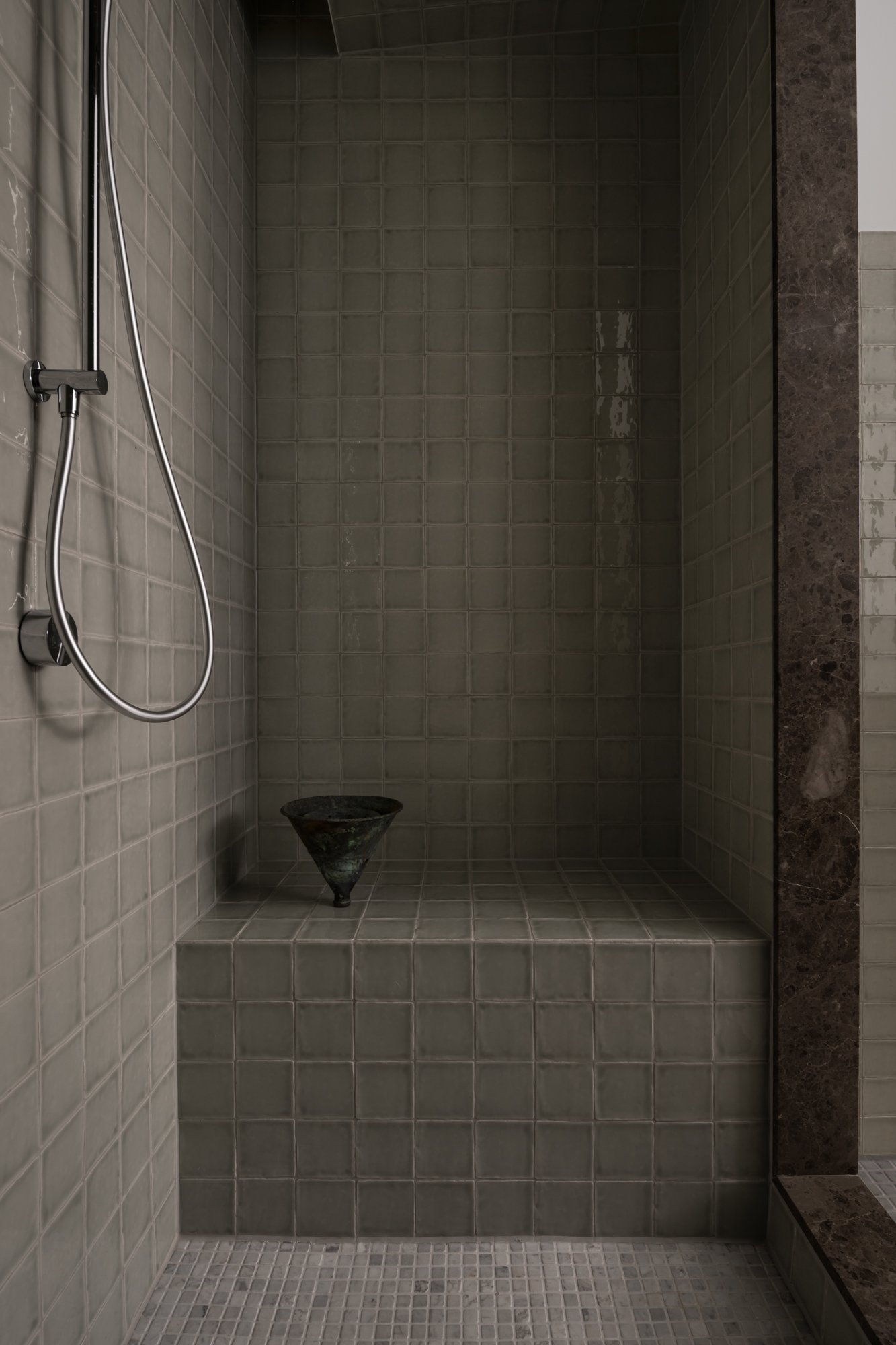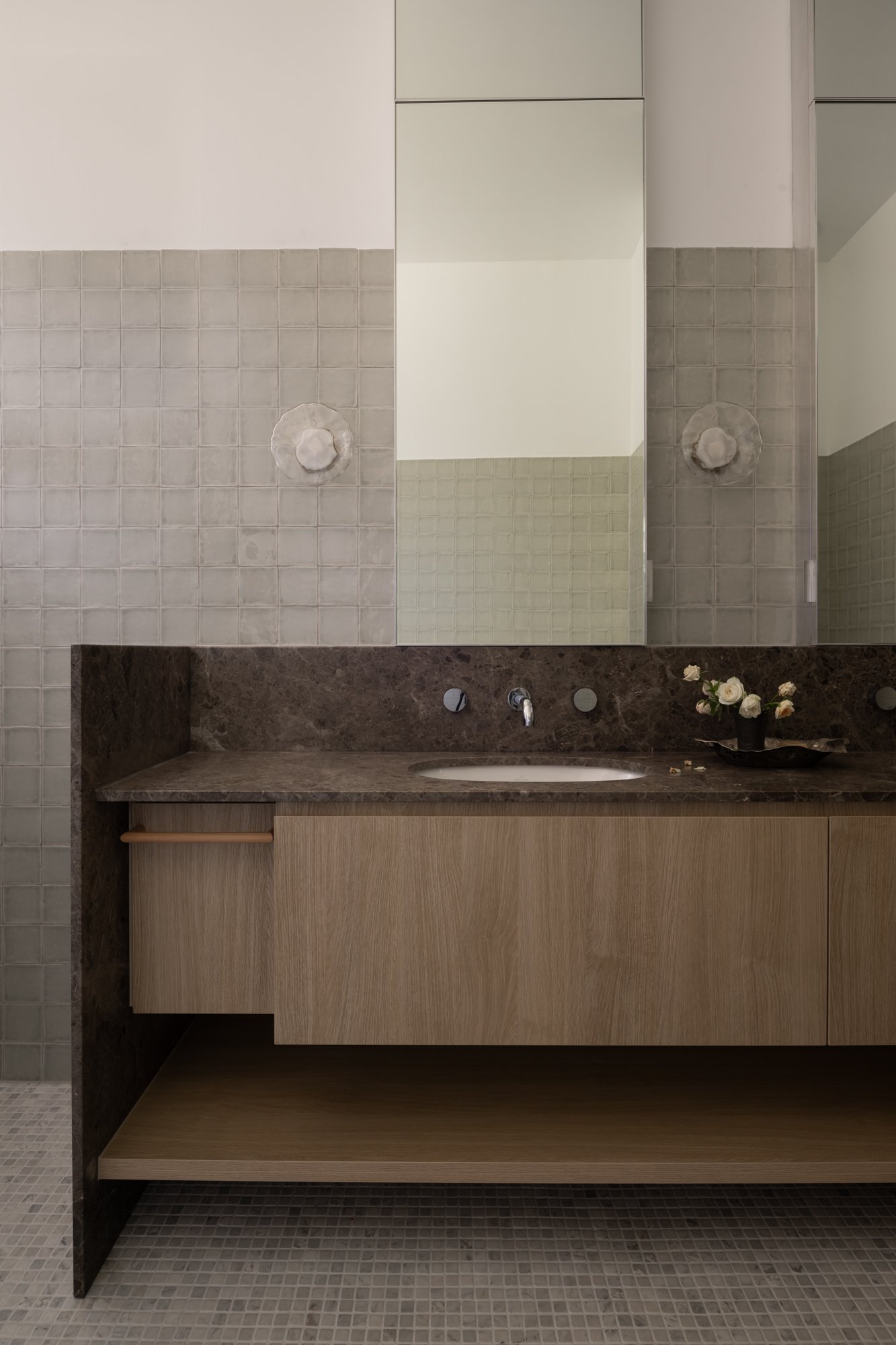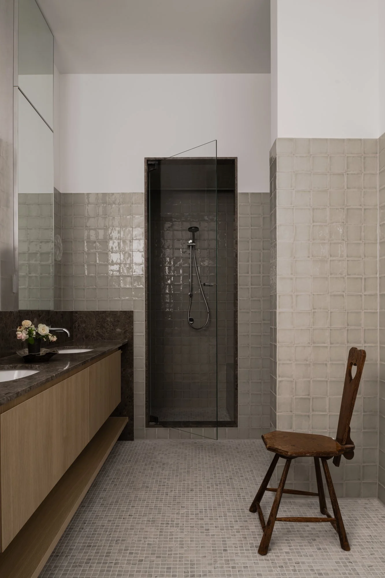 Materiality forms the backbone of the project's identity. Handmade grey-green tiles, with their glossy surfaces and shifting reflections, bring depth while echoing the silver and grey tones found elsewhere in the home. A honed grey marble vanity top anchors the ensuite, its natural veining offering quiet contrast to the clean geometry of the fittings. Mosaic floors enhance the tactile quality underfoot, while polished chrome fixtures introduce timeless elegance without visual excess.