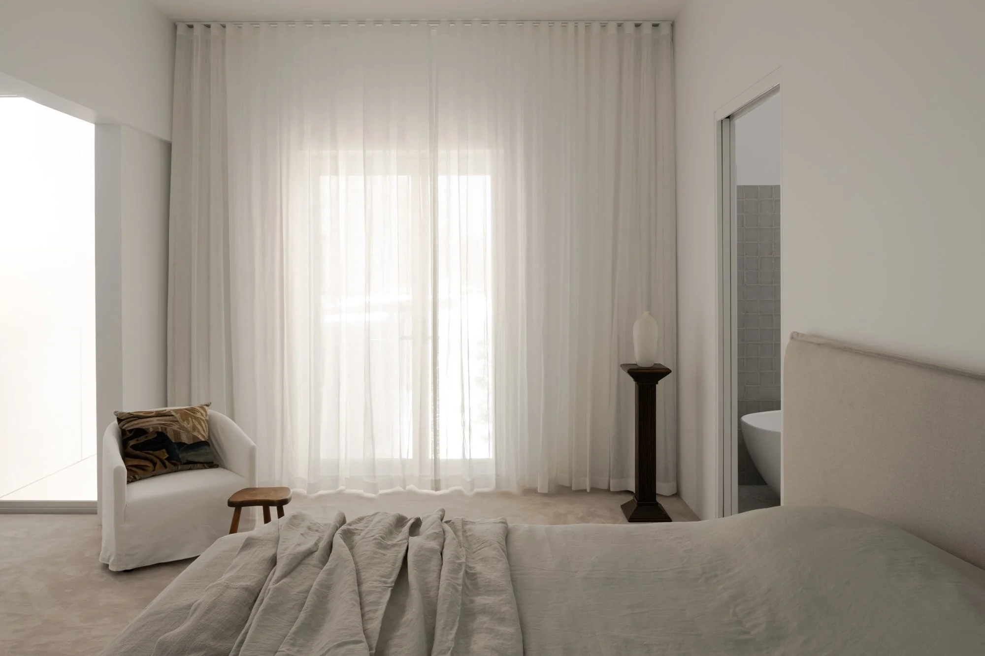 Softness is introduced through layered elements: sheer curtains diffuse daylight, oak joinery lends warmth to the ensemble, and custom metal accents articulate moments of refinement. Together, these interventions temper the home's inherent architectural rigour, softening its presence while maintaining a seamless dialogue with the existing aesthetic.