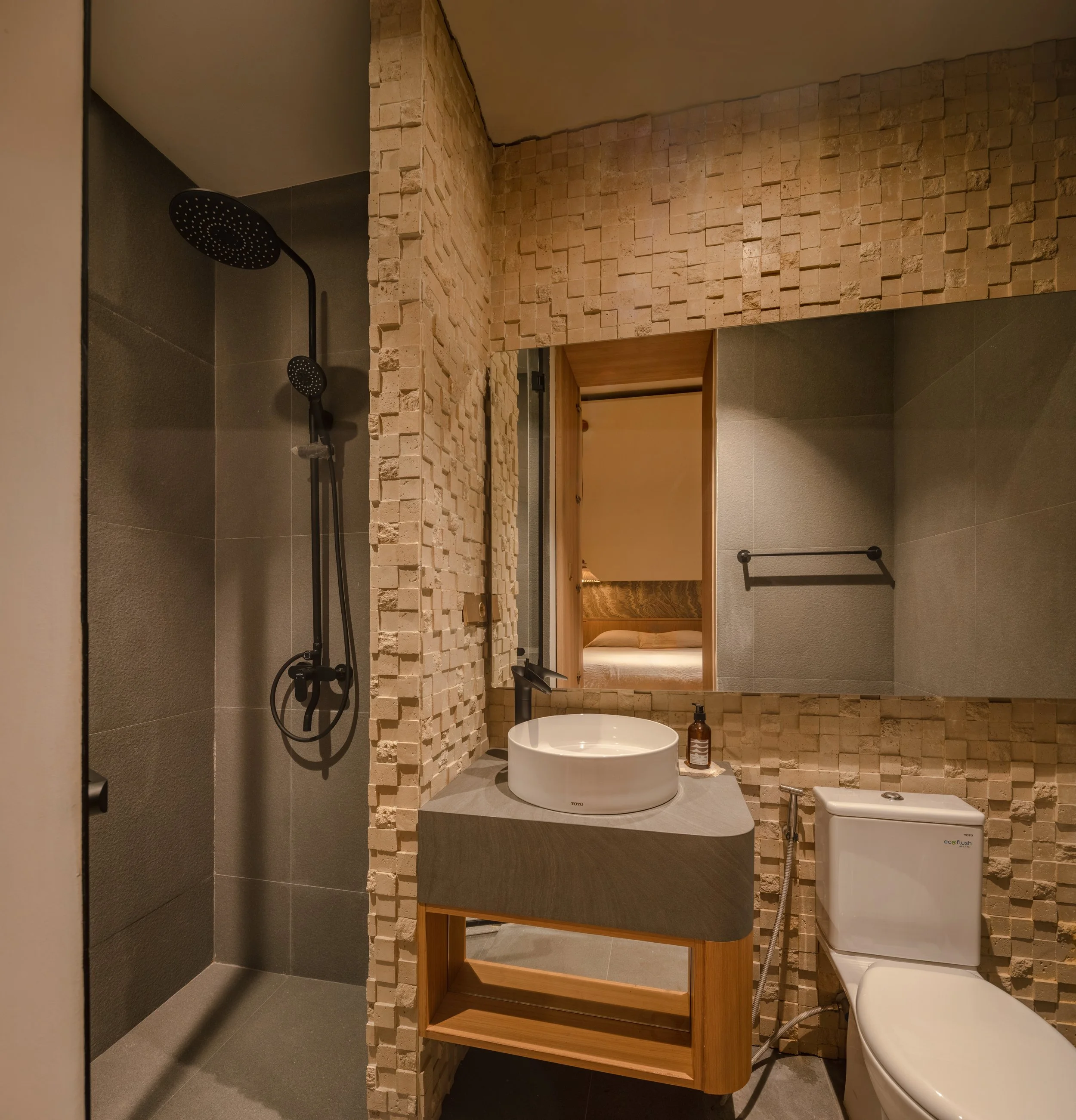 Conceived within the Sonar Homes collection and guided by the ethos of “Ukiyo” — a cherishing of the present — the interior expresses clarity of intent. Clean lines, natural textures and a neutral palette lay the foundation, while dark timber, vivid patterning and symbolic Batak motifs are layered with care. The effect is contemplative rather than decorative, aligning with wabi-sabi sensibilities and a preference for understatement.