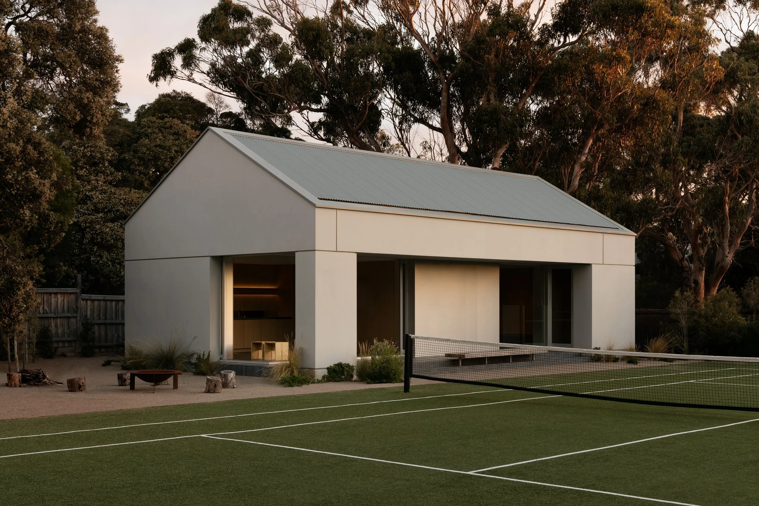 The program is modest but highly intentional: a sauna, jacuzzi, and a flexible communal area that adapts to varied use, from a peaceful post-tennis pause to a family wellness day. Each space is carefully composed to encourage introspection, while remaining grounded in functionality. The bathhouse resists extravagance in favour of durability and quiet richness, employing a restrained palette of bluestone, concrete, and moisture-resistant timber to withstand its coastal setting.