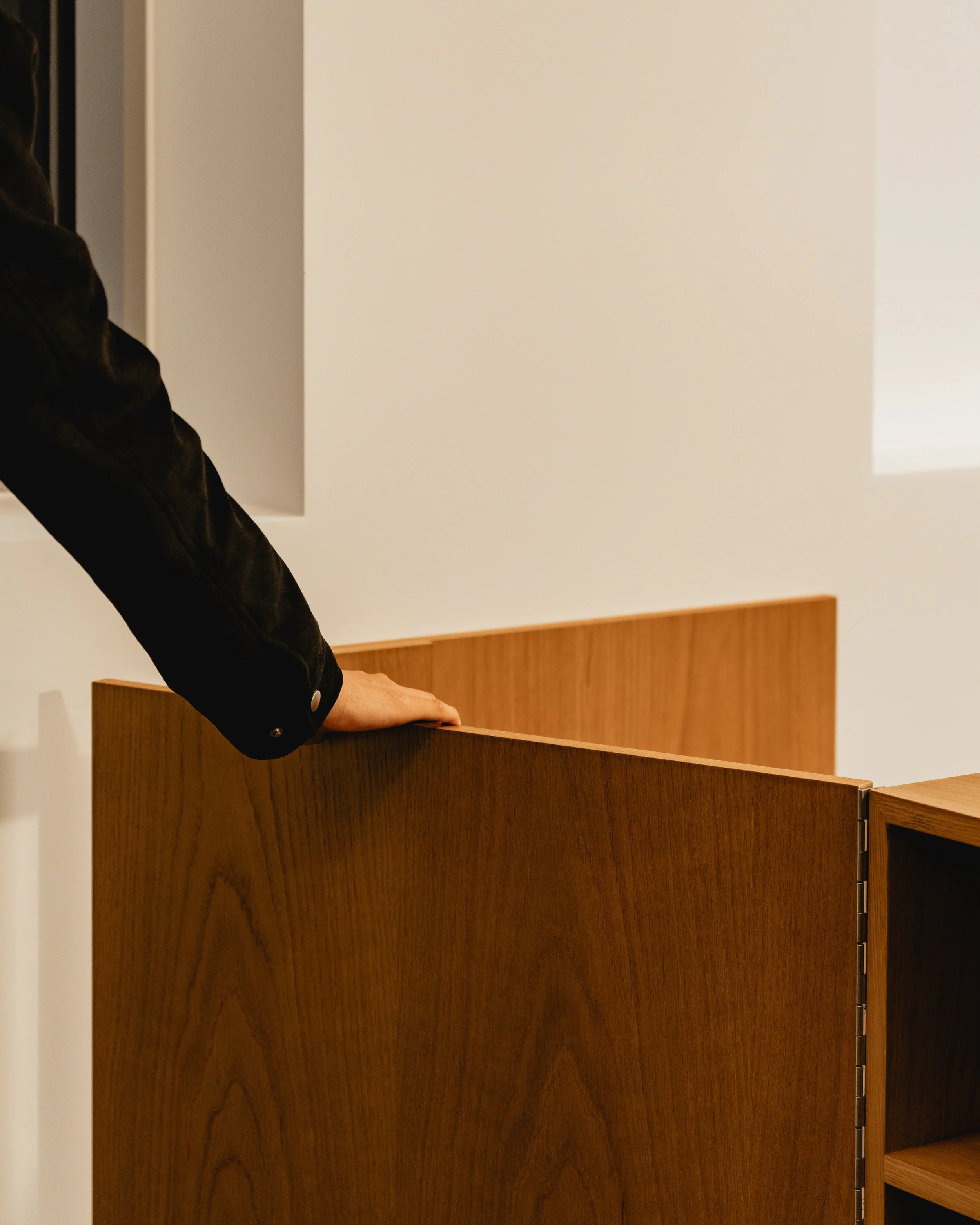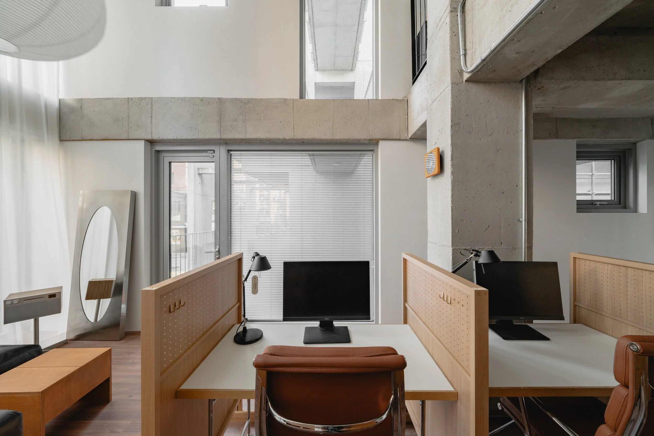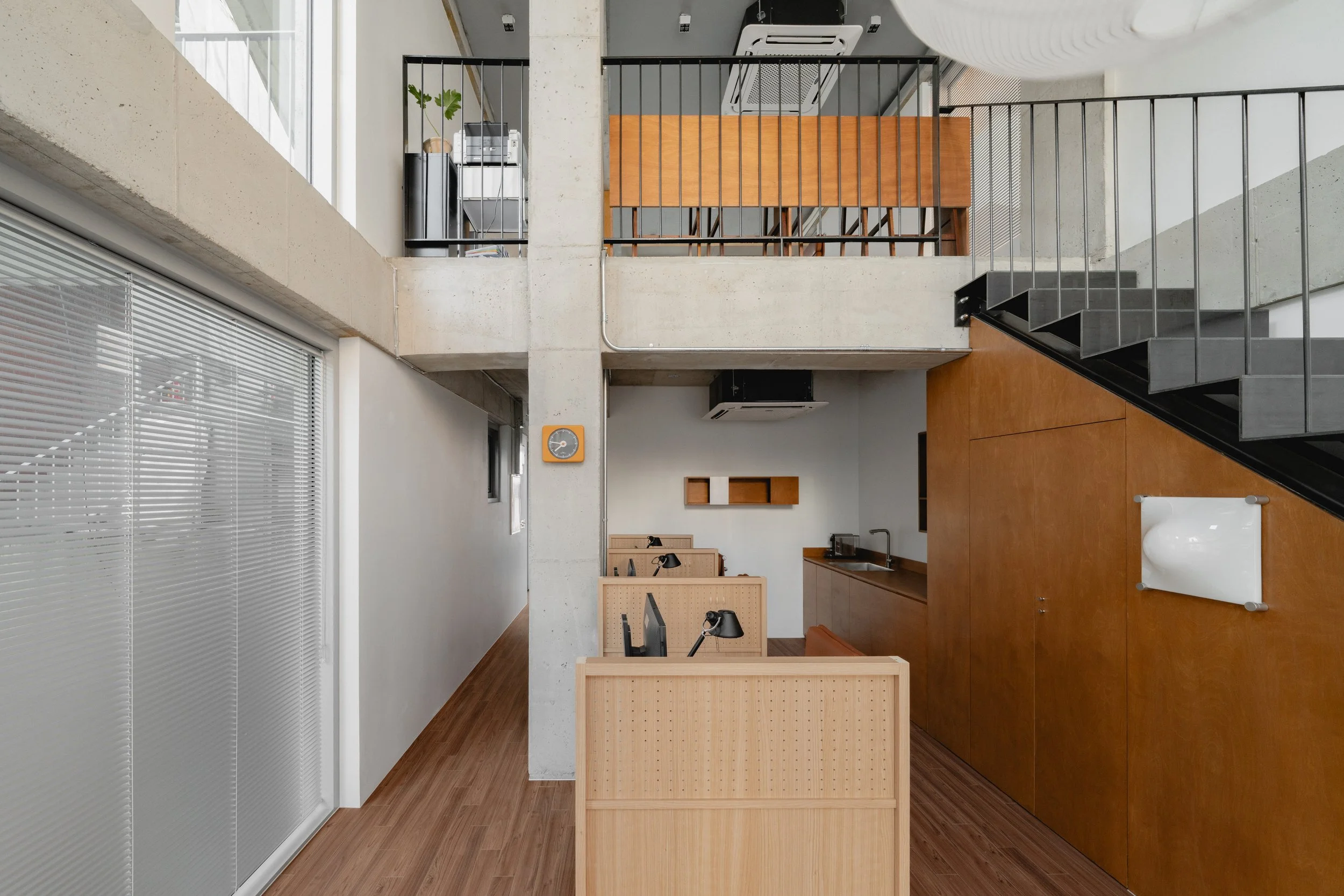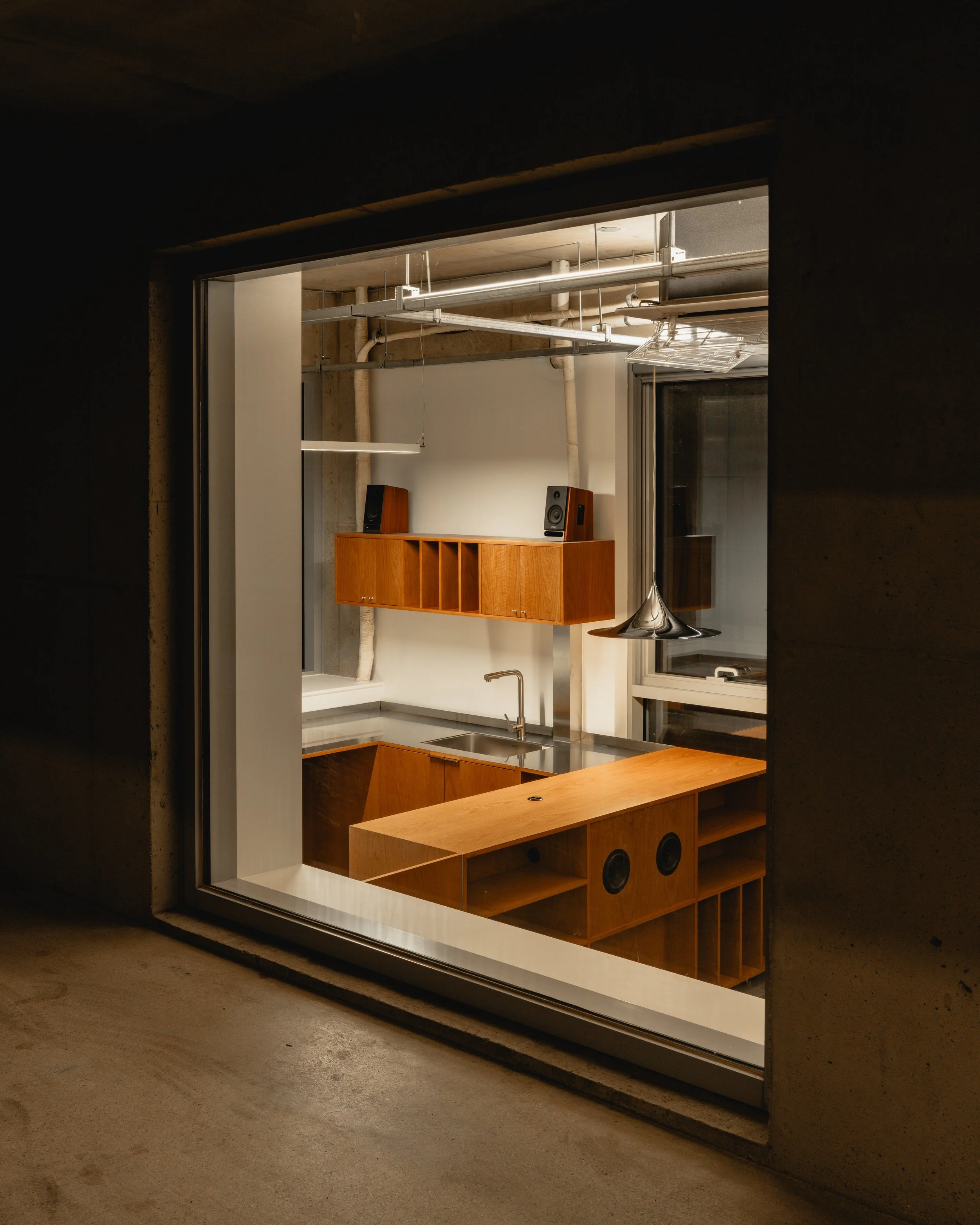 Workspaces are organized with custom pegboard partitions that provide a balance of privacy and permeability. Their modular nature supports the day-to-day needs of a production team, allowing tools, cables, and notes to be easily accommodated without visual clutter. A compact pantry is tucked beneath the staircase, using the same joinery language to form an efficient coffee nook with sink and shelving, maximizing vertical volume while keeping the footprint minimal.