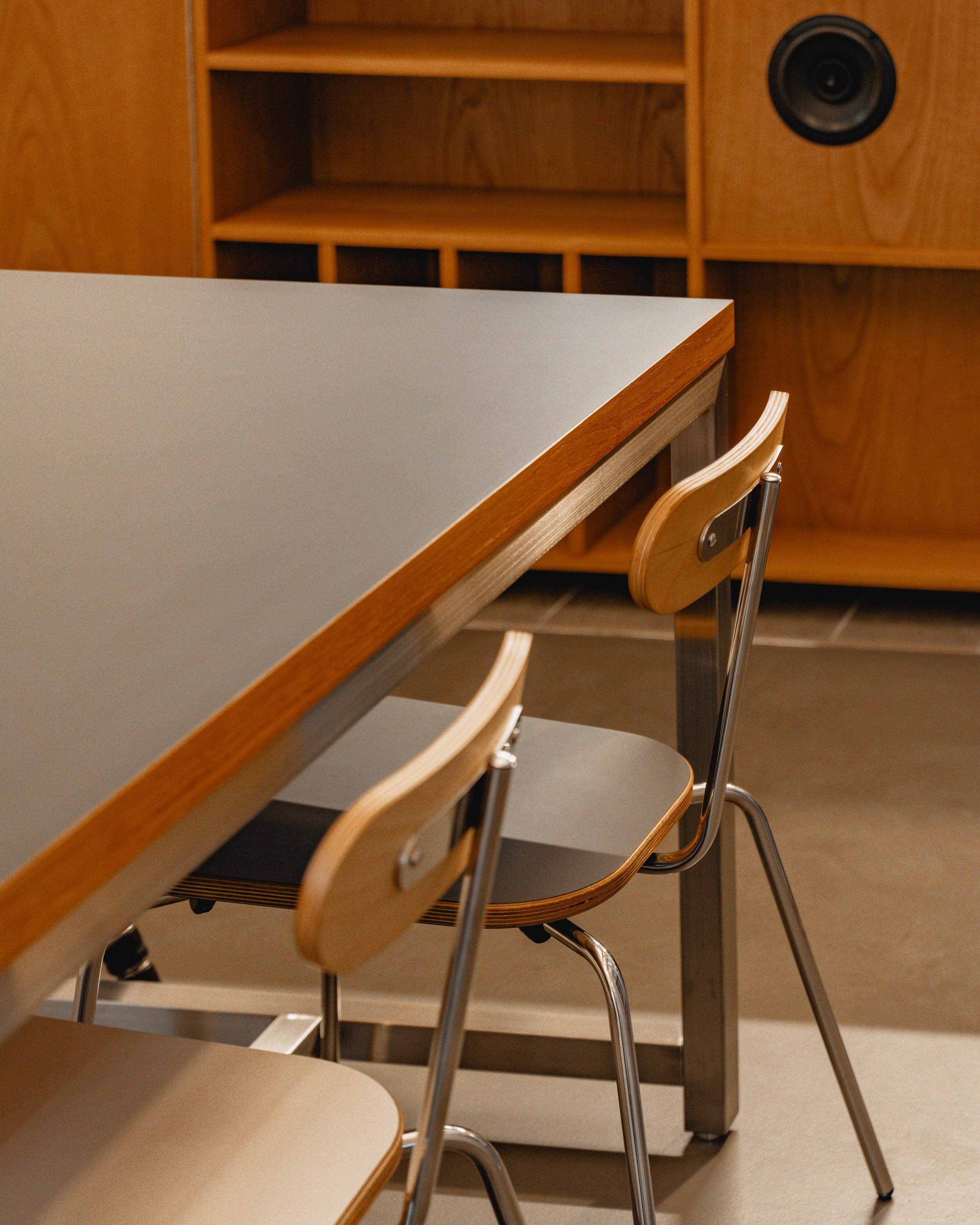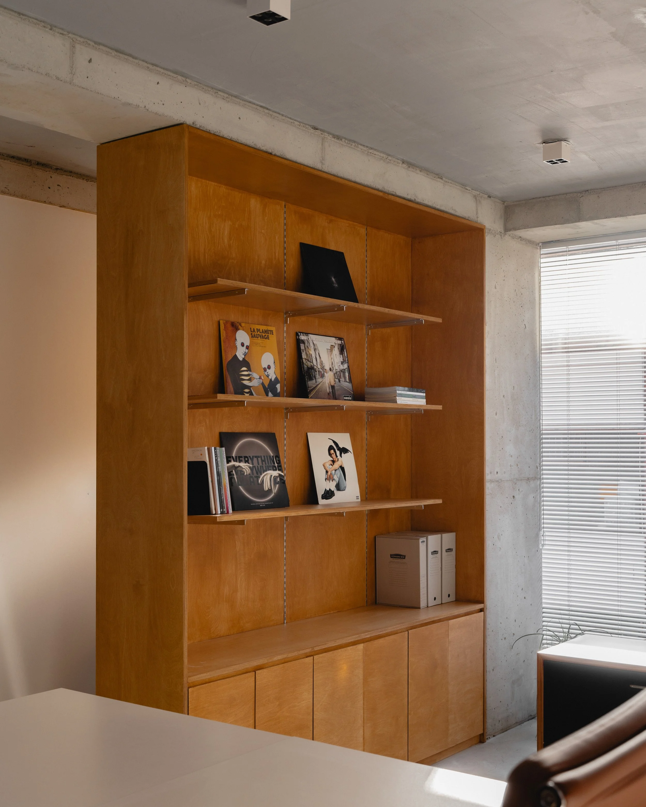 On the top level, the tone shifts toward focused work and operational oversight. A private workspace features floor-to-ceiling timber shelving, including space for a vinyl collection, adding a cultural layer to an otherwise pared-back setting. A heavy black desk grounds the room, while carefully chosen furnishings, including tan leather chairs and a leaning stainless steel mirror, bring mid-century cues and a subtle retro-futurist edge without compromising the interior’s clarity.