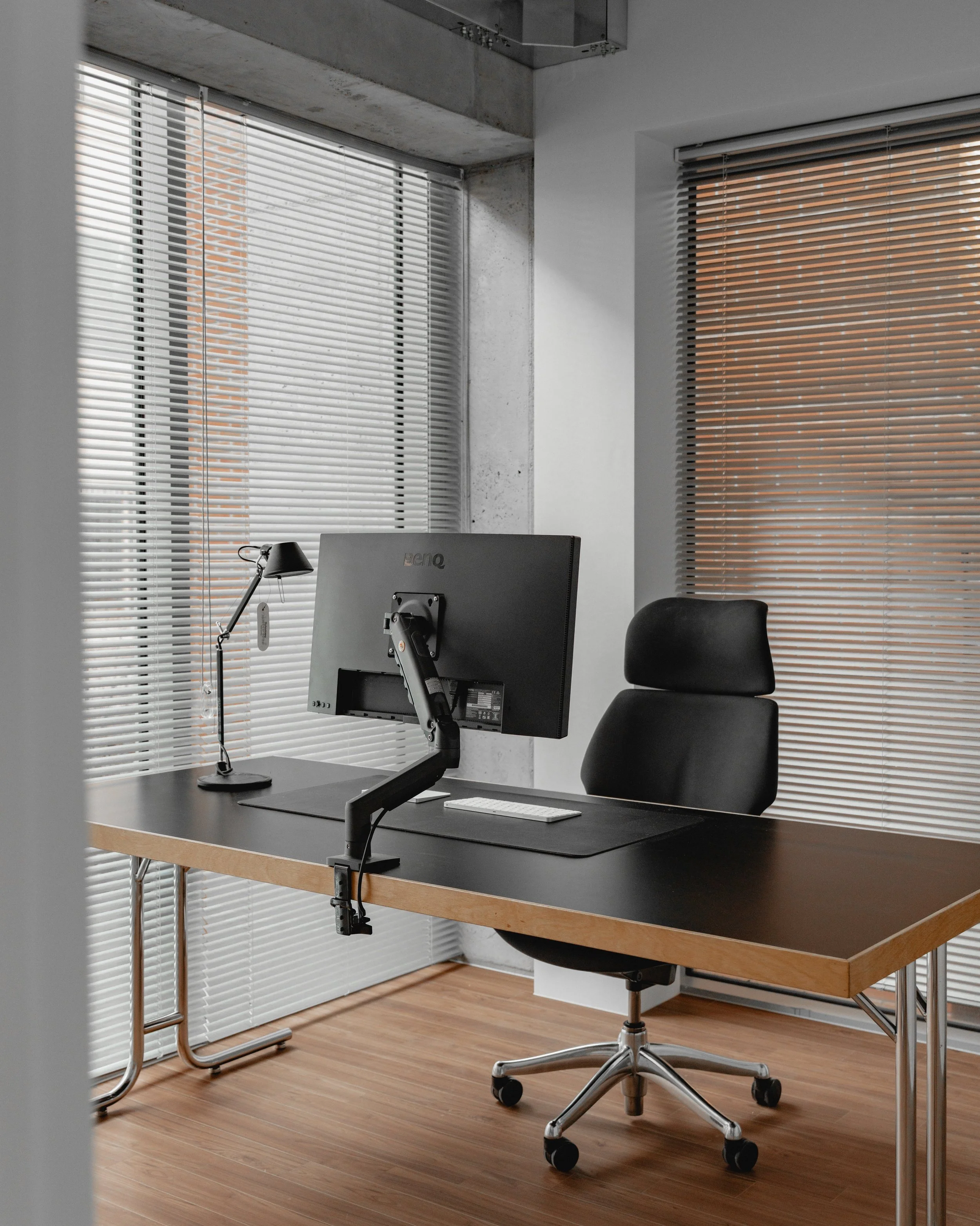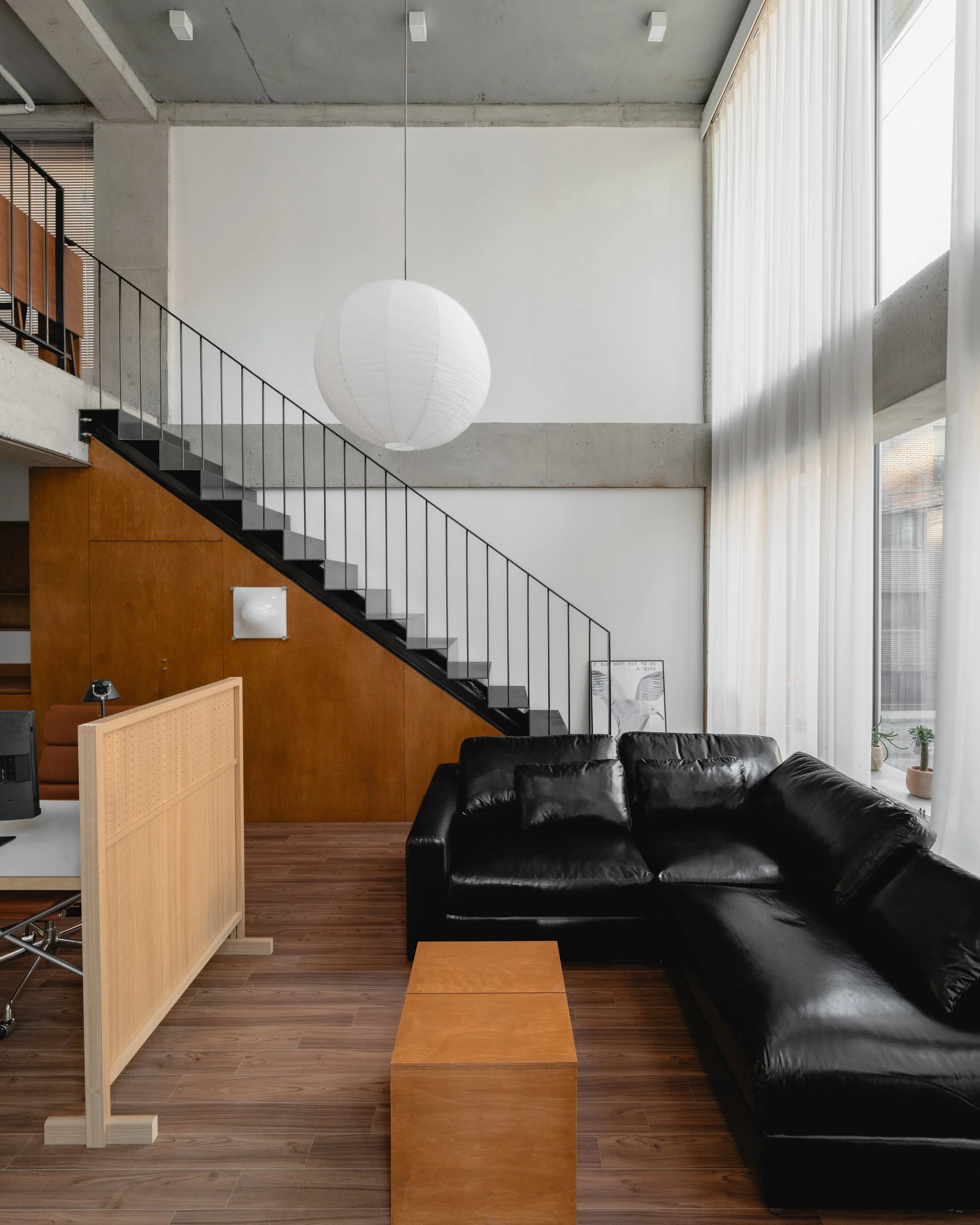 Moving upward, the upper levels introduce more openness and softer atmospheres without losing the project’s disciplined material language. A dramatic double-height void expands the second-floor volume, creating a shared spatial anchor that brings light deeper into the plan. Suspended within this void, a large paper lantern casts diffuse illumination that tempers the concrete and steel. A black metal staircase cuts through the interior as a sharp, graphic element, its slender vertical spindles emphasizing precision and vertical movement. Nearby, a lounge zone with a black leather sectional creates an informal break area, with sheer full-height curtains filtering daylight and softening the perimeter glazing.